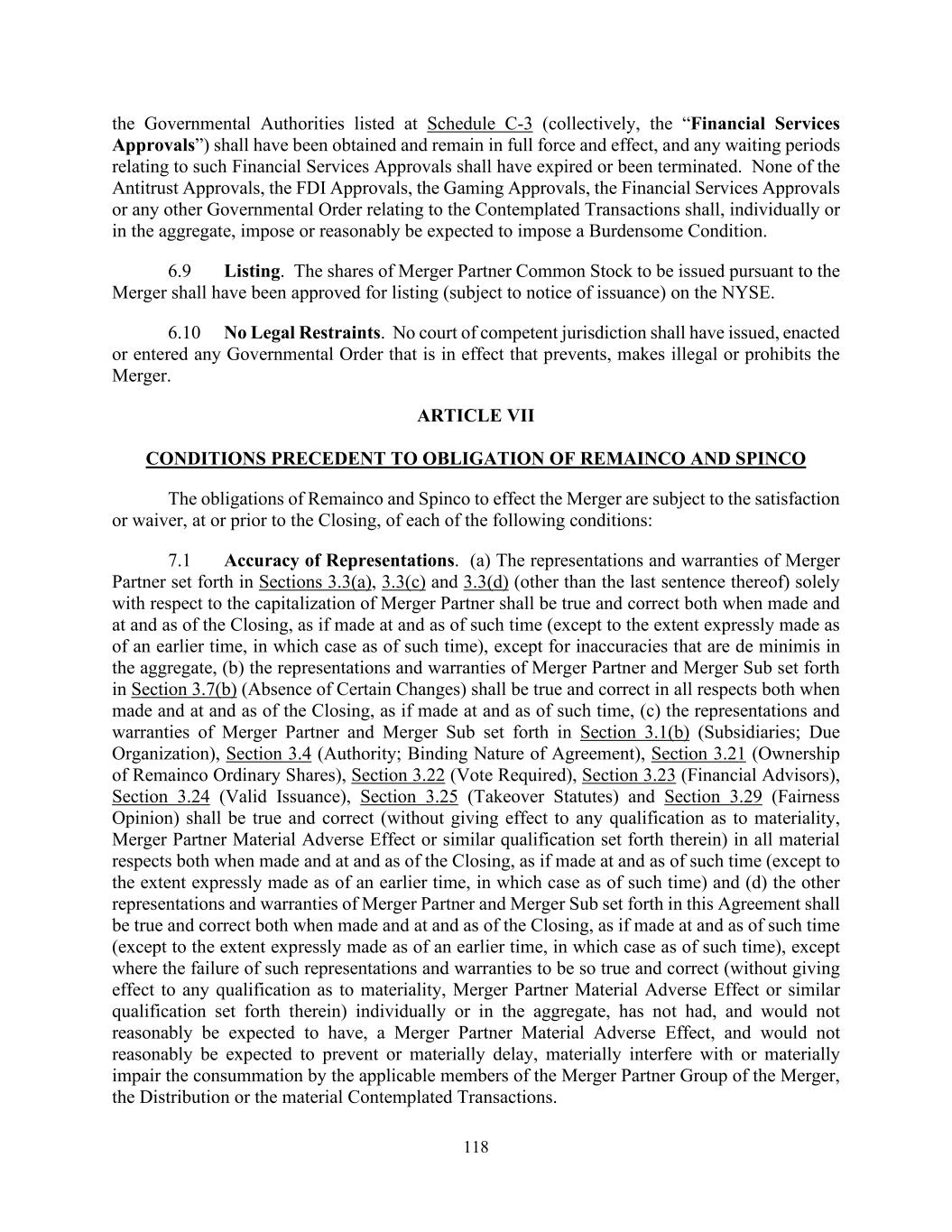 118 the Governmental Authorities listed at Schedule C-3 (collectively, the “Financial Services Approvals”) shall have been obtained and remain in full force and effect, and any waiting periods relating to such Financial Services Approvals shall have expired or been terminated. None of the Antitrust Approvals, the FDI Approvals, the Gaming Approvals, the Financial Services Approvals or any other Governmental Order relating to the Contemplated Transactions shall, individually or in the aggregate, impose or reasonably be expected to impose a Burdensome Condition. 6.9 Listing. The shares of Merger Partner Common Stock to be issued pursuant to the Merger shall have been approved for listing (subject to notice of issuance) on the NYSE. 6.10 No Legal Restraints. No court of competent jurisdiction shall have issued, enacted or entered any Governmental Order that is in effect that prevents, makes illegal or prohibits the Merger. ARTICLE VII CONDITIONS PRECEDENT TO OBLIGATION OF REMAINCO AND SPINCO The obligations of Remainco and Spinco to effect the Merger are subject to the satisfaction or waiver, at or prior to the Closing, of each of the following conditions: 7.1 Accuracy of Representations. (a) The representations and warranties of Merger Partner set forth in Sections 3.3(a), 3.3(c) and 3.3(d) (other than the last sentence thereof) solely with respect to the capitalization of Merger Partner shall be true and correct both when made and at and as of the Closing, as if made at and as of such time (except to the extent expressly made as of an earlier time, in which case as of such time), except for inaccuracies that are de minimis in the aggregate, (b) the representations and warranties of Merger Partner and Merger Sub set forth in Section 3.7(b) (Absence of Certain Changes) shall be true and correct in all respects both when made and at and as of the Closing, as if made at and as of such time, (c) the representations and warranties of Merger Partner and Merger Sub set forth in Section 3.1(b) (Subsidiaries; Due Organization), Section 3.4 (Authority; Binding Nature of Agreement), Section 3.21 (Ownership of Remainco Ordinary Shares), Section 3.22 (Vote Required), Section 3.23 (Financial Advisors), Section 3.24 (Valid Issuance), Section 3.25 (Takeover Statutes) and Section 3.29 (Fairness Opinion) shall be true and correct (without giving effect to any qualification as to materiality, Merger Partner Material Adverse Effect or similar qualification set forth therein) in all material respects both when made and at and as of the Closing, as if made at and as of such time (except to the extent expressly made as of an earlier time, in which case as of such time) and (d) the other representations and warranties of Merger Partner and Merger Sub set forth in this Agreement shall be true and correct both when made and at and as of the Closing, as if made at and as of such time (except to the extent expressly made as of an earlier time, in which case as of such time), except where the failure of such representations and warranties to be so true and correct (without giving effect to any qualification as to materiality, Merger Partner Material Adverse Effect or similar qualification set forth therein) individually or in the aggregate, has not had, and would not reasonably be expected to have, a Merger Partner Material Adverse Effect, and would not reasonably be expected to prevent or materially delay, materially interfere with or materially impair the consummation by the applicable members of the Merger Partner Group of the Merger, the Distribution or the material Contemplated Transactions.