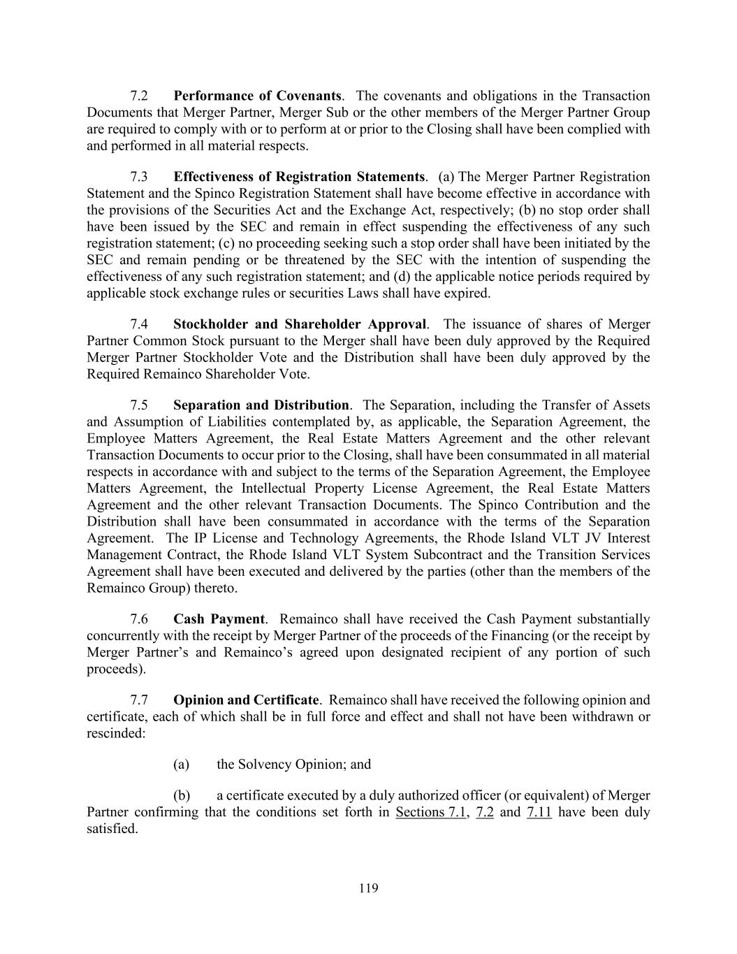 119 7.2 Performance of Covenants. The covenants and obligations in the Transaction Documents that Merger Partner, Merger Sub or the other members of the Merger Partner Group are required to comply with or to perform at or prior to the Closing shall have been complied with and performed in all material respects. 7.3 Effectiveness of Registration Statements. (a) The Merger Partner Registration Statement and the Spinco Registration Statement shall have become effective in accordance with the provisions of the Securities Act and the Exchange Act, respectively; (b) no stop order shall have been issued by the SEC and remain in effect suspending the effectiveness of any such registration statement; (c) no proceeding seeking such a stop order shall have been initiated by the SEC and remain pending or be threatened by the SEC with the intention of suspending the effectiveness of any such registration statement; and (d) the applicable notice periods required by applicable stock exchange rules or securities Laws shall have expired. 7.4 Stockholder and Shareholder Approval. The issuance of shares of Merger Partner Common Stock pursuant to the Merger shall have been duly approved by the Required Merger Partner Stockholder Vote and the Distribution shall have been duly approved by the Required Remainco Shareholder Vote. 7.5 Separation and Distribution. The Separation, including the Transfer of Assets and Assumption of Liabilities contemplated by, as applicable, the Separation Agreement, the Employee Matters Agreement, the Real Estate Matters Agreement and the other relevant Transaction Documents to occur prior to the Closing, shall have been consummated in all material respects in accordance with and subject to the terms of the Separation Agreement, the Employee Matters Agreement, the Intellectual Property License Agreement, the Real Estate Matters Agreement and the other relevant Transaction Documents. The Spinco Contribution and the Distribution shall have been consummated in accordance with the terms of the Separation Agreement. The IP License and Technology Agreements, the Rhode Island VLT JV Interest Management Contract, the Rhode Island VLT System Subcontract and the Transition Services Agreement shall have been executed and delivered by the parties (other than the members of the Remainco Group) thereto. 7.6 Cash Payment. Remainco shall have received the Cash Payment substantially concurrently with the receipt by Merger Partner of the proceeds of the Financing (or the receipt by Merger Partner’s and Remainco’s agreed upon designated recipient of any portion of such proceeds). 7.7 Opinion and Certificate. Remainco shall have received the following opinion and certificate, each of which shall be in full force and effect and shall not have been withdrawn or rescinded: (a) the Solvency Opinion; and (b) a certificate executed by a duly authorized officer (or equivalent) of Merger Partner confirming that the conditions set forth in Sections 7.1, 7.2 and 7.11 have been duly satisfied.