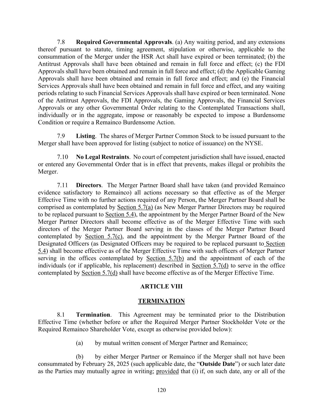 120 7.8 Required Governmental Approvals. (a) Any waiting period, and any extensions thereof pursuant to statute, timing agreement, stipulation or otherwise, applicable to the consummation of the Merger under the HSR Act shall have expired or been terminated; (b) the Antitrust Approvals shall have been obtained and remain in full force and effect; (c) the FDI Approvals shall have been obtained and remain in full force and effect; (d) the Applicable Gaming Approvals shall have been obtained and remain in full force and effect; and (e) the Financial Services Approvals shall have been obtained and remain in full force and effect, and any waiting periods relating to such Financial Services Approvals shall have expired or been terminated. None of the Antitrust Approvals, the FDI Approvals, the Gaming Approvals, the Financial Services Approvals or any other Governmental Order relating to the Contemplated Transactions shall, individually or in the aggregate, impose or reasonably be expected to impose a Burdensome Condition or require a Remainco Burdensome Action. 7.9 Listing. The shares of Merger Partner Common Stock to be issued pursuant to the Merger shall have been approved for listing (subject to notice of issuance) on the NYSE. 7.10 No Legal Restraints. No court of competent jurisdiction shall have issued, enacted or entered any Governmental Order that is in effect that prevents, makes illegal or prohibits the Merger. 7.11 Directors. The Merger Partner Board shall have taken (and provided Remainco evidence satisfactory to Remainco) all actions necessary so that effective as of the Merger Effective Time with no further actions required of any Person, the Merger Partner Board shall be comprised as contemplated by Section 5.7(a) (as New Merger Partner Directors may be required to be replaced pursuant to Section 5.4), the appointment by the Merger Partner Board of the New Merger Partner Directors shall become effective as of the Merger Effective Time with such directors of the Merger Partner Board serving in the classes of the Merger Partner Board contemplated by Section 5.7(c), and the appointment by the Merger Partner Board of the Designated Officers (as Designated Officers may be required to be replaced pursuant to Section 5.4) shall become effective as of the Merger Effective Time with such officers of Merger Partner serving in the offices contemplated by Section 5.7(b) and the appointment of each of the individuals (or if applicable, his replacement) described in Section 5.7(d) to serve in the office contemplated by Section 5.7(d) shall have become effective as of the Merger Effective Time. ARTICLE VIII TERMINATION 8.1 Termination. This Agreement may be terminated prior to the Distribution Effective Time (whether before or after the Required Merger Partner Stockholder Vote or the Required Remainco Shareholder Vote, except as otherwise provided below): (a) by mutual written consent of Merger Partner and Remainco; (b) by either Merger Partner or Remainco if the Merger shall not have been consummated by February 28, 2025 (such applicable date, the “Outside Date”) or such later date as the Parties may mutually agree in writing; provided that (i) if, on such date, any or all of the