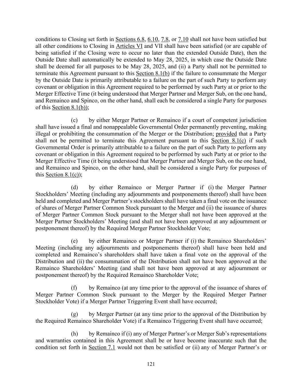 121 conditions to Closing set forth in Sections 6.8, 6.10, 7.8, or 7.10 shall not have been satisfied but all other conditions to Closing in Articles VI and VII shall have been satisfied (or are capable of being satisfied if the Closing were to occur no later than the extended Outside Date), then the Outside Date shall automatically be extended to May 28, 2025, in which case the Outside Date shall be deemed for all purposes to be May 28, 2025, and (ii) a Party shall not be permitted to terminate this Agreement pursuant to this Section 8.1(b) if the failure to consummate the Merger by the Outside Date is primarily attributable to a failure on the part of such Party to perform any covenant or obligation in this Agreement required to be performed by such Party at or prior to the Merger Effective Time (it being understood that Merger Partner and Merger Sub, on the one hand, and Remainco and Spinco, on the other hand, shall each be considered a single Party for purposes of this Section 8.1(b)); (c) by either Merger Partner or Remainco if a court of competent jurisdiction shall have issued a final and nonappealable Governmental Order permanently preventing, making illegal or prohibiting the consummation of the Merger or the Distribution; provided that a Party shall not be permitted to terminate this Agreement pursuant to this Section 8.1(c) if such Governmental Order is primarily attributable to a failure on the part of such Party to perform any covenant or obligation in this Agreement required to be performed by such Party at or prior to the Merger Effective Time (it being understood that Merger Partner and Merger Sub, on the one hand, and Remainco and Spinco, on the other hand, shall be considered a single Party for purposes of this Section 8.1(c)); (d) by either Remainco or Merger Partner if (i) the Merger Partner Stockholders’ Meeting (including any adjournments and postponements thereof) shall have been held and completed and Merger Partner’s stockholders shall have taken a final vote on the issuance of shares of Merger Partner Common Stock pursuant to the Merger and (ii) the issuance of shares of Merger Partner Common Stock pursuant to the Merger shall not have been approved at the Merger Partner Stockholders’ Meeting (and shall not have been approved at any adjournment or postponement thereof) by the Required Merger Partner Stockholder Vote; (e) by either Remainco or Merger Partner if (i) the Remainco Shareholders’ Meeting (including any adjournments and postponements thereof) shall have been held and completed and Remainco’s shareholders shall have taken a final vote on the approval of the Distribution and (ii) the consummation of the Distribution shall not have been approved at the Remainco Shareholders’ Meeting (and shall not have been approved at any adjournment or postponement thereof) by the Required Remainco Shareholder Vote; (f) by Remainco (at any time prior to the approval of the issuance of shares of Merger Partner Common Stock pursuant to the Merger by the Required Merger Partner Stockholder Vote) if a Merger Partner Triggering Event shall have occurred; (g) by Merger Partner (at any time prior to the approval of the Distribution by the Required Remainco Shareholder Vote) if a Remainco Triggering Event shall have occurred; (h) by Remainco if (i) any of Merger Partner’s or Merger Sub’s representations and warranties contained in this Agreement shall be or have become inaccurate such that the condition set forth in Section 7.1 would not then be satisfied or (ii) any of Merger Partner’s or