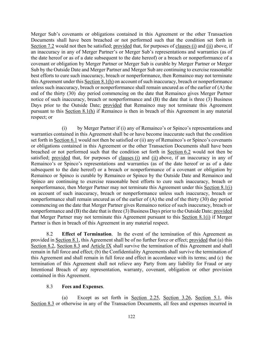 122 Merger Sub’s covenants or obligations contained in this Agreement or the other Transaction Documents shall have been breached or not performed such that the condition set forth in Section 7.2 would not then be satisfied; provided that, for purposes of clauses (i) and (ii) above, if an inaccuracy in any of Merger Partner’s or Merger Sub’s representations and warranties (as of the date hereof or as of a date subsequent to the date hereof) or a breach or nonperformance of a covenant or obligation by Merger Partner or Merger Sub is curable by Merger Partner or Merger Sub by the Outside Date and Merger Partner and Merger Sub are continuing to exercise reasonable best efforts to cure such inaccuracy, breach or nonperformance, then Remainco may not terminate this Agreement under this Section 8.1(h) on account of such inaccuracy, breach or nonperformance unless such inaccuracy, breach or nonperformance shall remain uncured as of the earlier of (A) the end of the thirty (30) day period commencing on the date that Remainco gives Merger Partner notice of such inaccuracy, breach or nonperformance and (B) the date that is three (3) Business Days prior to the Outside Date; provided that Remainco may not terminate this Agreement pursuant to this Section 8.1(h) if Remainco is then in breach of this Agreement in any material respect; or (i) by Merger Partner if (i) any of Remainco’s or Spinco’s representations and warranties contained in this Agreement shall be or have become inaccurate such that the condition set forth in Section 6.1 would not then be satisfied or (ii) any of Remainco’s or Spinco’s covenants or obligations contained in this Agreement or the other Transaction Documents shall have been breached or not performed such that the condition set forth in Section 6.2 would not then be satisfied; provided that, for purposes of clauses (i) and (ii) above, if an inaccuracy in any of Remainco’s or Spinco’s representations and warranties (as of the date hereof or as of a date subsequent to the date hereof) or a breach or nonperformance of a covenant or obligation by Remainco or Spinco is curable by Remainco or Spinco by the Outside Date and Remainco and Spinco are continuing to exercise reasonable best efforts to cure such inaccuracy, breach or nonperformance, then Merger Partner may not terminate this Agreement under this Section 8.1(i) on account of such inaccuracy, breach or nonperformance unless such inaccuracy, breach or nonperformance shall remain uncured as of the earlier of (A) the end of the thirty (30) day period commencing on the date that Merger Partner gives Remainco notice of such inaccuracy, breach or nonperformance and (B) the date that is three (3) Business Days prior to the Outside Date; provided that Merger Partner may not terminate this Agreement pursuant to this Section 8.1(i) if Merger Partner is then in breach of this Agreement in any material respect. 8.2 Effect of Termination. In the event of the termination of this Agreement as provided in Section 8.1, this Agreement shall be of no further force or effect; provided that (a) this Section 8.2, Section 8.3 and Article IX shall survive the termination of this Agreement and shall remain in full force and effect; (b) the Confidentiality Agreements shall survive the termination of this Agreement and shall remain in full force and effect in accordance with its terms; and (c) the termination of this Agreement shall not relieve any Party from any liability for Fraud or any Intentional Breach of any representation, warranty, covenant, obligation or other provision contained in this Agreement. 8.3 Fees and Expenses. (a) Except as set forth in Section 2.25, Section 3.26, Section 5.1, this Section 8.3 or otherwise in any of the Transaction Documents, all fees and expenses incurred in