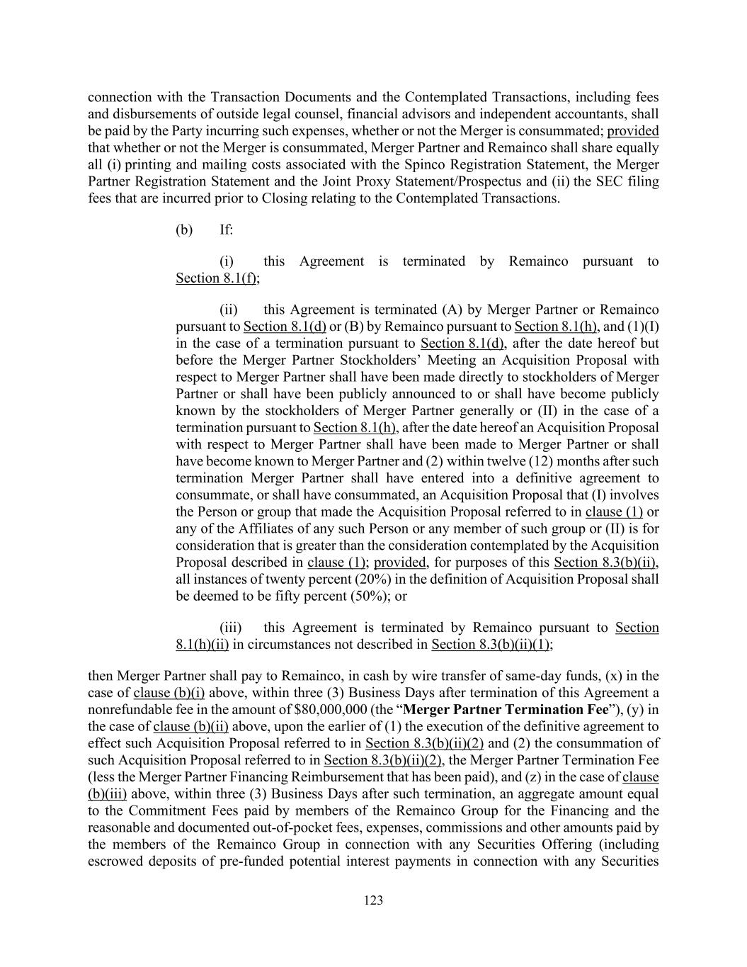 123 connection with the Transaction Documents and the Contemplated Transactions, including fees and disbursements of outside legal counsel, financial advisors and independent accountants, shall be paid by the Party incurring such expenses, whether or not the Merger is consummated; provided that whether or not the Merger is consummated, Merger Partner and Remainco shall share equally all (i) printing and mailing costs associated with the Spinco Registration Statement, the Merger Partner Registration Statement and the Joint Proxy Statement/Prospectus and (ii) the SEC filing fees that are incurred prior to Closing relating to the Contemplated Transactions. (b) If: (i) this Agreement is terminated by Remainco pursuant to Section 8.1(f); (ii) this Agreement is terminated (A) by Merger Partner or Remainco pursuant to Section 8.1(d) or (B) by Remainco pursuant to Section 8.1(h), and (1)(I) in the case of a termination pursuant to Section 8.1(d), after the date hereof but before the Merger Partner Stockholders’ Meeting an Acquisition Proposal with respect to Merger Partner shall have been made directly to stockholders of Merger Partner or shall have been publicly announced to or shall have become publicly known by the stockholders of Merger Partner generally or (II) in the case of a termination pursuant to Section 8.1(h), after the date hereof an Acquisition Proposal with respect to Merger Partner shall have been made to Merger Partner or shall have become known to Merger Partner and (2) within twelve (12) months after such termination Merger Partner shall have entered into a definitive agreement to consummate, or shall have consummated, an Acquisition Proposal that (I) involves the Person or group that made the Acquisition Proposal referred to in clause (1) or any of the Affiliates of any such Person or any member of such group or (II) is for consideration that is greater than the consideration contemplated by the Acquisition Proposal described in clause (1); provided, for purposes of this Section 8.3(b)(ii), all instances of twenty percent (20%) in the definition of Acquisition Proposal shall be deemed to be fifty percent (50%); or (iii) this Agreement is terminated by Remainco pursuant to Section 8.1(h)(ii) in circumstances not described in Section 8.3(b)(ii)(1); then Merger Partner shall pay to Remainco, in cash by wire transfer of same-day funds, (x) in the case of clause (b)(i) above, within three (3) Business Days after termination of this Agreement a nonrefundable fee in the amount of $80,000,000 (the “Merger Partner Termination Fee”), (y) in the case of clause (b)(ii) above, upon the earlier of (1) the execution of the definitive agreement to effect such Acquisition Proposal referred to in Section 8.3(b)(ii)(2) and (2) the consummation of such Acquisition Proposal referred to in Section 8.3(b)(ii)(2), the Merger Partner Termination Fee (less the Merger Partner Financing Reimbursement that has been paid), and (z) in the case of clause (b)(iii) above, within three (3) Business Days after such termination, an aggregate amount equal to the Commitment Fees paid by members of the Remainco Group for the Financing and the reasonable and documented out-of-pocket fees, expenses, commissions and other amounts paid by the members of the Remainco Group in connection with any Securities Offering (including escrowed deposits of pre-funded potential interest payments in connection with any Securities