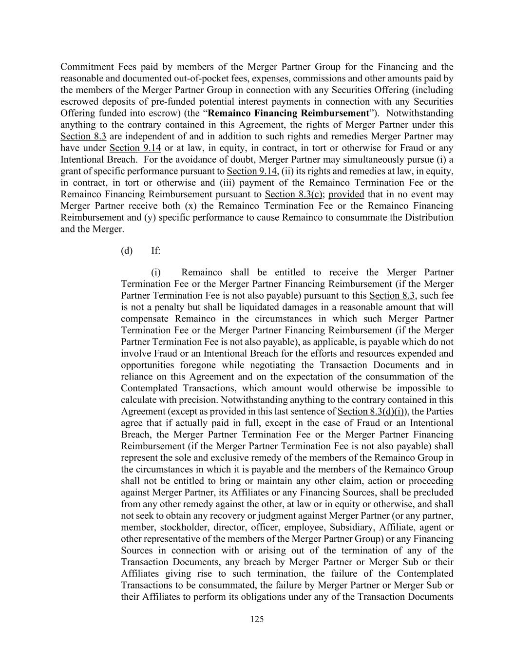 125 Commitment Fees paid by members of the Merger Partner Group for the Financing and the reasonable and documented out-of-pocket fees, expenses, commissions and other amounts paid by the members of the Merger Partner Group in connection with any Securities Offering (including escrowed deposits of pre-funded potential interest payments in connection with any Securities Offering funded into escrow) (the “Remainco Financing Reimbursement”). Notwithstanding anything to the contrary contained in this Agreement, the rights of Merger Partner under this Section 8.3 are independent of and in addition to such rights and remedies Merger Partner may have under Section 9.14 or at law, in equity, in contract, in tort or otherwise for Fraud or any Intentional Breach. For the avoidance of doubt, Merger Partner may simultaneously pursue (i) a grant of specific performance pursuant to Section 9.14, (ii) its rights and remedies at law, in equity, in contract, in tort or otherwise and (iii) payment of the Remainco Termination Fee or the Remainco Financing Reimbursement pursuant to Section 8.3(c); provided that in no event may Merger Partner receive both (x) the Remainco Termination Fee or the Remainco Financing Reimbursement and (y) specific performance to cause Remainco to consummate the Distribution and the Merger. (d) If: (i) Remainco shall be entitled to receive the Merger Partner Termination Fee or the Merger Partner Financing Reimbursement (if the Merger Partner Termination Fee is not also payable) pursuant to this Section 8.3, such fee is not a penalty but shall be liquidated damages in a reasonable amount that will compensate Remainco in the circumstances in which such Merger Partner Termination Fee or the Merger Partner Financing Reimbursement (if the Merger Partner Termination Fee is not also payable), as applicable, is payable which do not involve Fraud or an Intentional Breach for the efforts and resources expended and opportunities foregone while negotiating the Transaction Documents and in reliance on this Agreement and on the expectation of the consummation of the Contemplated Transactions, which amount would otherwise be impossible to calculate with precision. Notwithstanding anything to the contrary contained in this Agreement (except as provided in this last sentence of Section 8.3(d)(i)), the Parties agree that if actually paid in full, except in the case of Fraud or an Intentional Breach, the Merger Partner Termination Fee or the Merger Partner Financing Reimbursement (if the Merger Partner Termination Fee is not also payable) shall represent the sole and exclusive remedy of the members of the Remainco Group in the circumstances in which it is payable and the members of the Remainco Group shall not be entitled to bring or maintain any other claim, action or proceeding against Merger Partner, its Affiliates or any Financing Sources, shall be precluded from any other remedy against the other, at law or in equity or otherwise, and shall not seek to obtain any recovery or judgment against Merger Partner (or any partner, member, stockholder, director, officer, employee, Subsidiary, Affiliate, agent or other representative of the members of the Merger Partner Group) or any Financing Sources in connection with or arising out of the termination of any of the Transaction Documents, any breach by Merger Partner or Merger Sub or their Affiliates giving rise to such termination, the failure of the Contemplated Transactions to be consummated, the failure by Merger Partner or Merger Sub or their Affiliates to perform its obligations under any of the Transaction Documents