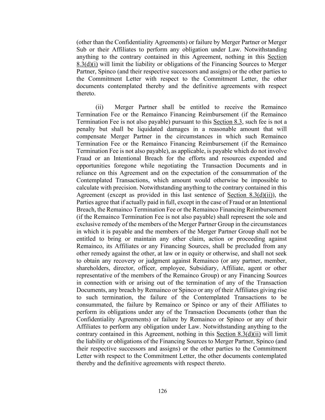 126 (other than the Confidentiality Agreements) or failure by Merger Partner or Merger Sub or their Affiliates to perform any obligation under Law. Notwithstanding anything to the contrary contained in this Agreement, nothing in this Section 8.3(d)(i) will limit the liability or obligations of the Financing Sources to Merger Partner, Spinco (and their respective successors and assigns) or the other parties to the Commitment Letter with respect to the Commitment Letter, the other documents contemplated thereby and the definitive agreements with respect thereto. (ii) Merger Partner shall be entitled to receive the Remainco Termination Fee or the Remainco Financing Reimbursement (if the Remainco Termination Fee is not also payable) pursuant to this Section 8.3, such fee is not a penalty but shall be liquidated damages in a reasonable amount that will compensate Merger Partner in the circumstances in which such Remainco Termination Fee or the Remainco Financing Reimbursement (if the Remainco Termination Fee is not also payable), as applicable, is payable which do not involve Fraud or an Intentional Breach for the efforts and resources expended and opportunities foregone while negotiating the Transaction Documents and in reliance on this Agreement and on the expectation of the consummation of the Contemplated Transactions, which amount would otherwise be impossible to calculate with precision. Notwithstanding anything to the contrary contained in this Agreement (except as provided in this last sentence of Section 8.3(d)(ii)), the Parties agree that if actually paid in full, except in the case of Fraud or an Intentional Breach, the Remainco Termination Fee or the Remainco Financing Reimbursement (if the Remainco Termination Fee is not also payable) shall represent the sole and exclusive remedy of the members of the Merger Partner Group in the circumstances in which it is payable and the members of the Merger Partner Group shall not be entitled to bring or maintain any other claim, action or proceeding against Remainco, its Affiliates or any Financing Sources, shall be precluded from any other remedy against the other, at law or in equity or otherwise, and shall not seek to obtain any recovery or judgment against Remainco (or any partner, member, shareholders, director, officer, employee, Subsidiary, Affiliate, agent or other representative of the members of the Remainco Group) or any Financing Sources in connection with or arising out of the termination of any of the Transaction Documents, any breach by Remainco or Spinco or any of their Affiliates giving rise to such termination, the failure of the Contemplated Transactions to be consummated, the failure by Remainco or Spinco or any of their Affiliates to perform its obligations under any of the Transaction Documents (other than the Confidentiality Agreements) or failure by Remainco or Spinco or any of their Affiliates to perform any obligation under Law. Notwithstanding anything to the contrary contained in this Agreement, nothing in this Section 8.3(d)(ii) will limit the liability or obligations of the Financing Sources to Merger Partner, Spinco (and their respective successors and assigns) or the other parties to the Commitment Letter with respect to the Commitment Letter, the other documents contemplated thereby and the definitive agreements with respect thereto.