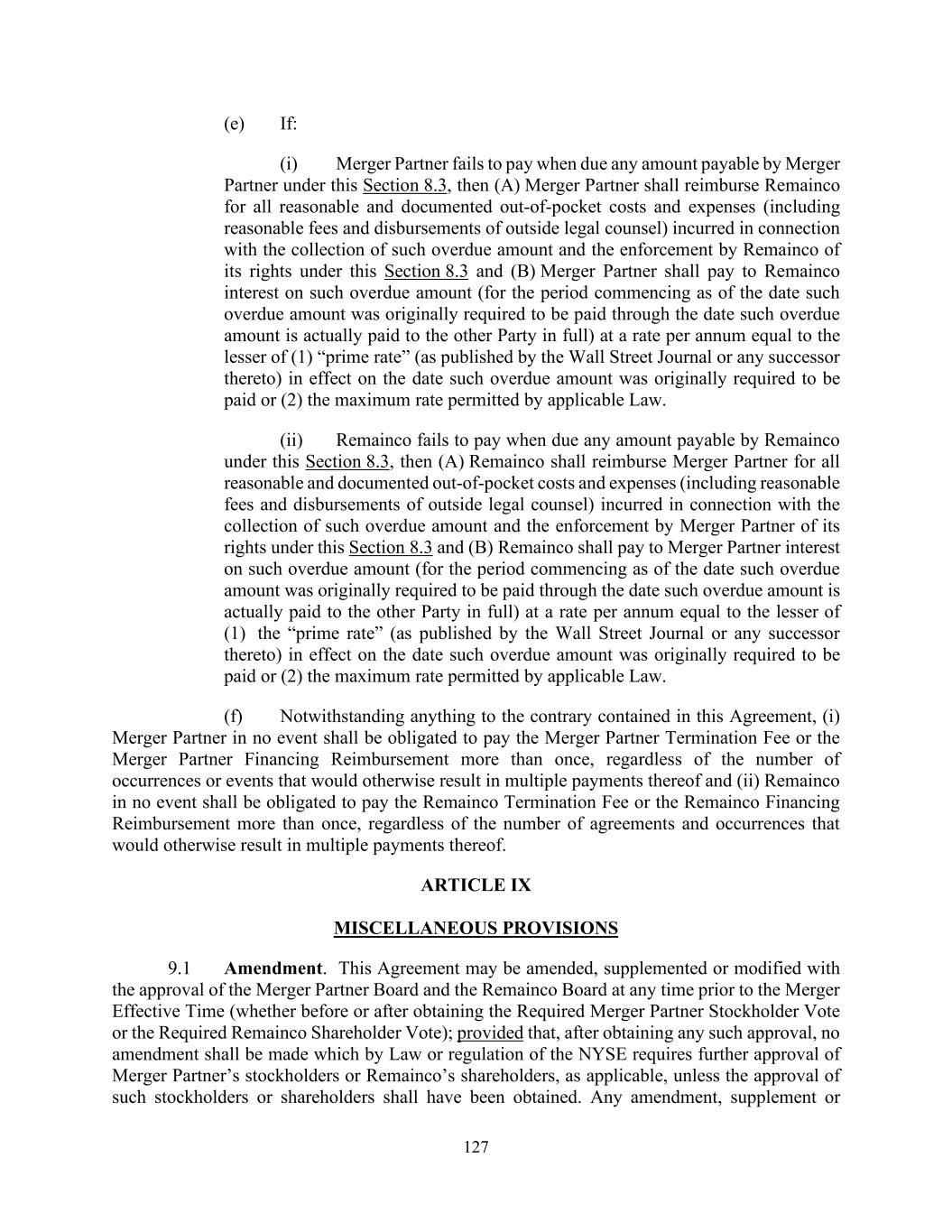 127 (e) If: (i) Merger Partner fails to pay when due any amount payable by Merger Partner under this Section 8.3, then (A) Merger Partner shall reimburse Remainco for all reasonable and documented out-of-pocket costs and expenses (including reasonable fees and disbursements of outside legal counsel) incurred in connection with the collection of such overdue amount and the enforcement by Remainco of its rights under this Section 8.3 and (B) Merger Partner shall pay to Remainco interest on such overdue amount (for the period commencing as of the date such overdue amount was originally required to be paid through the date such overdue amount is actually paid to the other Party in full) at a rate per annum equal to the lesser of (1) “prime rate” (as published by the Wall Street Journal or any successor thereto) in effect on the date such overdue amount was originally required to be paid or (2) the maximum rate permitted by applicable Law. (ii) Remainco fails to pay when due any amount payable by Remainco under this Section 8.3, then (A) Remainco shall reimburse Merger Partner for all reasonable and documented out-of-pocket costs and expenses (including reasonable fees and disbursements of outside legal counsel) incurred in connection with the collection of such overdue amount and the enforcement by Merger Partner of its rights under this Section 8.3 and (B) Remainco shall pay to Merger Partner interest on such overdue amount (for the period commencing as of the date such overdue amount was originally required to be paid through the date such overdue amount is actually paid to the other Party in full) at a rate per annum equal to the lesser of (1) the “prime rate” (as published by the Wall Street Journal or any successor thereto) in effect on the date such overdue amount was originally required to be paid or (2) the maximum rate permitted by applicable Law. (f) Notwithstanding anything to the contrary contained in this Agreement, (i) Merger Partner in no event shall be obligated to pay the Merger Partner Termination Fee or the Merger Partner Financing Reimbursement more than once, regardless of the number of occurrences or events that would otherwise result in multiple payments thereof and (ii) Remainco in no event shall be obligated to pay the Remainco Termination Fee or the Remainco Financing Reimbursement more than once, regardless of the number of agreements and occurrences that would otherwise result in multiple payments thereof. ARTICLE IX MISCELLANEOUS PROVISIONS 9.1 Amendment. This Agreement may be amended, supplemented or modified with the approval of the Merger Partner Board and the Remainco Board at any time prior to the Merger Effective Time (whether before or after obtaining the Required Merger Partner Stockholder Vote or the Required Remainco Shareholder Vote); provided that, after obtaining any such approval, no amendment shall be made which by Law or regulation of the NYSE requires further approval of Merger Partner’s stockholders or Remainco’s shareholders, as applicable, unless the approval of such stockholders or shareholders shall have been obtained. Any amendment, supplement or