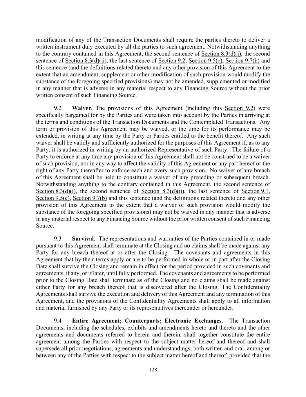 128 modification of any of the Transaction Documents shall require the parties thereto to deliver a written instrument duly executed by all the parties to such agreement. Notwithstanding anything to the contrary contained in this Agreement, the second sentence of Section 8.3(d)(i), the second sentence of Section 8.3(d)(ii), the last sentence of Section 9.2, Section 9.5(c), Section 9.7(b) and this sentence (and the definitions related thereto and any other provision of this Agreement to the extent that an amendment, supplement or other modification of such provision would modify the substance of the foregoing specified provisions) may not be amended, supplemented or modified in any manner that is adverse in any material respect to any Financing Source without the prior written consent of such Financing Source. 9.2 Waiver. The provisions of this Agreement (including this Section 9.2) were specifically bargained for by the Parties and were taken into account by the Parties in arriving at the terms and conditions of the Transaction Documents and the Contemplated Transactions. Any term or provision of this Agreement may be waived, or the time for its performance may be extended, in writing at any time by the Party or Parties entitled to the benefit thereof. Any such waiver shall be validly and sufficiently authorized for the purposes of this Agreement if, as to any Party, it is authorized in writing by an authorized Representative of such Party. The failure of a Party to enforce at any time any provision of this Agreement shall not be construed to be a waiver of such provision, nor in any way to affect the validity of this Agreement or any part hereof or the right of any Party thereafter to enforce each and every such provision. No waiver of any breach of this Agreement shall be held to constitute a waiver of any preceding or subsequent breach. Notwithstanding anything to the contrary contained in this Agreement, the second sentence of Section 8.3(d)(i), the second sentence of Section 8.3(d)(ii), the last sentence of Section 9.1, Section 9.5(c), Section 9.7(b) and this sentence (and the definitions related thereto and any other provision of this Agreement to the extent that a waiver of such provision would modify the substance of the foregoing specified provisions) may not be waived in any manner that is adverse in any material respect to any Financing Source without the prior written consent of such Financing Source. 9.3 Survival. The representations and warranties of the Parties contained in or made pursuant to this Agreement shall terminate at the Closing and no claims shall be made against any Party for any breach thereof at or after the Closing. The covenants and agreements in this Agreement that by their terms apply or are to be performed in whole or in part after the Closing Date shall survive the Closing and remain in effect for the period provided in such covenants and agreements, if any, or if later, until fully performed. The covenants and agreements to be performed prior to the Closing Date shall terminate as of the Closing and no claims shall be made against either Party for any breach thereof that is discovered after the Closing. The Confidentiality Agreements shall survive the execution and delivery of this Agreement and any termination of this Agreement, and the provisions of the Confidentiality Agreements shall apply to all information and material furnished by any Party or its representatives thereunder or hereunder. 9.4 Entire Agreement; Counterparts; Electronic Exchanges. The Transaction Documents, including the schedules, exhibits and amendments hereto and thereto and the other agreements and documents referred to herein and therein, shall together constitute the entire agreement among the Parties with respect to the subject matter hereof and thereof and shall supersede all prior negotiations, agreements and understandings, both written and oral, among or between any of the Parties with respect to the subject matter hereof and thereof; provided that the