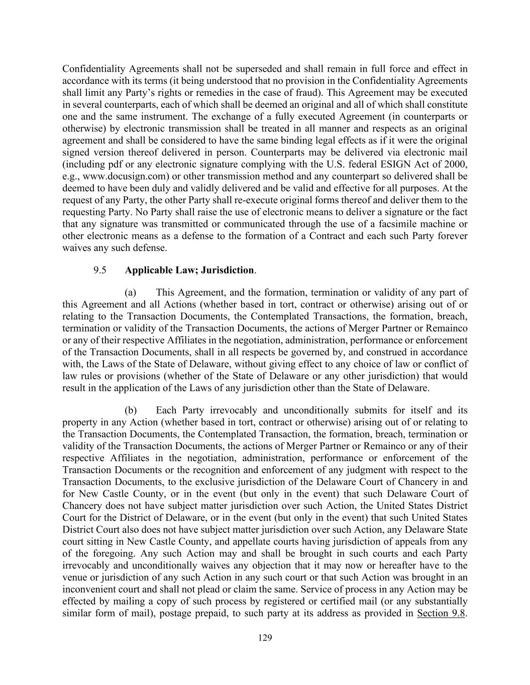 129 Confidentiality Agreements shall not be superseded and shall remain in full force and effect in accordance with its terms (it being understood that no provision in the Confidentiality Agreements shall limit any Party’s rights or remedies in the case of fraud). This Agreement may be executed in several counterparts, each of which shall be deemed an original and all of which shall constitute one and the same instrument. The exchange of a fully executed Agreement (in counterparts or otherwise) by electronic transmission shall be treated in all manner and respects as an original agreement and shall be considered to have the same binding legal effects as if it were the original signed version thereof delivered in person. Counterparts may be delivered via electronic mail (including pdf or any electronic signature complying with the U.S. federal ESIGN Act of 2000, e.g., www.docusign.com) or other transmission method and any counterpart so delivered shall be deemed to have been duly and validly delivered and be valid and effective for all purposes. At the request of any Party, the other Party shall re-execute original forms thereof and deliver them to the requesting Party. No Party shall raise the use of electronic means to deliver a signature or the fact that any signature was transmitted or communicated through the use of a facsimile machine or other electronic means as a defense to the formation of a Contract and each such Party forever waives any such defense. 9.5 Applicable Law; Jurisdiction. (a) This Agreement, and the formation, termination or validity of any part of this Agreement and all Actions (whether based in tort, contract or otherwise) arising out of or relating to the Transaction Documents, the Contemplated Transactions, the formation, breach, termination or validity of the Transaction Documents, the actions of Merger Partner or Remainco or any of their respective Affiliates in the negotiation, administration, performance or enforcement of the Transaction Documents, shall in all respects be governed by, and construed in accordance with, the Laws of the State of Delaware, without giving effect to any choice of law or conflict of law rules or provisions (whether of the State of Delaware or any other jurisdiction) that would result in the application of the Laws of any jurisdiction other than the State of Delaware. (b) Each Party irrevocably and unconditionally submits for itself and its property in any Action (whether based in tort, contract or otherwise) arising out of or relating to the Transaction Documents, the Contemplated Transaction, the formation, breach, termination or validity of the Transaction Documents, the actions of Merger Partner or Remainco or any of their respective Affiliates in the negotiation, administration, performance or enforcement of the Transaction Documents or the recognition and enforcement of any judgment with respect to the Transaction Documents, to the exclusive jurisdiction of the Delaware Court of Chancery in and for New Castle County, or in the event (but only in the event) that such Delaware Court of Chancery does not have subject matter jurisdiction over such Action, the United States District Court for the District of Delaware, or in the event (but only in the event) that such United States District Court also does not have subject matter jurisdiction over such Action, any Delaware State court sitting in New Castle County, and appellate courts having jurisdiction of appeals from any of the foregoing. Any such Action may and shall be brought in such courts and each Party irrevocably and unconditionally waives any objection that it may now or hereafter have to the venue or jurisdiction of any such Action in any such court or that such Action was brought in an inconvenient court and shall not plead or claim the same. Service of process in any Action may be effected by mailing a copy of such process by registered or certified mail (or any substantially similar form of mail), postage prepaid, to such party at its address as provided in Section 9.8.
