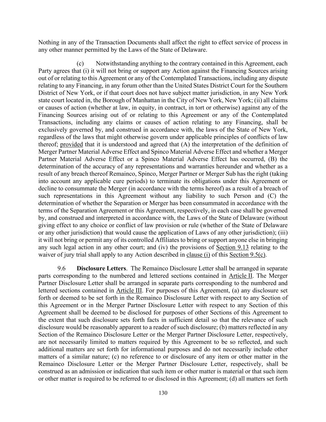 130 Nothing in any of the Transaction Documents shall affect the right to effect service of process in any other manner permitted by the Laws of the State of Delaware. (c) Notwithstanding anything to the contrary contained in this Agreement, each Party agrees that (i) it will not bring or support any Action against the Financing Sources arising out of or relating to this Agreement or any of the Contemplated Transactions, including any dispute relating to any Financing, in any forum other than the United States District Court for the Southern District of New York, or if that court does not have subject matter jurisdiction, in any New York state court located in, the Borough of Manhattan in the City of New York, New York; (ii) all claims or causes of action (whether at law, in equity, in contract, in tort or otherwise) against any of the Financing Sources arising out of or relating to this Agreement or any of the Contemplated Transactions, including any claims or causes of action relating to any Financing, shall be exclusively governed by, and construed in accordance with, the laws of the State of New York, regardless of the laws that might otherwise govern under applicable principles of conflicts of law thereof; provided that it is understood and agreed that (A) the interpretation of the definition of Merger Partner Material Adverse Effect and Spinco Material Adverse Effect and whether a Merger Partner Material Adverse Effect or a Spinco Material Adverse Effect has occurred, (B) the determination of the accuracy of any representations and warranties hereunder and whether as a result of any breach thereof Remainco, Spinco, Merger Partner or Merger Sub has the right (taking into account any applicable cure periods) to terminate its obligations under this Agreement or decline to consummate the Merger (in accordance with the terms hereof) as a result of a breach of such representations in this Agreement without any liability to such Person and (C) the determination of whether the Separation or Merger has been consummated in accordance with the terms of the Separation Agreement or this Agreement, respectively, in each case shall be governed by, and construed and interpreted in accordance with, the Laws of the State of Delaware (without giving effect to any choice or conflict of law provision or rule (whether of the State of Delaware or any other jurisdiction) that would cause the application of Laws of any other jurisdiction); (iii) it will not bring or permit any of its controlled Affiliates to bring or support anyone else in bringing any such legal action in any other court; and (iv) the provisions of Section 9.13 relating to the waiver of jury trial shall apply to any Action described in clause (i) of this Section 9.5(c). 9.6 Disclosure Letters. The Remainco Disclosure Letter shall be arranged in separate parts corresponding to the numbered and lettered sections contained in Article II. The Merger Partner Disclosure Letter shall be arranged in separate parts corresponding to the numbered and lettered sections contained in Article III. For purposes of this Agreement, (a) any disclosure set forth or deemed to be set forth in the Remainco Disclosure Letter with respect to any Section of this Agreement or in the Merger Partner Disclosure Letter with respect to any Section of this Agreement shall be deemed to be disclosed for purposes of other Sections of this Agreement to the extent that such disclosure sets forth facts in sufficient detail so that the relevance of such disclosure would be reasonably apparent to a reader of such disclosure; (b) matters reflected in any Section of the Remainco Disclosure Letter or the Merger Partner Disclosure Letter, respectively, are not necessarily limited to matters required by this Agreement to be so reflected, and such additional matters are set forth for informational purposes and do not necessarily include other matters of a similar nature; (c) no reference to or disclosure of any item or other matter in the Remainco Disclosure Letter or the Merger Partner Disclosure Letter, respectively, shall be construed as an admission or indication that such item or other matter is material or that such item or other matter is required to be referred to or disclosed in this Agreement; (d) all matters set forth