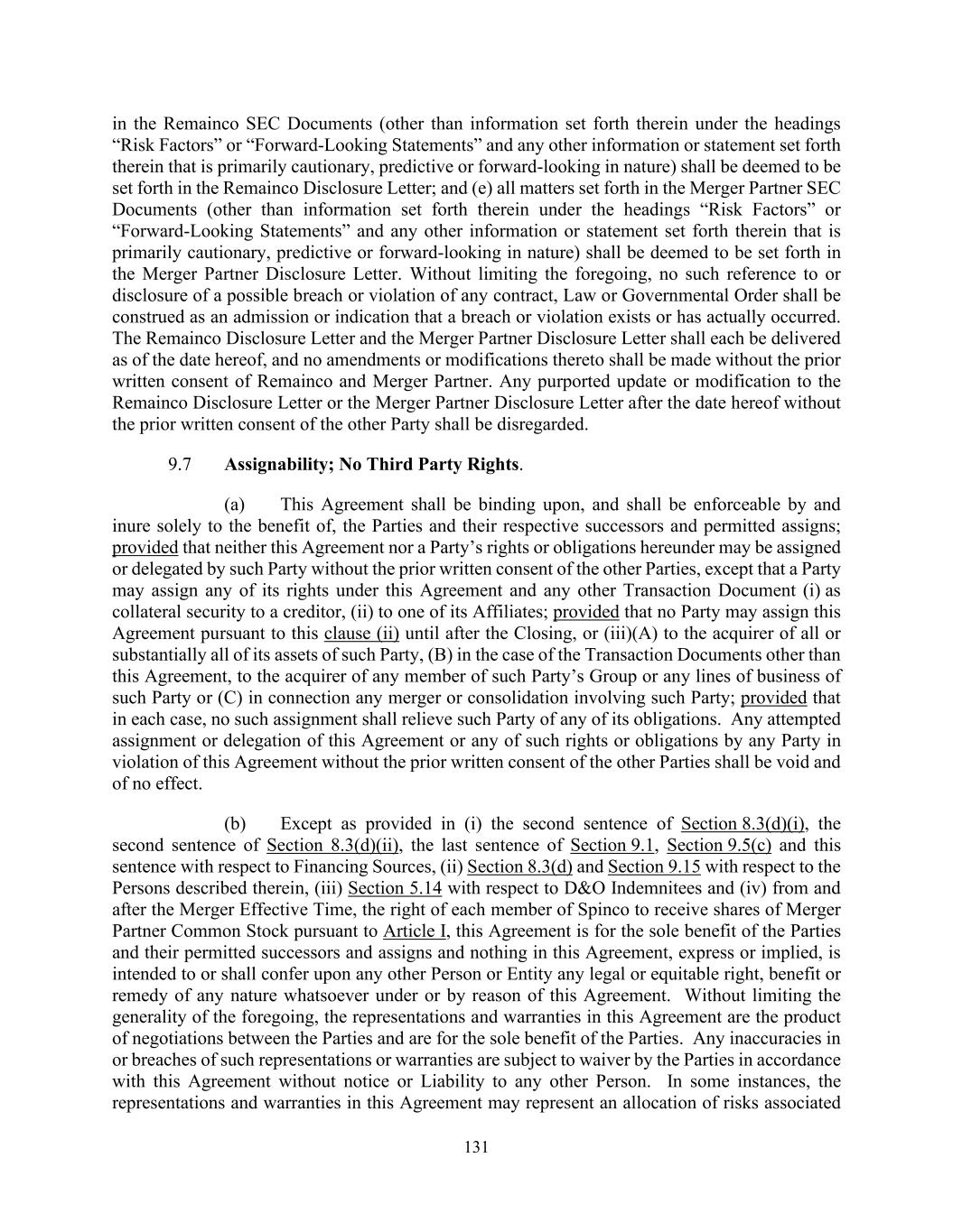 131 in the Remainco SEC Documents (other than information set forth therein under the headings “Risk Factors” or “Forward-Looking Statements” and any other information or statement set forth therein that is primarily cautionary, predictive or forward-looking in nature) shall be deemed to be set forth in the Remainco Disclosure Letter; and (e) all matters set forth in the Merger Partner SEC Documents (other than information set forth therein under the headings “Risk Factors” or “Forward-Looking Statements” and any other information or statement set forth therein that is primarily cautionary, predictive or forward-looking in nature) shall be deemed to be set forth in the Merger Partner Disclosure Letter. Without limiting the foregoing, no such reference to or disclosure of a possible breach or violation of any contract, Law or Governmental Order shall be construed as an admission or indication that a breach or violation exists or has actually occurred. The Remainco Disclosure Letter and the Merger Partner Disclosure Letter shall each be delivered as of the date hereof, and no amendments or modifications thereto shall be made without the prior written consent of Remainco and Merger Partner. Any purported update or modification to the Remainco Disclosure Letter or the Merger Partner Disclosure Letter after the date hereof without the prior written consent of the other Party shall be disregarded. 9.7 Assignability; No Third Party Rights. (a) This Agreement shall be binding upon, and shall be enforceable by and inure solely to the benefit of, the Parties and their respective successors and permitted assigns; provided that neither this Agreement nor a Party’s rights or obligations hereunder may be assigned or delegated by such Party without the prior written consent of the other Parties, except that a Party may assign any of its rights under this Agreement and any other Transaction Document (i) as collateral security to a creditor, (ii) to one of its Affiliates; provided that no Party may assign this Agreement pursuant to this clause (ii) until after the Closing, or (iii)(A) to the acquirer of all or substantially all of its assets of such Party, (B) in the case of the Transaction Documents other than this Agreement, to the acquirer of any member of such Party’s Group or any lines of business of such Party or (C) in connection any merger or consolidation involving such Party; provided that in each case, no such assignment shall relieve such Party of any of its obligations. Any attempted assignment or delegation of this Agreement or any of such rights or obligations by any Party in violation of this Agreement without the prior written consent of the other Parties shall be void and of no effect. (b) Except as provided in (i) the second sentence of Section 8.3(d)(i), the second sentence of Section 8.3(d)(ii), the last sentence of Section 9.1, Section 9.5(c) and this sentence with respect to Financing Sources, (ii) Section 8.3(d) and Section 9.15 with respect to the Persons described therein, (iii) Section 5.14 with respect to D&O Indemnitees and (iv) from and after the Merger Effective Time, the right of each member of Spinco to receive shares of Merger Partner Common Stock pursuant to Article I, this Agreement is for the sole benefit of the Parties and their permitted successors and assigns and nothing in this Agreement, express or implied, is intended to or shall confer upon any other Person or Entity any legal or equitable right, benefit or remedy of any nature whatsoever under or by reason of this Agreement. Without limiting the generality of the foregoing, the representations and warranties in this Agreement are the product of negotiations between the Parties and are for the sole benefit of the Parties. Any inaccuracies in or breaches of such representations or warranties are subject to waiver by the Parties in accordance with this Agreement without notice or Liability to any other Person. In some instances, the representations and warranties in this Agreement may represent an allocation of risks associated