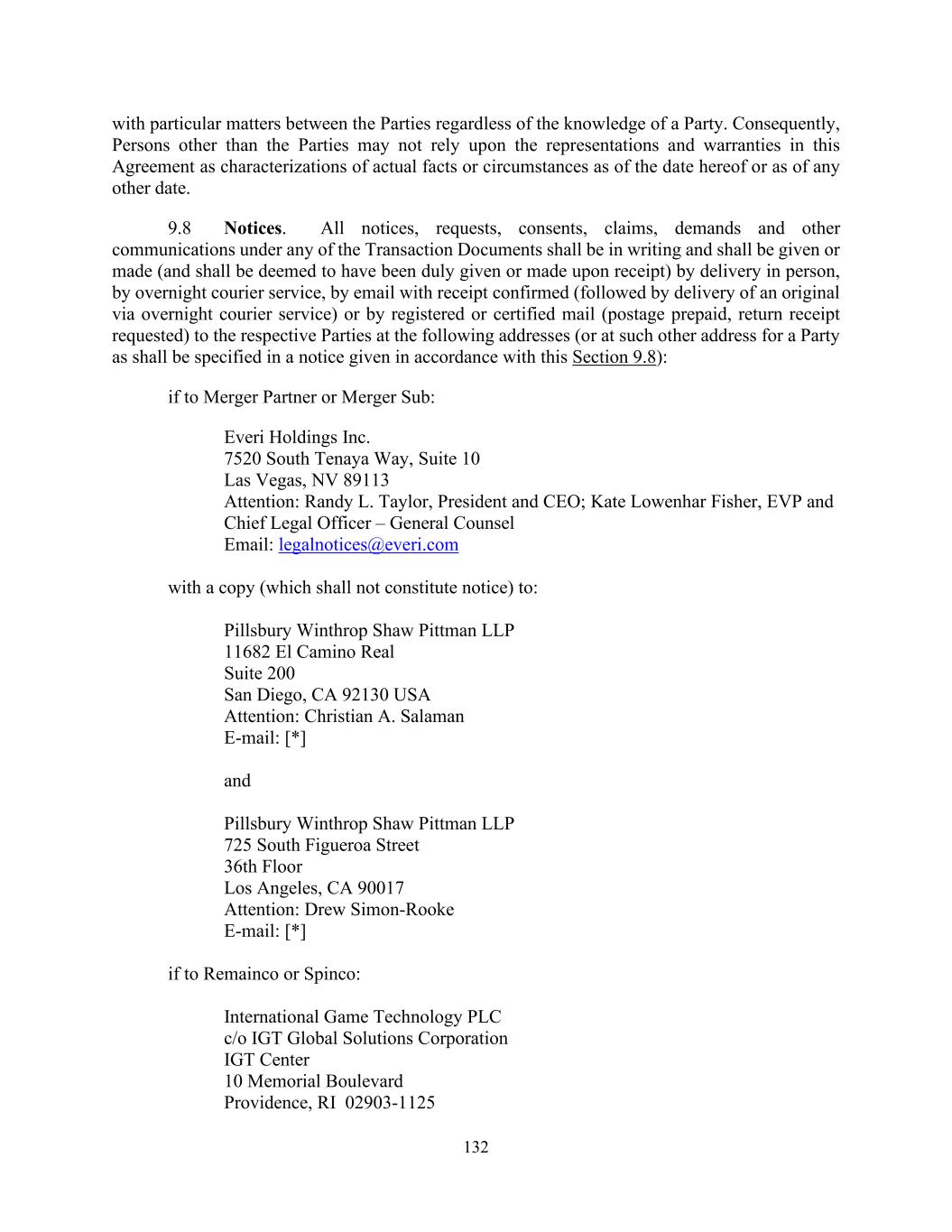 132 with particular matters between the Parties regardless of the knowledge of a Party. Consequently, Persons other than the Parties may not rely upon the representations and warranties in this Agreement as characterizations of actual facts or circumstances as of the date hereof or as of any other date. 9.8 Notices. All notices, requests, consents, claims, demands and other communications under any of the Transaction Documents shall be in writing and shall be given or made (and shall be deemed to have been duly given or made upon receipt) by delivery in person, by overnight courier service, by email with receipt confirmed (followed by delivery of an original via overnight courier service) or by registered or certified mail (postage prepaid, return receipt requested) to the respective Parties at the following addresses (or at such other address for a Party as shall be specified in a notice given in accordance with this Section 9.8): if to Merger Partner or Merger Sub: Everi Holdings Inc. 7520 South Tenaya Way, Suite 10 Las Vegas, NV 89113 Attention: Randy L. Taylor, President and CEO; Kate Lowenhar Fisher, EVP and Chief Legal Officer – General Counsel Email: legalnotices@everi.com with a copy (which shall not constitute notice) to: Pillsbury Winthrop Shaw Pittman LLP 11682 El Camino Real Suite 200 San Diego, CA 92130 USA Attention: Christian A. Salaman E-mail: [*] and Pillsbury Winthrop Shaw Pittman LLP 725 South Figueroa Street 36th Floor Los Angeles, CA 90017 Attention: Drew Simon-Rooke E-mail: [*] if to Remainco or Spinco: International Game Technology PLC c/o IGT Global Solutions Corporation IGT Center 10 Memorial Boulevard Providence, RI 02903-1125