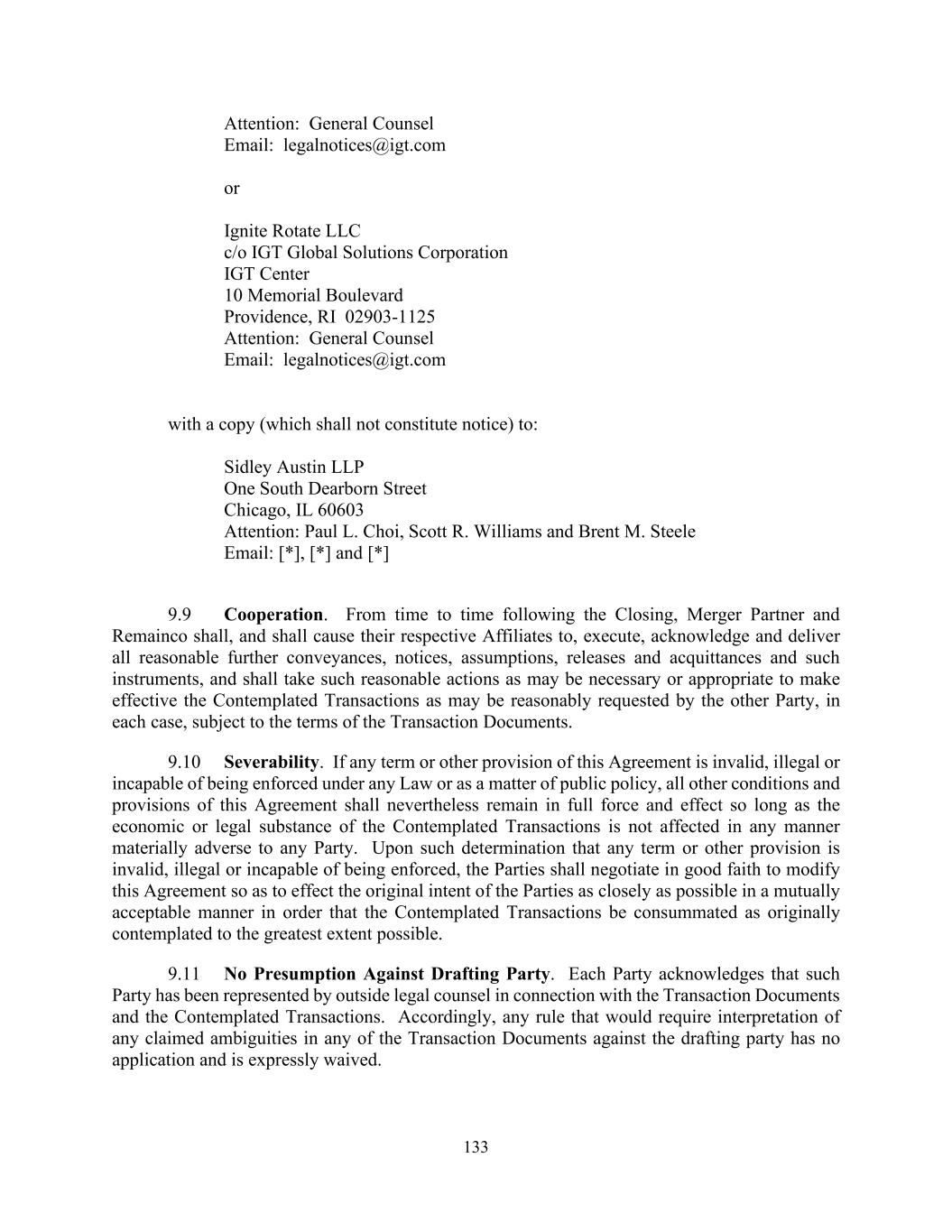 133 Attention: General Counsel Email: legalnotices@igt.com or Ignite Rotate LLC c/o IGT Global Solutions Corporation IGT Center 10 Memorial Boulevard Providence, RI 02903-1125 Attention: General Counsel Email: legalnotices@igt.com with a copy (which shall not constitute notice) to: Sidley Austin LLP One South Dearborn Street Chicago, IL 60603 Attention: Paul L. Choi, Scott R. Williams and Brent M. Steele Email: [*], [*] and [*] 9.9 Cooperation. From time to time following the Closing, Merger Partner and Remainco shall, and shall cause their respective Affiliates to, execute, acknowledge and deliver all reasonable further conveyances, notices, assumptions, releases and acquittances and such instruments, and shall take such reasonable actions as may be necessary or appropriate to make effective the Contemplated Transactions as may be reasonably requested by the other Party, in each case, subject to the terms of the Transaction Documents. 9.10 Severability. If any term or other provision of this Agreement is invalid, illegal or incapable of being enforced under any Law or as a matter of public policy, all other conditions and provisions of this Agreement shall nevertheless remain in full force and effect so long as the economic or legal substance of the Contemplated Transactions is not affected in any manner materially adverse to any Party. Upon such determination that any term or other provision is invalid, illegal or incapable of being enforced, the Parties shall negotiate in good faith to modify this Agreement so as to effect the original intent of the Parties as closely as possible in a mutually acceptable manner in order that the Contemplated Transactions be consummated as originally contemplated to the greatest extent possible. 9.11 No Presumption Against Drafting Party. Each Party acknowledges that such Party has been represented by outside legal counsel in connection with the Transaction Documents and the Contemplated Transactions. Accordingly, any rule that would require interpretation of any claimed ambiguities in any of the Transaction Documents against the drafting party has no application and is expressly waived.