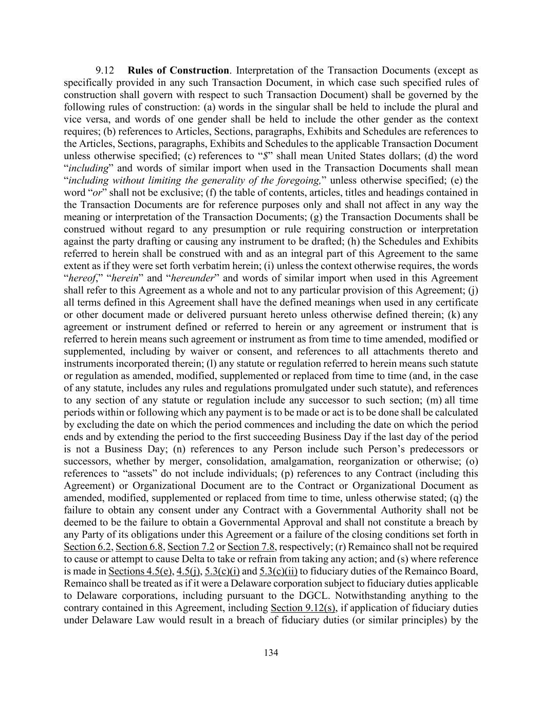 134 9.12 Rules of Construction. Interpretation of the Transaction Documents (except as specifically provided in any such Transaction Document, in which case such specified rules of construction shall govern with respect to such Transaction Document) shall be governed by the following rules of construction: (a) words in the singular shall be held to include the plural and vice versa, and words of one gender shall be held to include the other gender as the context requires; (b) references to Articles, Sections, paragraphs, Exhibits and Schedules are references to the Articles, Sections, paragraphs, Exhibits and Schedules to the applicable Transaction Document unless otherwise specified; (c) references to “$” shall mean United States dollars; (d) the word “including” and words of similar import when used in the Transaction Documents shall mean “including without limiting the generality of the foregoing,” unless otherwise specified; (e) the word “or” shall not be exclusive; (f) the table of contents, articles, titles and headings contained in the Transaction Documents are for reference purposes only and shall not affect in any way the meaning or interpretation of the Transaction Documents; (g) the Transaction Documents shall be construed without regard to any presumption or rule requiring construction or interpretation against the party drafting or causing any instrument to be drafted; (h) the Schedules and Exhibits referred to herein shall be construed with and as an integral part of this Agreement to the same extent as if they were set forth verbatim herein; (i) unless the context otherwise requires, the words “hereof,” “herein” and “hereunder” and words of similar import when used in this Agreement shall refer to this Agreement as a whole and not to any particular provision of this Agreement; (j) all terms defined in this Agreement shall have the defined meanings when used in any certificate or other document made or delivered pursuant hereto unless otherwise defined therein; (k) any agreement or instrument defined or referred to herein or any agreement or instrument that is referred to herein means such agreement or instrument as from time to time amended, modified or supplemented, including by waiver or consent, and references to all attachments thereto and instruments incorporated therein; (l) any statute or regulation referred to herein means such statute or regulation as amended, modified, supplemented or replaced from time to time (and, in the case of any statute, includes any rules and regulations promulgated under such statute), and references to any section of any statute or regulation include any successor to such section; (m) all time periods within or following which any payment is to be made or act is to be done shall be calculated by excluding the date on which the period commences and including the date on which the period ends and by extending the period to the first succeeding Business Day if the last day of the period is not a Business Day; (n) references to any Person include such Person’s predecessors or successors, whether by merger, consolidation, amalgamation, reorganization or otherwise; (o) references to “assets” do not include individuals; (p) references to any Contract (including this Agreement) or Organizational Document are to the Contract or Organizational Document as amended, modified, supplemented or replaced from time to time, unless otherwise stated; (q) the failure to obtain any consent under any Contract with a Governmental Authority shall not be deemed to be the failure to obtain a Governmental Approval and shall not constitute a breach by any Party of its obligations under this Agreement or a failure of the closing conditions set forth in Section 6.2, Section 6.8, Section 7.2 or Section 7.8, respectively; (r) Remainco shall not be required to cause or attempt to cause Delta to take or refrain from taking any action; and (s) where reference is made in Sections 4.5(e), 4.5(j), 5.3(c)(i) and 5.3(c)(ii) to fiduciary duties of the Remainco Board, Remainco shall be treated as if it were a Delaware corporation subject to fiduciary duties applicable to Delaware corporations, including pursuant to the DGCL. Notwithstanding anything to the contrary contained in this Agreement, including Section 9.12(s), if application of fiduciary duties under Delaware Law would result in a breach of fiduciary duties (or similar principles) by the