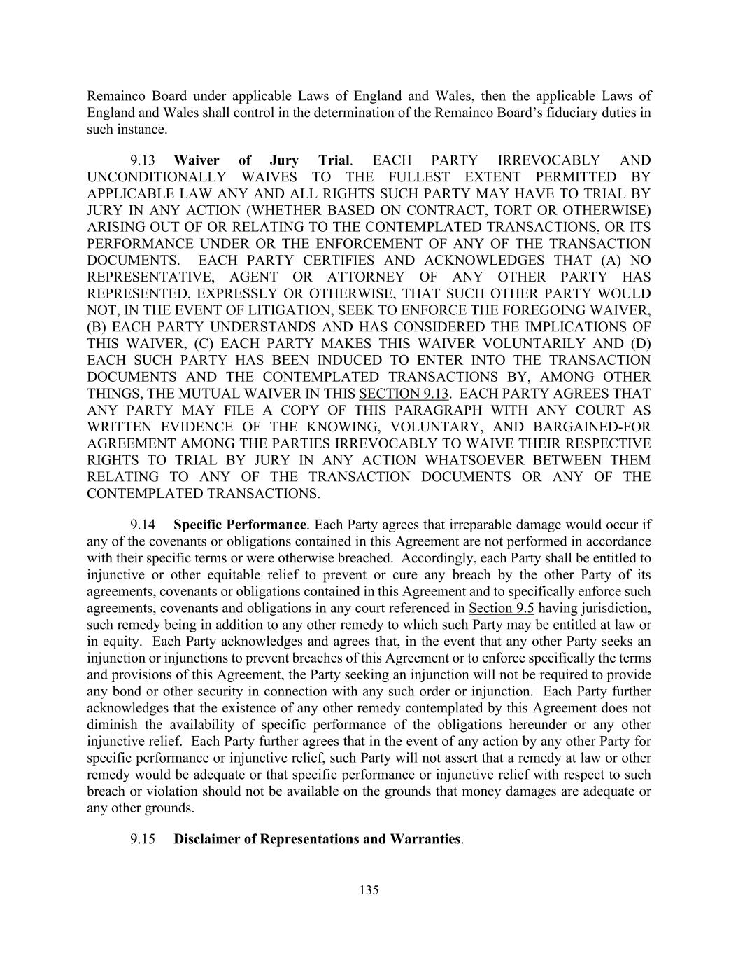 135 Remainco Board under applicable Laws of England and Wales, then the applicable Laws of England and Wales shall control in the determination of the Remainco Board’s fiduciary duties in such instance. 9.13 Waiver of Jury Trial. EACH PARTY IRREVOCABLY AND UNCONDITIONALLY WAIVES TO THE FULLEST EXTENT PERMITTED BY APPLICABLE LAW ANY AND ALL RIGHTS SUCH PARTY MAY HAVE TO TRIAL BY JURY IN ANY ACTION (WHETHER BASED ON CONTRACT, TORT OR OTHERWISE) ARISING OUT OF OR RELATING TO THE CONTEMPLATED TRANSACTIONS, OR ITS PERFORMANCE UNDER OR THE ENFORCEMENT OF ANY OF THE TRANSACTION DOCUMENTS. EACH PARTY CERTIFIES AND ACKNOWLEDGES THAT (A) NO REPRESENTATIVE, AGENT OR ATTORNEY OF ANY OTHER PARTY HAS REPRESENTED, EXPRESSLY OR OTHERWISE, THAT SUCH OTHER PARTY WOULD NOT, IN THE EVENT OF LITIGATION, SEEK TO ENFORCE THE FOREGOING WAIVER, (B) EACH PARTY UNDERSTANDS AND HAS CONSIDERED THE IMPLICATIONS OF THIS WAIVER, (C) EACH PARTY MAKES THIS WAIVER VOLUNTARILY AND (D) EACH SUCH PARTY HAS BEEN INDUCED TO ENTER INTO THE TRANSACTION DOCUMENTS AND THE CONTEMPLATED TRANSACTIONS BY, AMONG OTHER THINGS, THE MUTUAL WAIVER IN THIS SECTION 9.13. EACH PARTY AGREES THAT ANY PARTY MAY FILE A COPY OF THIS PARAGRAPH WITH ANY COURT AS WRITTEN EVIDENCE OF THE KNOWING, VOLUNTARY, AND BARGAINED-FOR AGREEMENT AMONG THE PARTIES IRREVOCABLY TO WAIVE THEIR RESPECTIVE RIGHTS TO TRIAL BY JURY IN ANY ACTION WHATSOEVER BETWEEN THEM RELATING TO ANY OF THE TRANSACTION DOCUMENTS OR ANY OF THE CONTEMPLATED TRANSACTIONS. 9.14 Specific Performance. Each Party agrees that irreparable damage would occur if any of the covenants or obligations contained in this Agreement are not performed in accordance with their specific terms or were otherwise breached. Accordingly, each Party shall be entitled to injunctive or other equitable relief to prevent or cure any breach by the other Party of its agreements, covenants or obligations contained in this Agreement and to specifically enforce such agreements, covenants and obligations in any court referenced in Section 9.5 having jurisdiction, such remedy being in addition to any other remedy to which such Party may be entitled at law or in equity. Each Party acknowledges and agrees that, in the event that any other Party seeks an injunction or injunctions to prevent breaches of this Agreement or to enforce specifically the terms and provisions of this Agreement, the Party seeking an injunction will not be required to provide any bond or other security in connection with any such order or injunction. Each Party further acknowledges that the existence of any other remedy contemplated by this Agreement does not diminish the availability of specific performance of the obligations hereunder or any other injunctive relief. Each Party further agrees that in the event of any action by any other Party for specific performance or injunctive relief, such Party will not assert that a remedy at law or other remedy would be adequate or that specific performance or injunctive relief with respect to such breach or violation should not be available on the grounds that money damages are adequate or any other grounds. 9.15 Disclaimer of Representations and Warranties.
