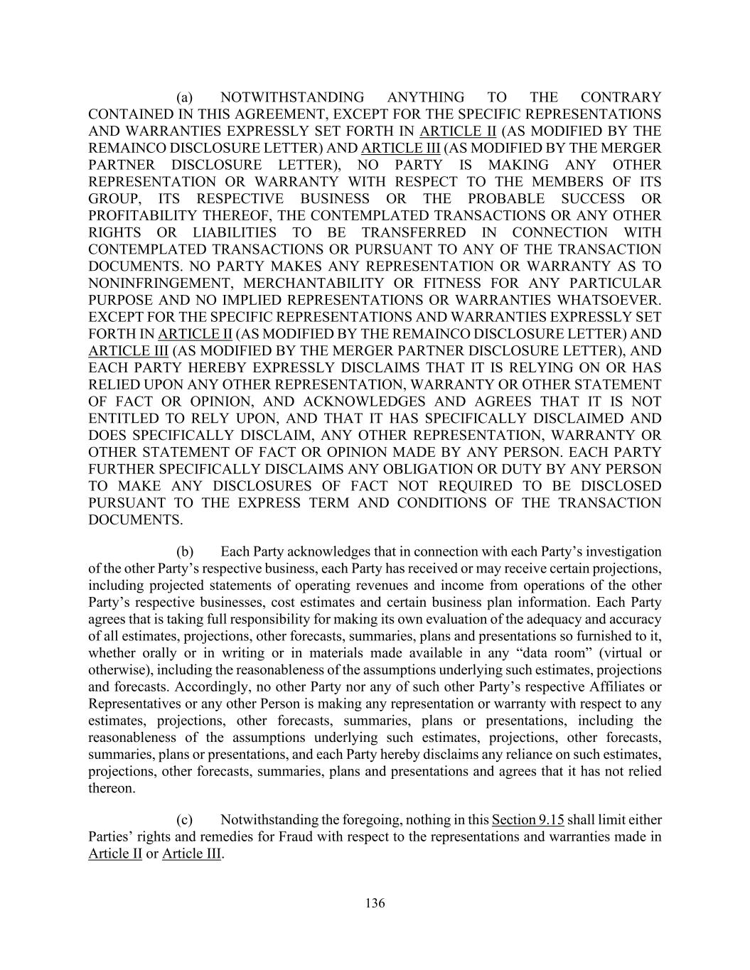 136 (a) NOTWITHSTANDING ANYTHING TO THE CONTRARY CONTAINED IN THIS AGREEMENT, EXCEPT FOR THE SPECIFIC REPRESENTATIONS AND WARRANTIES EXPRESSLY SET FORTH IN ARTICLE II (AS MODIFIED BY THE REMAINCO DISCLOSURE LETTER) AND ARTICLE III (AS MODIFIED BY THE MERGER PARTNER DISCLOSURE LETTER), NO PARTY IS MAKING ANY OTHER REPRESENTATION OR WARRANTY WITH RESPECT TO THE MEMBERS OF ITS GROUP, ITS RESPECTIVE BUSINESS OR THE PROBABLE SUCCESS OR PROFITABILITY THEREOF, THE CONTEMPLATED TRANSACTIONS OR ANY OTHER RIGHTS OR LIABILITIES TO BE TRANSFERRED IN CONNECTION WITH CONTEMPLATED TRANSACTIONS OR PURSUANT TO ANY OF THE TRANSACTION DOCUMENTS. NO PARTY MAKES ANY REPRESENTATION OR WARRANTY AS TO NONINFRINGEMENT, MERCHANTABILITY OR FITNESS FOR ANY PARTICULAR PURPOSE AND NO IMPLIED REPRESENTATIONS OR WARRANTIES WHATSOEVER. EXCEPT FOR THE SPECIFIC REPRESENTATIONS AND WARRANTIES EXPRESSLY SET FORTH IN ARTICLE II (AS MODIFIED BY THE REMAINCO DISCLOSURE LETTER) AND ARTICLE III (AS MODIFIED BY THE MERGER PARTNER DISCLOSURE LETTER), AND EACH PARTY HEREBY EXPRESSLY DISCLAIMS THAT IT IS RELYING ON OR HAS RELIED UPON ANY OTHER REPRESENTATION, WARRANTY OR OTHER STATEMENT OF FACT OR OPINION, AND ACKNOWLEDGES AND AGREES THAT IT IS NOT ENTITLED TO RELY UPON, AND THAT IT HAS SPECIFICALLY DISCLAIMED AND DOES SPECIFICALLY DISCLAIM, ANY OTHER REPRESENTATION, WARRANTY OR OTHER STATEMENT OF FACT OR OPINION MADE BY ANY PERSON. EACH PARTY FURTHER SPECIFICALLY DISCLAIMS ANY OBLIGATION OR DUTY BY ANY PERSON TO MAKE ANY DISCLOSURES OF FACT NOT REQUIRED TO BE DISCLOSED PURSUANT TO THE EXPRESS TERM AND CONDITIONS OF THE TRANSACTION DOCUMENTS. (b) Each Party acknowledges that in connection with each Party’s investigation of the other Party’s respective business, each Party has received or may receive certain projections, including projected statements of operating revenues and income from operations of the other Party’s respective businesses, cost estimates and certain business plan information. Each Party agrees that is taking full responsibility for making its own evaluation of the adequacy and accuracy of all estimates, projections, other forecasts, summaries, plans and presentations so furnished to it, whether orally or in writing or in materials made available in any “data room” (virtual or otherwise), including the reasonableness of the assumptions underlying such estimates, projections and forecasts. Accordingly, no other Party nor any of such other Party’s respective Affiliates or Representatives or any other Person is making any representation or warranty with respect to any estimates, projections, other forecasts, summaries, plans or presentations, including the reasonableness of the assumptions underlying such estimates, projections, other forecasts, summaries, plans or presentations, and each Party hereby disclaims any reliance on such estimates, projections, other forecasts, summaries, plans and presentations and agrees that it has not relied thereon. (c) Notwithstanding the foregoing, nothing in this Section 9.15 shall limit either Parties’ rights and remedies for Fraud with respect to the representations and warranties made in Article II or Article III.