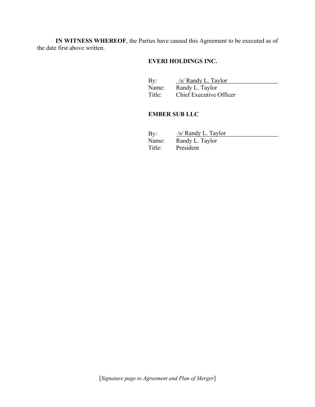 [Signature page to Agreement and Plan of Merger] IN WITNESS WHEREOF, the Parties have caused this Agreement to be executed as of the date first above written. EVERI HOLDINGS INC. By: Name: Randy L. Taylor Title: Chief Executive Officer EMBER SUB LLC By: Name: Randy L. Taylor Title: President /s/ Randy L. Taylor /s/ Randy L. Taylor