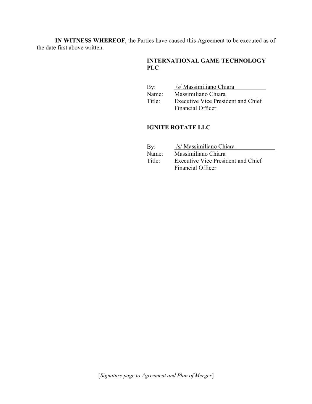 [Signature page to Agreement and Plan of Merger] IN WITNESS WHEREOF, the Parties have caused this Agreement to be executed as of the date first above written. INTERNATIONAL GAME TECHNOLOGY PLC By: Name: Massimiliano Chiara Title: Executive Vice President and Chief Financial Officer IGNITE ROTATE LLC By: Name: Massimiliano Chiara Title: Executive Vice President and Chief Financial Officer /s/ Massimiliano Chiara /s/ Massimiliano Chiara