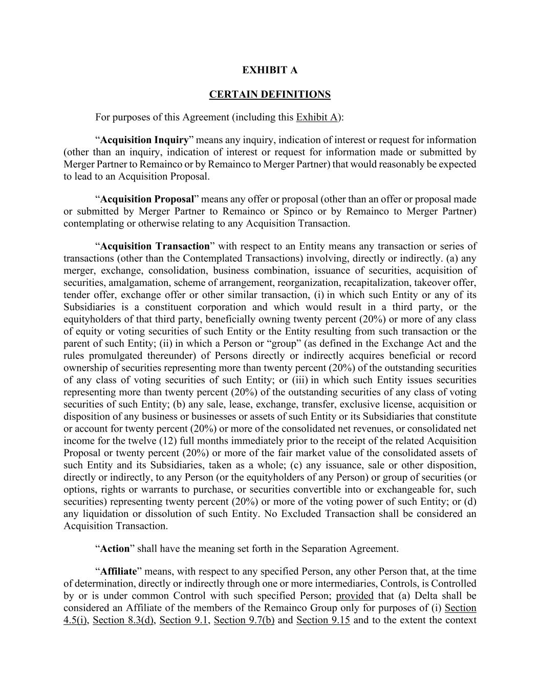 EXHIBIT A CERTAIN DEFINITIONS For purposes of this Agreement (including this Exhibit A): “Acquisition Inquiry” means any inquiry, indication of interest or request for information (other than an inquiry, indication of interest or request for information made or submitted by Merger Partner to Remainco or by Remainco to Merger Partner) that would reasonably be expected to lead to an Acquisition Proposal. “Acquisition Proposal” means any offer or proposal (other than an offer or proposal made or submitted by Merger Partner to Remainco or Spinco or by Remainco to Merger Partner) contemplating or otherwise relating to any Acquisition Transaction. “Acquisition Transaction” with respect to an Entity means any transaction or series of transactions (other than the Contemplated Transactions) involving, directly or indirectly. (a) any merger, exchange, consolidation, business combination, issuance of securities, acquisition of securities, amalgamation, scheme of arrangement, reorganization, recapitalization, takeover offer, tender offer, exchange offer or other similar transaction, (i) in which such Entity or any of its Subsidiaries is a constituent corporation and which would result in a third party, or the equityholders of that third party, beneficially owning twenty percent (20%) or more of any class of equity or voting securities of such Entity or the Entity resulting from such transaction or the parent of such Entity; (ii) in which a Person or “group” (as defined in the Exchange Act and the rules promulgated thereunder) of Persons directly or indirectly acquires beneficial or record ownership of securities representing more than twenty percent (20%) of the outstanding securities of any class of voting securities of such Entity; or (iii) in which such Entity issues securities representing more than twenty percent (20%) of the outstanding securities of any class of voting securities of such Entity; (b) any sale, lease, exchange, transfer, exclusive license, acquisition or disposition of any business or businesses or assets of such Entity or its Subsidiaries that constitute or account for twenty percent (20%) or more of the consolidated net revenues, or consolidated net income for the twelve (12) full months immediately prior to the receipt of the related Acquisition Proposal or twenty percent (20%) or more of the fair market value of the consolidated assets of such Entity and its Subsidiaries, taken as a whole; (c) any issuance, sale or other disposition, directly or indirectly, to any Person (or the equityholders of any Person) or group of securities (or options, rights or warrants to purchase, or securities convertible into or exchangeable for, such securities) representing twenty percent (20%) or more of the voting power of such Entity; or (d) any liquidation or dissolution of such Entity. No Excluded Transaction shall be considered an Acquisition Transaction. “Action” shall have the meaning set forth in the Separation Agreement. “Affiliate” means, with respect to any specified Person, any other Person that, at the time of determination, directly or indirectly through one or more intermediaries, Controls, is Controlled by or is under common Control with such specified Person; provided that (a) Delta shall be considered an Affiliate of the members of the Remainco Group only for purposes of (i) Section 4.5(i), Section 8.3(d), Section 9.1, Section 9.7(b) and Section 9.15 and to the extent the context
