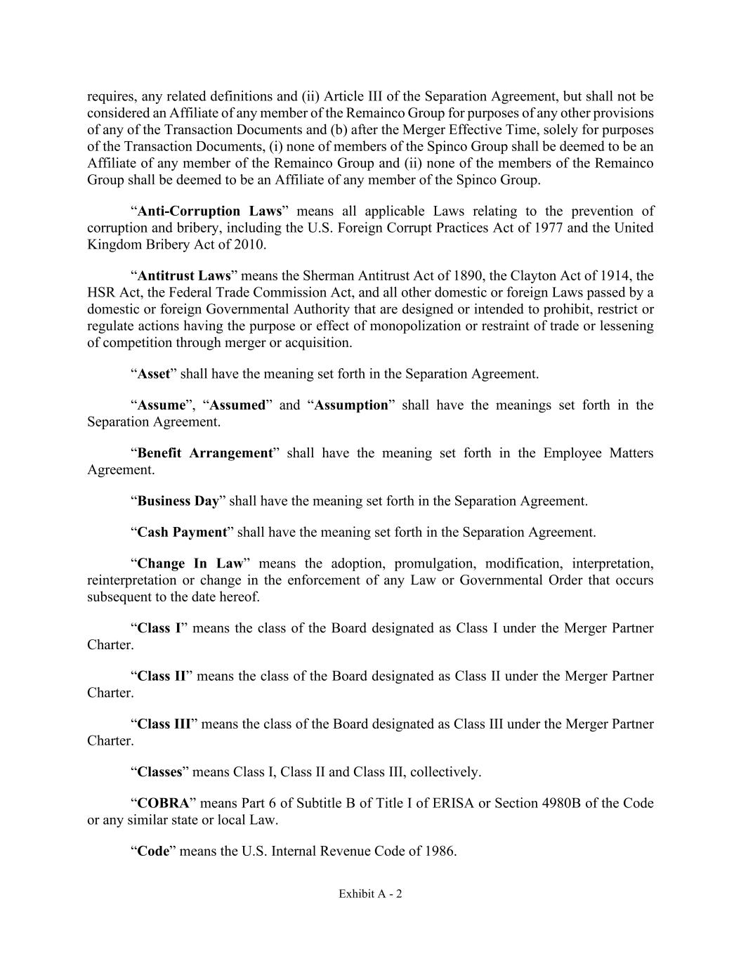 Exhibit A - 2 requires, any related definitions and (ii) Article III of the Separation Agreement, but shall not be considered an Affiliate of any member of the Remainco Group for purposes of any other provisions of any of the Transaction Documents and (b) after the Merger Effective Time, solely for purposes of the Transaction Documents, (i) none of members of the Spinco Group shall be deemed to be an Affiliate of any member of the Remainco Group and (ii) none of the members of the Remainco Group shall be deemed to be an Affiliate of any member of the Spinco Group. “Anti-Corruption Laws” means all applicable Laws relating to the prevention of corruption and bribery, including the U.S. Foreign Corrupt Practices Act of 1977 and the United Kingdom Bribery Act of 2010. “Antitrust Laws” means the Sherman Antitrust Act of 1890, the Clayton Act of 1914, the HSR Act, the Federal Trade Commission Act, and all other domestic or foreign Laws passed by a domestic or foreign Governmental Authority that are designed or intended to prohibit, restrict or regulate actions having the purpose or effect of monopolization or restraint of trade or lessening of competition through merger or acquisition. “Asset” shall have the meaning set forth in the Separation Agreement. “Assume”, “Assumed” and “Assumption” shall have the meanings set forth in the Separation Agreement. “Benefit Arrangement” shall have the meaning set forth in the Employee Matters Agreement. “Business Day” shall have the meaning set forth in the Separation Agreement. “Cash Payment” shall have the meaning set forth in the Separation Agreement. “Change In Law” means the adoption, promulgation, modification, interpretation, reinterpretation or change in the enforcement of any Law or Governmental Order that occurs subsequent to the date hereof. “Class I” means the class of the Board designated as Class I under the Merger Partner Charter. “Class II” means the class of the Board designated as Class II under the Merger Partner Charter. “Class III” means the class of the Board designated as Class III under the Merger Partner Charter. “Classes” means Class I, Class II and Class III, collectively. “COBRA” means Part 6 of Subtitle B of Title I of ERISA or Section 4980B of the Code or any similar state or local Law. “Code” means the U.S. Internal Revenue Code of 1986.