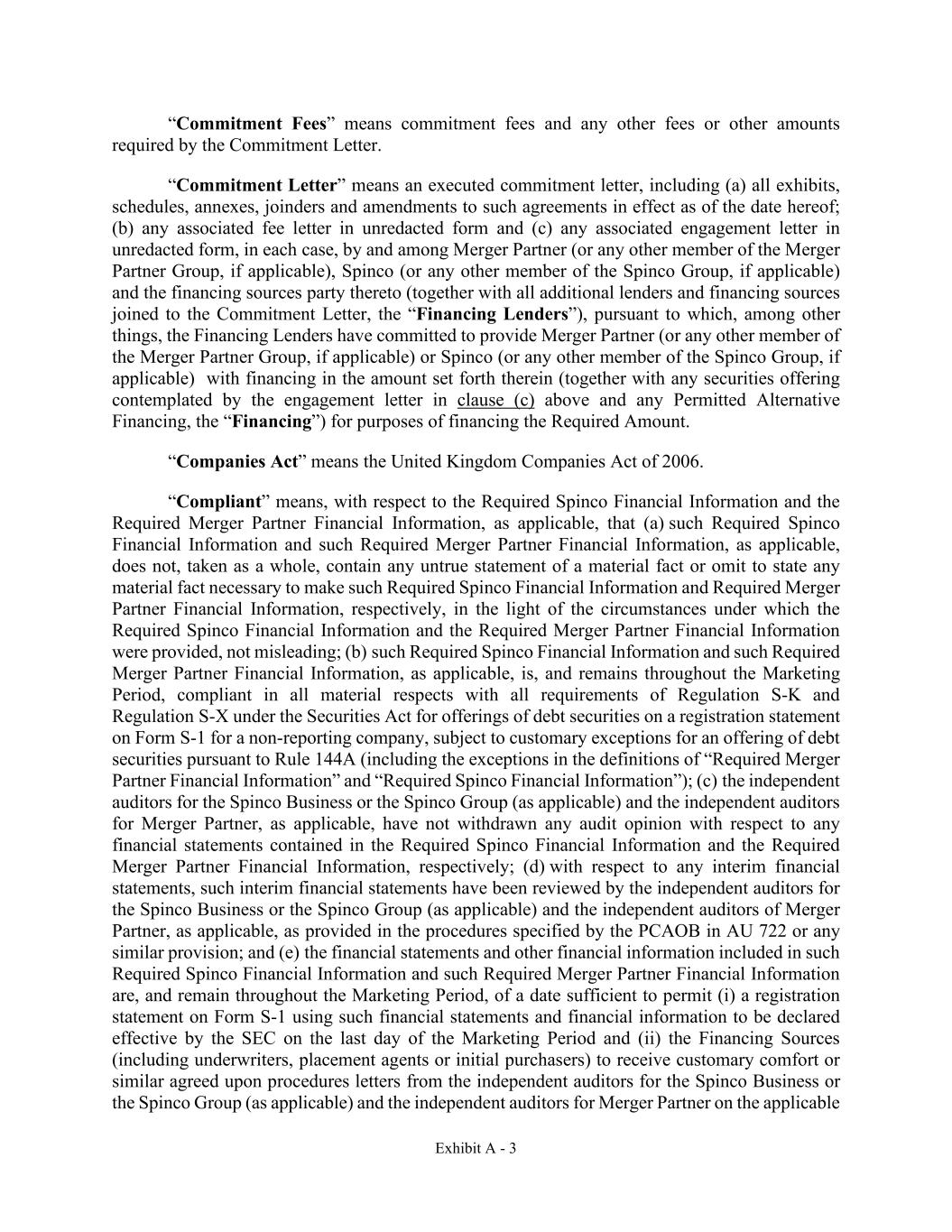 Exhibit A - 3 “Commitment Fees” means commitment fees and any other fees or other amounts required by the Commitment Letter. “Commitment Letter” means an executed commitment letter, including (a) all exhibits, schedules, annexes, joinders and amendments to such agreements in effect as of the date hereof; (b) any associated fee letter in unredacted form and (c) any associated engagement letter in unredacted form, in each case, by and among Merger Partner (or any other member of the Merger Partner Group, if applicable), Spinco (or any other member of the Spinco Group, if applicable) and the financing sources party thereto (together with all additional lenders and financing sources joined to the Commitment Letter, the “Financing Lenders”), pursuant to which, among other things, the Financing Lenders have committed to provide Merger Partner (or any other member of the Merger Partner Group, if applicable) or Spinco (or any other member of the Spinco Group, if applicable) with financing in the amount set forth therein (together with any securities offering contemplated by the engagement letter in clause (c) above and any Permitted Alternative Financing, the “Financing”) for purposes of financing the Required Amount. “Companies Act” means the United Kingdom Companies Act of 2006. “Compliant” means, with respect to the Required Spinco Financial Information and the Required Merger Partner Financial Information, as applicable, that (a) such Required Spinco Financial Information and such Required Merger Partner Financial Information, as applicable, does not, taken as a whole, contain any untrue statement of a material fact or omit to state any material fact necessary to make such Required Spinco Financial Information and Required Merger Partner Financial Information, respectively, in the light of the circumstances under which the Required Spinco Financial Information and the Required Merger Partner Financial Information were provided, not misleading; (b) such Required Spinco Financial Information and such Required Merger Partner Financial Information, as applicable, is, and remains throughout the Marketing Period, compliant in all material respects with all requirements of Regulation S-K and Regulation S-X under the Securities Act for offerings of debt securities on a registration statement on Form S-1 for a non-reporting company, subject to customary exceptions for an offering of debt securities pursuant to Rule 144A (including the exceptions in the definitions of “Required Merger Partner Financial Information” and “Required Spinco Financial Information”); (c) the independent auditors for the Spinco Business or the Spinco Group (as applicable) and the independent auditors for Merger Partner, as applicable, have not withdrawn any audit opinion with respect to any financial statements contained in the Required Spinco Financial Information and the Required Merger Partner Financial Information, respectively; (d) with respect to any interim financial statements, such interim financial statements have been reviewed by the independent auditors for the Spinco Business or the Spinco Group (as applicable) and the independent auditors of Merger Partner, as applicable, as provided in the procedures specified by the PCAOB in AU 722 or any similar provision; and (e) the financial statements and other financial information included in such Required Spinco Financial Information and such Required Merger Partner Financial Information are, and remain throughout the Marketing Period, of a date sufficient to permit (i) a registration statement on Form S-1 using such financial statements and financial information to be declared effective by the SEC on the last day of the Marketing Period and (ii) the Financing Sources (including underwriters, placement agents or initial purchasers) to receive customary comfort or similar agreed upon procedures letters from the independent auditors for the Spinco Business or the Spinco Group (as applicable) and the independent auditors for Merger Partner on the applicable