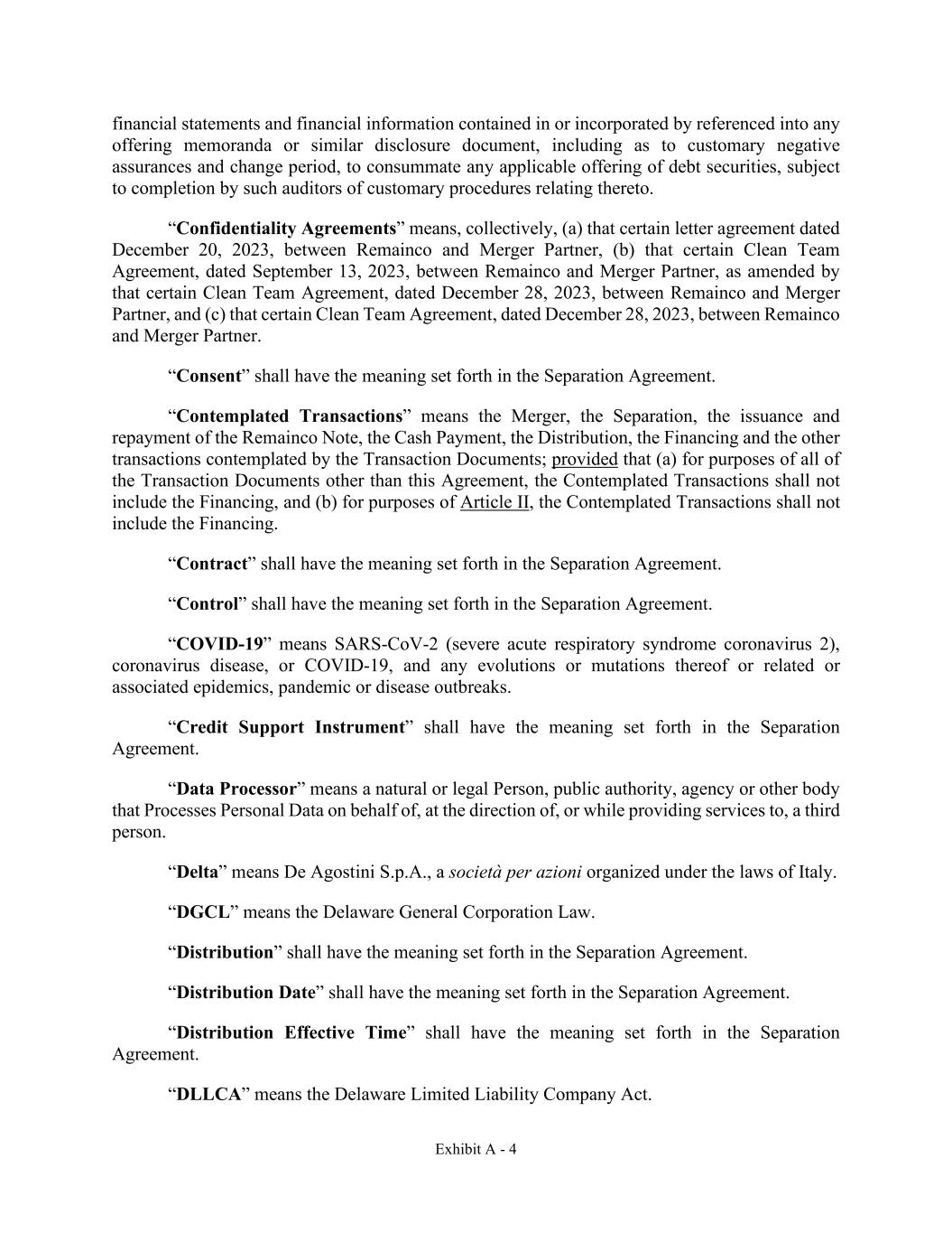 Exhibit A - 4 financial statements and financial information contained in or incorporated by referenced into any offering memoranda or similar disclosure document, including as to customary negative assurances and change period, to consummate any applicable offering of debt securities, subject to completion by such auditors of customary procedures relating thereto. “Confidentiality Agreements” means, collectively, (a) that certain letter agreement dated December 20, 2023, between Remainco and Merger Partner, (b) that certain Clean Team Agreement, dated September 13, 2023, between Remainco and Merger Partner, as amended by that certain Clean Team Agreement, dated December 28, 2023, between Remainco and Merger Partner, and (c) that certain Clean Team Agreement, dated December 28, 2023, between Remainco and Merger Partner. “Consent” shall have the meaning set forth in the Separation Agreement. “Contemplated Transactions” means the Merger, the Separation, the issuance and repayment of the Remainco Note, the Cash Payment, the Distribution, the Financing and the other transactions contemplated by the Transaction Documents; provided that (a) for purposes of all of the Transaction Documents other than this Agreement, the Contemplated Transactions shall not include the Financing, and (b) for purposes of Article II, the Contemplated Transactions shall not include the Financing. “Contract” shall have the meaning set forth in the Separation Agreement. “Control” shall have the meaning set forth in the Separation Agreement. “COVID-19” means SARS-CoV-2 (severe acute respiratory syndrome coronavirus 2), coronavirus disease, or COVID-19, and any evolutions or mutations thereof or related or associated epidemics, pandemic or disease outbreaks. “Credit Support Instrument” shall have the meaning set forth in the Separation Agreement. “Data Processor” means a natural or legal Person, public authority, agency or other body that Processes Personal Data on behalf of, at the direction of, or while providing services to, a third person. “Delta” means De Agostini S.p.A., a società per azioni organized under the laws of Italy. “DGCL” means the Delaware General Corporation Law. “Distribution” shall have the meaning set forth in the Separation Agreement. “Distribution Date” shall have the meaning set forth in the Separation Agreement. “Distribution Effective Time” shall have the meaning set forth in the Separation Agreement. “DLLCA” means the Delaware Limited Liability Company Act.