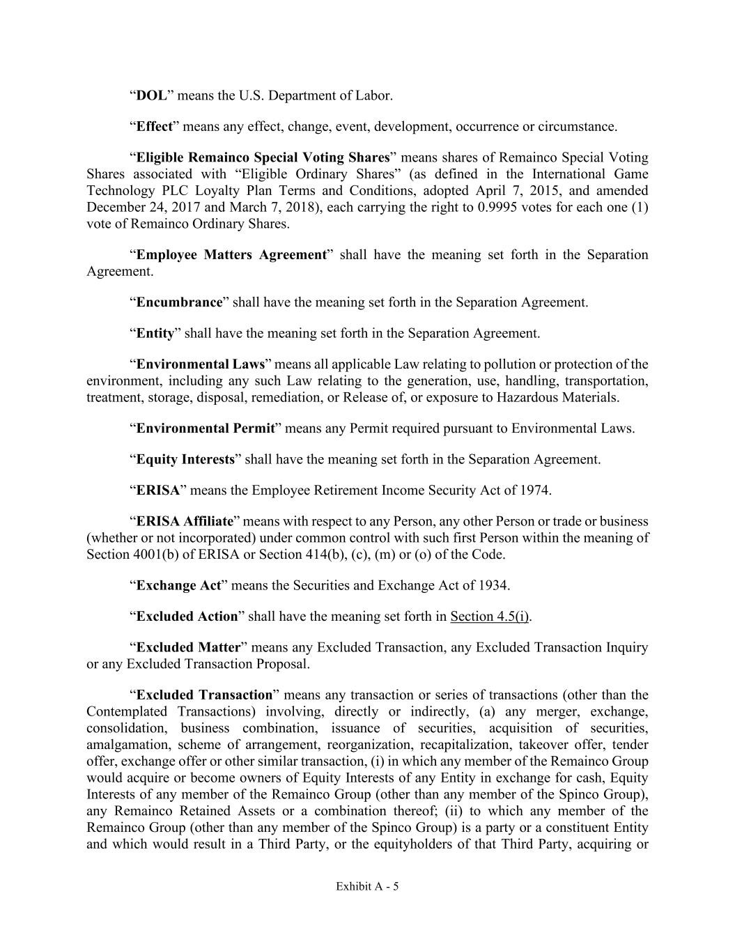 Exhibit A - 5 “DOL” means the U.S. Department of Labor. “Effect” means any effect, change, event, development, occurrence or circumstance. “Eligible Remainco Special Voting Shares” means shares of Remainco Special Voting Shares associated with “Eligible Ordinary Shares” (as defined in the International Game Technology PLC Loyalty Plan Terms and Conditions, adopted April 7, 2015, and amended December 24, 2017 and March 7, 2018), each carrying the right to 0.9995 votes for each one (1) vote of Remainco Ordinary Shares. “Employee Matters Agreement” shall have the meaning set forth in the Separation Agreement. “Encumbrance” shall have the meaning set forth in the Separation Agreement. “Entity” shall have the meaning set forth in the Separation Agreement. “Environmental Laws” means all applicable Law relating to pollution or protection of the environment, including any such Law relating to the generation, use, handling, transportation, treatment, storage, disposal, remediation, or Release of, or exposure to Hazardous Materials. “Environmental Permit” means any Permit required pursuant to Environmental Laws. “Equity Interests” shall have the meaning set forth in the Separation Agreement. “ERISA” means the Employee Retirement Income Security Act of 1974. “ERISA Affiliate” means with respect to any Person, any other Person or trade or business (whether or not incorporated) under common control with such first Person within the meaning of Section 4001(b) of ERISA or Section 414(b), (c), (m) or (o) of the Code. “Exchange Act” means the Securities and Exchange Act of 1934. “Excluded Action” shall have the meaning set forth in Section 4.5(i). “Excluded Matter” means any Excluded Transaction, any Excluded Transaction Inquiry or any Excluded Transaction Proposal. “Excluded Transaction” means any transaction or series of transactions (other than the Contemplated Transactions) involving, directly or indirectly, (a) any merger, exchange, consolidation, business combination, issuance of securities, acquisition of securities, amalgamation, scheme of arrangement, reorganization, recapitalization, takeover offer, tender offer, exchange offer or other similar transaction, (i) in which any member of the Remainco Group would acquire or become owners of Equity Interests of any Entity in exchange for cash, Equity Interests of any member of the Remainco Group (other than any member of the Spinco Group), any Remainco Retained Assets or a combination thereof; (ii) to which any member of the Remainco Group (other than any member of the Spinco Group) is a party or a constituent Entity and which would result in a Third Party, or the equityholders of that Third Party, acquiring or