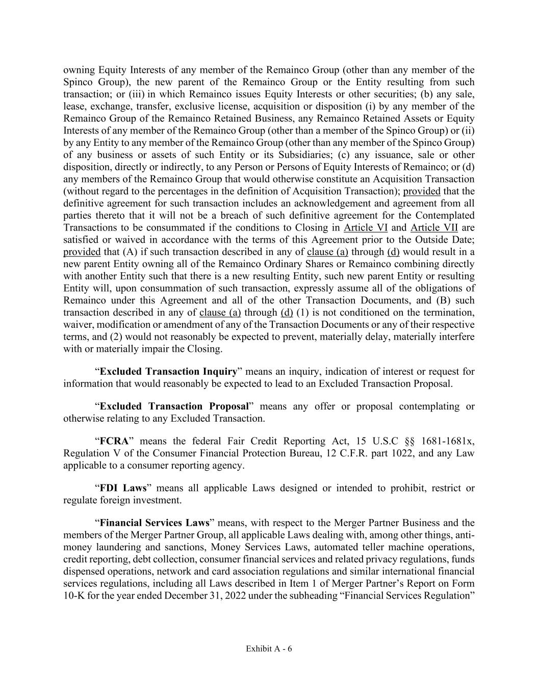 Exhibit A - 6 owning Equity Interests of any member of the Remainco Group (other than any member of the Spinco Group), the new parent of the Remainco Group or the Entity resulting from such transaction; or (iii) in which Remainco issues Equity Interests or other securities; (b) any sale, lease, exchange, transfer, exclusive license, acquisition or disposition (i) by any member of the Remainco Group of the Remainco Retained Business, any Remainco Retained Assets or Equity Interests of any member of the Remainco Group (other than a member of the Spinco Group) or (ii) by any Entity to any member of the Remainco Group (other than any member of the Spinco Group) of any business or assets of such Entity or its Subsidiaries; (c) any issuance, sale or other disposition, directly or indirectly, to any Person or Persons of Equity Interests of Remainco; or (d) any members of the Remainco Group that would otherwise constitute an Acquisition Transaction (without regard to the percentages in the definition of Acquisition Transaction); provided that the definitive agreement for such transaction includes an acknowledgement and agreement from all parties thereto that it will not be a breach of such definitive agreement for the Contemplated Transactions to be consummated if the conditions to Closing in Article VI and Article VII are satisfied or waived in accordance with the terms of this Agreement prior to the Outside Date; provided that (A) if such transaction described in any of clause (a) through (d) would result in a new parent Entity owning all of the Remainco Ordinary Shares or Remainco combining directly with another Entity such that there is a new resulting Entity, such new parent Entity or resulting Entity will, upon consummation of such transaction, expressly assume all of the obligations of Remainco under this Agreement and all of the other Transaction Documents, and (B) such transaction described in any of clause (a) through (d) (1) is not conditioned on the termination, waiver, modification or amendment of any of the Transaction Documents or any of their respective terms, and (2) would not reasonably be expected to prevent, materially delay, materially interfere with or materially impair the Closing. “Excluded Transaction Inquiry” means an inquiry, indication of interest or request for information that would reasonably be expected to lead to an Excluded Transaction Proposal. “Excluded Transaction Proposal” means any offer or proposal contemplating or otherwise relating to any Excluded Transaction. “FCRA” means the federal Fair Credit Reporting Act, 15 U.S.C §§ 1681-1681x, Regulation V of the Consumer Financial Protection Bureau, 12 C.F.R. part 1022, and any Law applicable to a consumer reporting agency. “FDI Laws” means all applicable Laws designed or intended to prohibit, restrict or regulate foreign investment. “Financial Services Laws” means, with respect to the Merger Partner Business and the members of the Merger Partner Group, all applicable Laws dealing with, among other things, anti- money laundering and sanctions, Money Services Laws, automated teller machine operations, credit reporting, debt collection, consumer financial services and related privacy regulations, funds dispensed operations, network and card association regulations and similar international financial services regulations, including all Laws described in Item 1 of Merger Partner’s Report on Form 10-K for the year ended December 31, 2022 under the subheading “Financial Services Regulation”