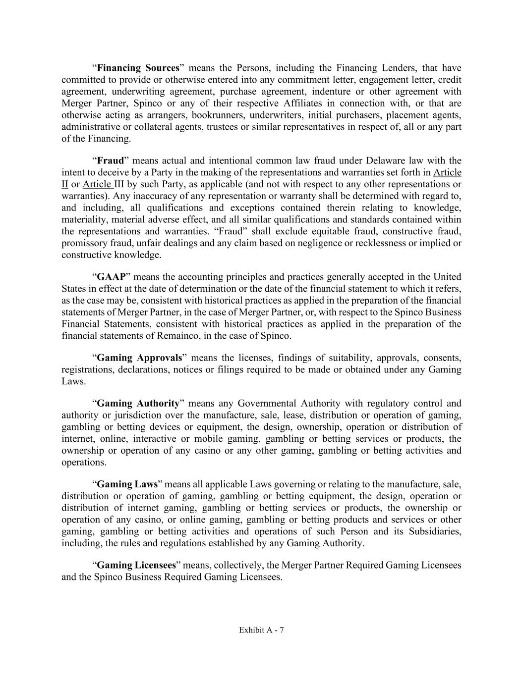 Exhibit A - 7 “Financing Sources” means the Persons, including the Financing Lenders, that have committed to provide or otherwise entered into any commitment letter, engagement letter, credit agreement, underwriting agreement, purchase agreement, indenture or other agreement with Merger Partner, Spinco or any of their respective Affiliates in connection with, or that are otherwise acting as arrangers, bookrunners, underwriters, initial purchasers, placement agents, administrative or collateral agents, trustees or similar representatives in respect of, all or any part of the Financing. “Fraud” means actual and intentional common law fraud under Delaware law with the intent to deceive by a Party in the making of the representations and warranties set forth in Article II or Article III by such Party, as applicable (and not with respect to any other representations or warranties). Any inaccuracy of any representation or warranty shall be determined with regard to, and including, all qualifications and exceptions contained therein relating to knowledge, materiality, material adverse effect, and all similar qualifications and standards contained within the representations and warranties. “Fraud” shall exclude equitable fraud, constructive fraud, promissory fraud, unfair dealings and any claim based on negligence or recklessness or implied or constructive knowledge. “GAAP” means the accounting principles and practices generally accepted in the United States in effect at the date of determination or the date of the financial statement to which it refers, as the case may be, consistent with historical practices as applied in the preparation of the financial statements of Merger Partner, in the case of Merger Partner, or, with respect to the Spinco Business Financial Statements, consistent with historical practices as applied in the preparation of the financial statements of Remainco, in the case of Spinco. “Gaming Approvals” means the licenses, findings of suitability, approvals, consents, registrations, declarations, notices or filings required to be made or obtained under any Gaming Laws. “Gaming Authority” means any Governmental Authority with regulatory control and authority or jurisdiction over the manufacture, sale, lease, distribution or operation of gaming, gambling or betting devices or equipment, the design, ownership, operation or distribution of internet, online, interactive or mobile gaming, gambling or betting services or products, the ownership or operation of any casino or any other gaming, gambling or betting activities and operations. “Gaming Laws” means all applicable Laws governing or relating to the manufacture, sale, distribution or operation of gaming, gambling or betting equipment, the design, operation or distribution of internet gaming, gambling or betting services or products, the ownership or operation of any casino, or online gaming, gambling or betting products and services or other gaming, gambling or betting activities and operations of such Person and its Subsidiaries, including, the rules and regulations established by any Gaming Authority. “Gaming Licensees” means, collectively, the Merger Partner Required Gaming Licensees and the Spinco Business Required Gaming Licensees.