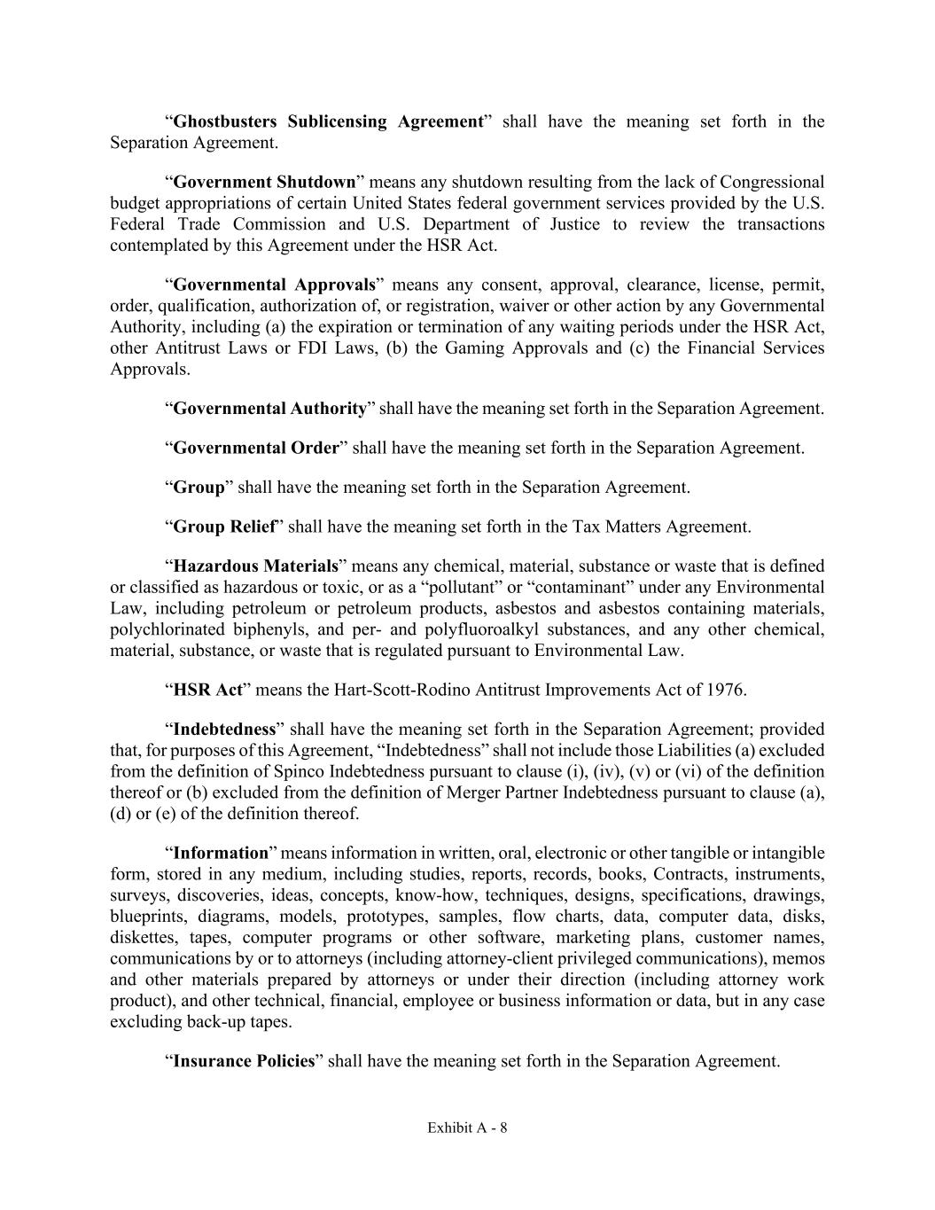 Exhibit A - 8 “Ghostbusters Sublicensing Agreement” shall have the meaning set forth in the Separation Agreement. “Government Shutdown” means any shutdown resulting from the lack of Congressional budget appropriations of certain United States federal government services provided by the U.S. Federal Trade Commission and U.S. Department of Justice to review the transactions contemplated by this Agreement under the HSR Act. “Governmental Approvals” means any consent, approval, clearance, license, permit, order, qualification, authorization of, or registration, waiver or other action by any Governmental Authority, including (a) the expiration or termination of any waiting periods under the HSR Act, other Antitrust Laws or FDI Laws, (b) the Gaming Approvals and (c) the Financial Services Approvals. “Governmental Authority” shall have the meaning set forth in the Separation Agreement. “Governmental Order” shall have the meaning set forth in the Separation Agreement. “Group” shall have the meaning set forth in the Separation Agreement. “Group Relief” shall have the meaning set forth in the Tax Matters Agreement. “Hazardous Materials” means any chemical, material, substance or waste that is defined or classified as hazardous or toxic, or as a “pollutant” or “contaminant” under any Environmental Law, including petroleum or petroleum products, asbestos and asbestos containing materials, polychlorinated biphenyls, and per- and polyfluoroalkyl substances, and any other chemical, material, substance, or waste that is regulated pursuant to Environmental Law. “HSR Act” means the Hart-Scott-Rodino Antitrust Improvements Act of 1976. “Indebtedness” shall have the meaning set forth in the Separation Agreement; provided that, for purposes of this Agreement, “Indebtedness” shall not include those Liabilities (a) excluded from the definition of Spinco Indebtedness pursuant to clause (i), (iv), (v) or (vi) of the definition thereof or (b) excluded from the definition of Merger Partner Indebtedness pursuant to clause (a), (d) or (e) of the definition thereof. “Information” means information in written, oral, electronic or other tangible or intangible form, stored in any medium, including studies, reports, records, books, Contracts, instruments, surveys, discoveries, ideas, concepts, know-how, techniques, designs, specifications, drawings, blueprints, diagrams, models, prototypes, samples, flow charts, data, computer data, disks, diskettes, tapes, computer programs or other software, marketing plans, customer names, communications by or to attorneys (including attorney-client privileged communications), memos and other materials prepared by attorneys or under their direction (including attorney work product), and other technical, financial, employee or business information or data, but in any case excluding back-up tapes. “Insurance Policies” shall have the meaning set forth in the Separation Agreement.
