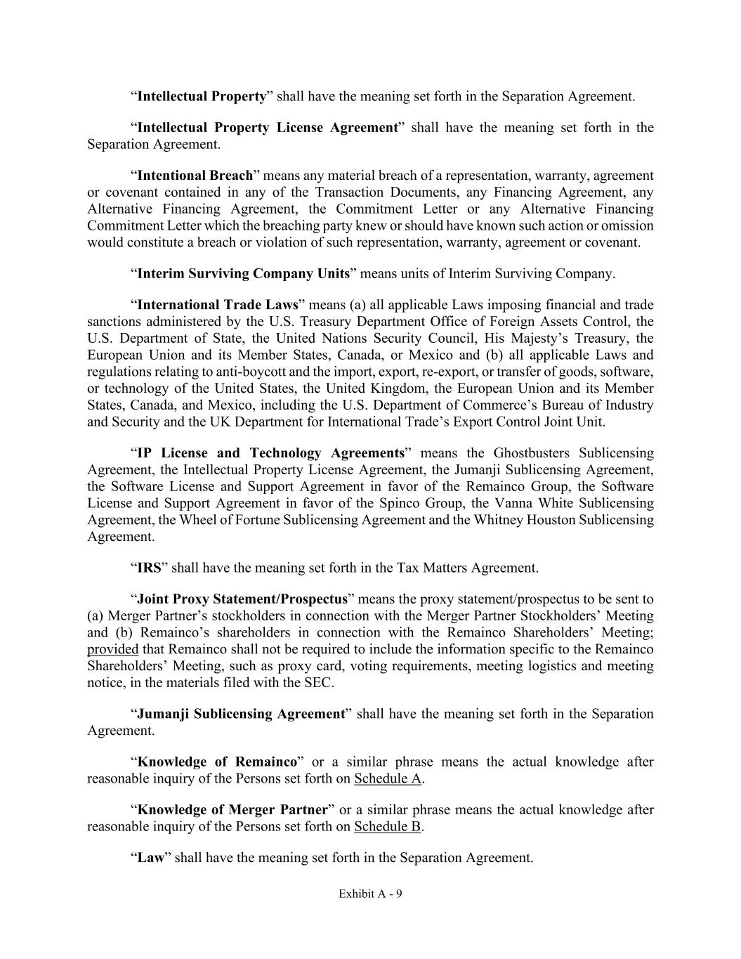 Exhibit A - 9 “Intellectual Property” shall have the meaning set forth in the Separation Agreement. “Intellectual Property License Agreement” shall have the meaning set forth in the Separation Agreement. “Intentional Breach” means any material breach of a representation, warranty, agreement or covenant contained in any of the Transaction Documents, any Financing Agreement, any Alternative Financing Agreement, the Commitment Letter or any Alternative Financing Commitment Letter which the breaching party knew or should have known such action or omission would constitute a breach or violation of such representation, warranty, agreement or covenant. “Interim Surviving Company Units” means units of Interim Surviving Company. “International Trade Laws” means (a) all applicable Laws imposing financial and trade sanctions administered by the U.S. Treasury Department Office of Foreign Assets Control, the U.S. Department of State, the United Nations Security Council, His Majesty’s Treasury, the European Union and its Member States, Canada, or Mexico and (b) all applicable Laws and regulations relating to anti-boycott and the import, export, re-export, or transfer of goods, software, or technology of the United States, the United Kingdom, the European Union and its Member States, Canada, and Mexico, including the U.S. Department of Commerce’s Bureau of Industry and Security and the UK Department for International Trade’s Export Control Joint Unit. “IP License and Technology Agreements” means the Ghostbusters Sublicensing Agreement, the Intellectual Property License Agreement, the Jumanji Sublicensing Agreement, the Software License and Support Agreement in favor of the Remainco Group, the Software License and Support Agreement in favor of the Spinco Group, the Vanna White Sublicensing Agreement, the Wheel of Fortune Sublicensing Agreement and the Whitney Houston Sublicensing Agreement. “IRS” shall have the meaning set forth in the Tax Matters Agreement. “Joint Proxy Statement/Prospectus” means the proxy statement/prospectus to be sent to (a) Merger Partner’s stockholders in connection with the Merger Partner Stockholders’ Meeting and (b) Remainco’s shareholders in connection with the Remainco Shareholders’ Meeting; provided that Remainco shall not be required to include the information specific to the Remainco Shareholders’ Meeting, such as proxy card, voting requirements, meeting logistics and meeting notice, in the materials filed with the SEC. “Jumanji Sublicensing Agreement” shall have the meaning set forth in the Separation Agreement. “Knowledge of Remainco” or a similar phrase means the actual knowledge after reasonable inquiry of the Persons set forth on Schedule A. “Knowledge of Merger Partner” or a similar phrase means the actual knowledge after reasonable inquiry of the Persons set forth on Schedule B. “Law” shall have the meaning set forth in the Separation Agreement.
