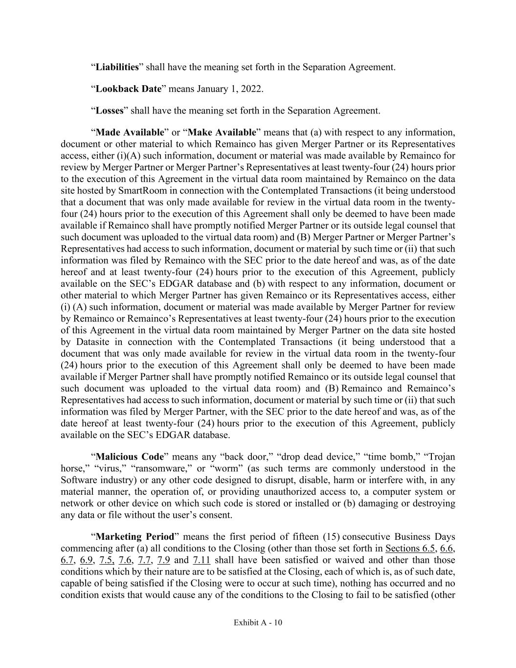 Exhibit A - 10 “Liabilities” shall have the meaning set forth in the Separation Agreement. “Lookback Date” means January 1, 2022. “Losses” shall have the meaning set forth in the Separation Agreement. “Made Available” or “Make Available” means that (a) with respect to any information, document or other material to which Remainco has given Merger Partner or its Representatives access, either (i)(A) such information, document or material was made available by Remainco for review by Merger Partner or Merger Partner’s Representatives at least twenty-four (24) hours prior to the execution of this Agreement in the virtual data room maintained by Remainco on the data site hosted by SmartRoom in connection with the Contemplated Transactions (it being understood that a document that was only made available for review in the virtual data room in the twenty- four (24) hours prior to the execution of this Agreement shall only be deemed to have been made available if Remainco shall have promptly notified Merger Partner or its outside legal counsel that such document was uploaded to the virtual data room) and (B) Merger Partner or Merger Partner’s Representatives had access to such information, document or material by such time or (ii) that such information was filed by Remainco with the SEC prior to the date hereof and was, as of the date hereof and at least twenty-four (24) hours prior to the execution of this Agreement, publicly available on the SEC’s EDGAR database and (b) with respect to any information, document or other material to which Merger Partner has given Remainco or its Representatives access, either (i) (A) such information, document or material was made available by Merger Partner for review by Remainco or Remainco’s Representatives at least twenty-four (24) hours prior to the execution of this Agreement in the virtual data room maintained by Merger Partner on the data site hosted by Datasite in connection with the Contemplated Transactions (it being understood that a document that was only made available for review in the virtual data room in the twenty-four (24) hours prior to the execution of this Agreement shall only be deemed to have been made available if Merger Partner shall have promptly notified Remainco or its outside legal counsel that such document was uploaded to the virtual data room) and (B) Remainco and Remainco’s Representatives had access to such information, document or material by such time or (ii) that such information was filed by Merger Partner, with the SEC prior to the date hereof and was, as of the date hereof at least twenty-four (24) hours prior to the execution of this Agreement, publicly available on the SEC’s EDGAR database. “Malicious Code” means any “back door,” “drop dead device,” “time bomb,” “Trojan horse,” “virus,” “ransomware,” or “worm” (as such terms are commonly understood in the Software industry) or any other code designed to disrupt, disable, harm or interfere with, in any material manner, the operation of, or providing unauthorized access to, a computer system or network or other device on which such code is stored or installed or (b) damaging or destroying any data or file without the user’s consent. “Marketing Period” means the first period of fifteen (15) consecutive Business Days commencing after (a) all conditions to the Closing (other than those set forth in Sections 6.5, 6.6, 6.7, 6.9, 7.5, 7.6, 7.7, 7.9 and 7.11 shall have been satisfied or waived and other than those conditions which by their nature are to be satisfied at the Closing, each of which is, as of such date, capable of being satisfied if the Closing were to occur at such time), nothing has occurred and no condition exists that would cause any of the conditions to the Closing to fail to be satisfied (other