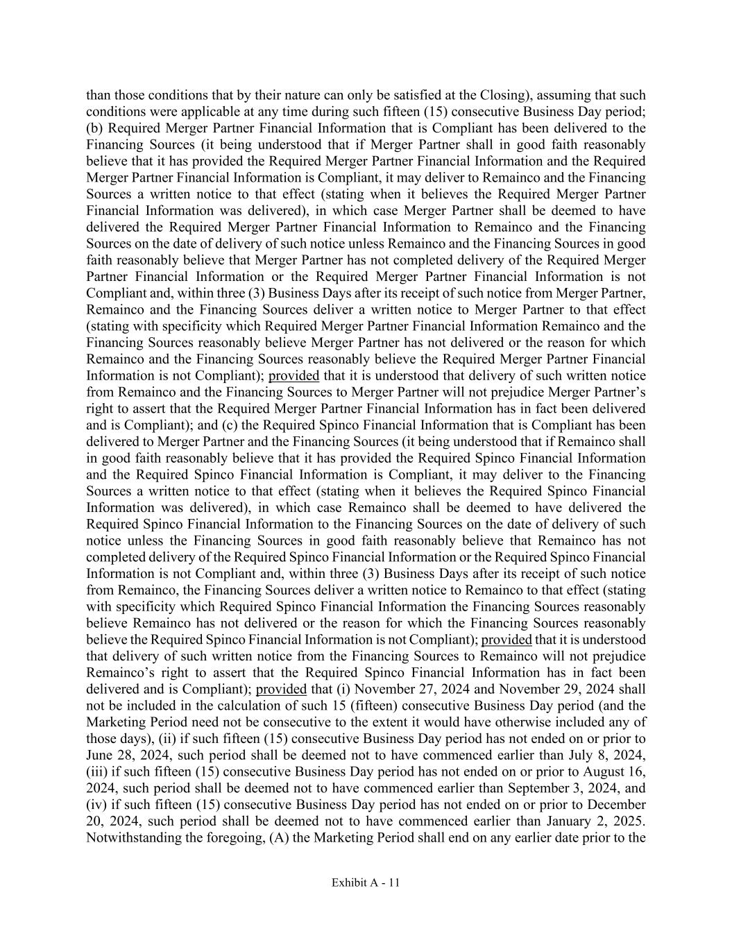Exhibit A - 11 than those conditions that by their nature can only be satisfied at the Closing), assuming that such conditions were applicable at any time during such fifteen (15) consecutive Business Day period; (b) Required Merger Partner Financial Information that is Compliant has been delivered to the Financing Sources (it being understood that if Merger Partner shall in good faith reasonably believe that it has provided the Required Merger Partner Financial Information and the Required Merger Partner Financial Information is Compliant, it may deliver to Remainco and the Financing Sources a written notice to that effect (stating when it believes the Required Merger Partner Financial Information was delivered), in which case Merger Partner shall be deemed to have delivered the Required Merger Partner Financial Information to Remainco and the Financing Sources on the date of delivery of such notice unless Remainco and the Financing Sources in good faith reasonably believe that Merger Partner has not completed delivery of the Required Merger Partner Financial Information or the Required Merger Partner Financial Information is not Compliant and, within three (3) Business Days after its receipt of such notice from Merger Partner, Remainco and the Financing Sources deliver a written notice to Merger Partner to that effect (stating with specificity which Required Merger Partner Financial Information Remainco and the Financing Sources reasonably believe Merger Partner has not delivered or the reason for which Remainco and the Financing Sources reasonably believe the Required Merger Partner Financial Information is not Compliant); provided that it is understood that delivery of such written notice from Remainco and the Financing Sources to Merger Partner will not prejudice Merger Partner’s right to assert that the Required Merger Partner Financial Information has in fact been delivered and is Compliant); and (c) the Required Spinco Financial Information that is Compliant has been delivered to Merger Partner and the Financing Sources (it being understood that if Remainco shall in good faith reasonably believe that it has provided the Required Spinco Financial Information and the Required Spinco Financial Information is Compliant, it may deliver to the Financing Sources a written notice to that effect (stating when it believes the Required Spinco Financial Information was delivered), in which case Remainco shall be deemed to have delivered the Required Spinco Financial Information to the Financing Sources on the date of delivery of such notice unless the Financing Sources in good faith reasonably believe that Remainco has not completed delivery of the Required Spinco Financial Information or the Required Spinco Financial Information is not Compliant and, within three (3) Business Days after its receipt of such notice from Remainco, the Financing Sources deliver a written notice to Remainco to that effect (stating with specificity which Required Spinco Financial Information the Financing Sources reasonably believe Remainco has not delivered or the reason for which the Financing Sources reasonably believe the Required Spinco Financial Information is not Compliant); provided that it is understood that delivery of such written notice from the Financing Sources to Remainco will not prejudice Remainco’s right to assert that the Required Spinco Financial Information has in fact been delivered and is Compliant); provided that (i) November 27, 2024 and November 29, 2024 shall not be included in the calculation of such 15 (fifteen) consecutive Business Day period (and the Marketing Period need not be consecutive to the extent it would have otherwise included any of those days), (ii) if such fifteen (15) consecutive Business Day period has not ended on or prior to June 28, 2024, such period shall be deemed not to have commenced earlier than July 8, 2024, (iii) if such fifteen (15) consecutive Business Day period has not ended on or prior to August 16, 2024, such period shall be deemed not to have commenced earlier than September 3, 2024, and (iv) if such fifteen (15) consecutive Business Day period has not ended on or prior to December 20, 2024, such period shall be deemed not to have commenced earlier than January 2, 2025. Notwithstanding the foregoing, (A) the Marketing Period shall end on any earlier date prior to the