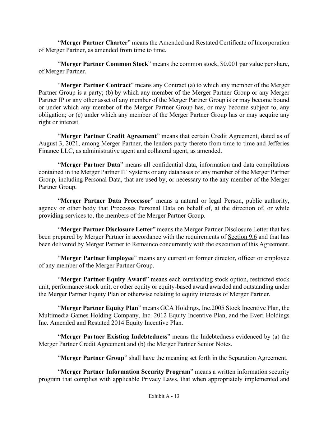 Exhibit A - 13 “Merger Partner Charter” means the Amended and Restated Certificate of Incorporation of Merger Partner, as amended from time to time. “Merger Partner Common Stock” means the common stock, $0.001 par value per share, of Merger Partner. “Merger Partner Contract” means any Contract (a) to which any member of the Merger Partner Group is a party; (b) by which any member of the Merger Partner Group or any Merger Partner IP or any other asset of any member of the Merger Partner Group is or may become bound or under which any member of the Merger Partner Group has, or may become subject to, any obligation; or (c) under which any member of the Merger Partner Group has or may acquire any right or interest. “Merger Partner Credit Agreement” means that certain Credit Agreement, dated as of August 3, 2021, among Merger Partner, the lenders party thereto from time to time and Jefferies Finance LLC, as administrative agent and collateral agent, as amended. “Merger Partner Data” means all confidential data, information and data compilations contained in the Merger Partner IT Systems or any databases of any member of the Merger Partner Group, including Personal Data, that are used by, or necessary to the any member of the Merger Partner Group. “Merger Partner Data Processor” means a natural or legal Person, public authority, agency or other body that Processes Personal Data on behalf of, at the direction of, or while providing services to, the members of the Merger Partner Group. “Merger Partner Disclosure Letter” means the Merger Partner Disclosure Letter that has been prepared by Merger Partner in accordance with the requirements of Section 9.6 and that has been delivered by Merger Partner to Remainco concurrently with the execution of this Agreement. “Merger Partner Employee” means any current or former director, officer or employee of any member of the Merger Partner Group. “Merger Partner Equity Award” means each outstanding stock option, restricted stock unit, performance stock unit, or other equity or equity-based award awarded and outstanding under the Merger Partner Equity Plan or otherwise relating to equity interests of Merger Partner. “Merger Partner Equity Plan” means GCA Holdings, Inc.2005 Stock Incentive Plan, the Multimedia Games Holding Company, Inc. 2012 Equity Incentive Plan, and the Everi Holdings Inc. Amended and Restated 2014 Equity Incentive Plan. “Merger Partner Existing Indebtedness” means the Indebtedness evidenced by (a) the Merger Partner Credit Agreement and (b) the Merger Partner Senior Notes. “Merger Partner Group” shall have the meaning set forth in the Separation Agreement. “Merger Partner Information Security Program” means a written information security program that complies with applicable Privacy Laws, that when appropriately implemented and