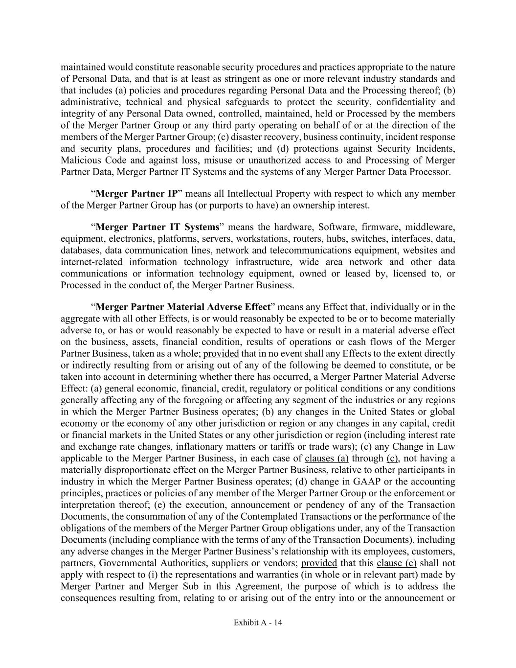 Exhibit A - 14 maintained would constitute reasonable security procedures and practices appropriate to the nature of Personal Data, and that is at least as stringent as one or more relevant industry standards and that includes (a) policies and procedures regarding Personal Data and the Processing thereof; (b) administrative, technical and physical safeguards to protect the security, confidentiality and integrity of any Personal Data owned, controlled, maintained, held or Processed by the members of the Merger Partner Group or any third party operating on behalf of or at the direction of the members of the Merger Partner Group; (c) disaster recovery, business continuity, incident response and security plans, procedures and facilities; and (d) protections against Security Incidents, Malicious Code and against loss, misuse or unauthorized access to and Processing of Merger Partner Data, Merger Partner IT Systems and the systems of any Merger Partner Data Processor. “Merger Partner IP” means all Intellectual Property with respect to which any member of the Merger Partner Group has (or purports to have) an ownership interest. “Merger Partner IT Systems” means the hardware, Software, firmware, middleware, equipment, electronics, platforms, servers, workstations, routers, hubs, switches, interfaces, data, databases, data communication lines, network and telecommunications equipment, websites and internet-related information technology infrastructure, wide area network and other data communications or information technology equipment, owned or leased by, licensed to, or Processed in the conduct of, the Merger Partner Business. “Merger Partner Material Adverse Effect” means any Effect that, individually or in the aggregate with all other Effects, is or would reasonably be expected to be or to become materially adverse to, or has or would reasonably be expected to have or result in a material adverse effect on the business, assets, financial condition, results of operations or cash flows of the Merger Partner Business, taken as a whole; provided that in no event shall any Effects to the extent directly or indirectly resulting from or arising out of any of the following be deemed to constitute, or be taken into account in determining whether there has occurred, a Merger Partner Material Adverse Effect: (a) general economic, financial, credit, regulatory or political conditions or any conditions generally affecting any of the foregoing or affecting any segment of the industries or any regions in which the Merger Partner Business operates; (b) any changes in the United States or global economy or the economy of any other jurisdiction or region or any changes in any capital, credit or financial markets in the United States or any other jurisdiction or region (including interest rate and exchange rate changes, inflationary matters or tariffs or trade wars); (c) any Change in Law applicable to the Merger Partner Business, in each case of clauses (a) through (c), not having a materially disproportionate effect on the Merger Partner Business, relative to other participants in industry in which the Merger Partner Business operates; (d) change in GAAP or the accounting principles, practices or policies of any member of the Merger Partner Group or the enforcement or interpretation thereof; (e) the execution, announcement or pendency of any of the Transaction Documents, the consummation of any of the Contemplated Transactions or the performance of the obligations of the members of the Merger Partner Group obligations under, any of the Transaction Documents (including compliance with the terms of any of the Transaction Documents), including any adverse changes in the Merger Partner Business’s relationship with its employees, customers, partners, Governmental Authorities, suppliers or vendors; provided that this clause (e) shall not apply with respect to (i) the representations and warranties (in whole or in relevant part) made by Merger Partner and Merger Sub in this Agreement, the purpose of which is to address the consequences resulting from, relating to or arising out of the entry into or the announcement or