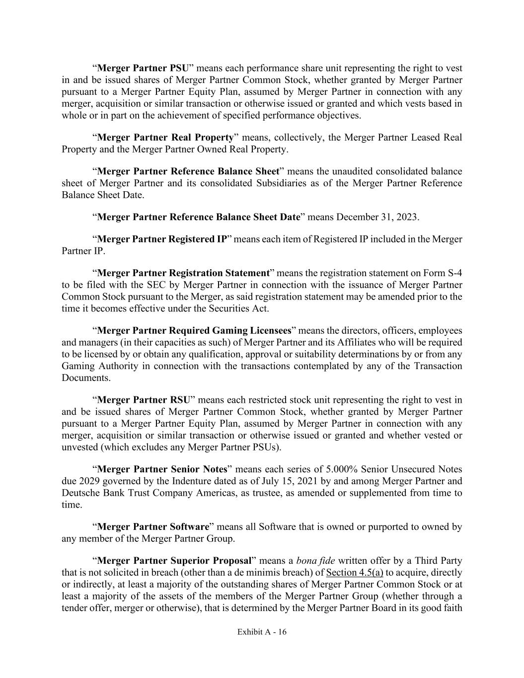 Exhibit A - 16 “Merger Partner PSU” means each performance share unit representing the right to vest in and be issued shares of Merger Partner Common Stock, whether granted by Merger Partner pursuant to a Merger Partner Equity Plan, assumed by Merger Partner in connection with any merger, acquisition or similar transaction or otherwise issued or granted and which vests based in whole or in part on the achievement of specified performance objectives. “Merger Partner Real Property” means, collectively, the Merger Partner Leased Real Property and the Merger Partner Owned Real Property. “Merger Partner Reference Balance Sheet” means the unaudited consolidated balance sheet of Merger Partner and its consolidated Subsidiaries as of the Merger Partner Reference Balance Sheet Date. “Merger Partner Reference Balance Sheet Date” means December 31, 2023. “Merger Partner Registered IP” means each item of Registered IP included in the Merger Partner IP. “Merger Partner Registration Statement” means the registration statement on Form S-4 to be filed with the SEC by Merger Partner in connection with the issuance of Merger Partner Common Stock pursuant to the Merger, as said registration statement may be amended prior to the time it becomes effective under the Securities Act. “Merger Partner Required Gaming Licensees” means the directors, officers, employees and managers (in their capacities as such) of Merger Partner and its Affiliates who will be required to be licensed by or obtain any qualification, approval or suitability determinations by or from any Gaming Authority in connection with the transactions contemplated by any of the Transaction Documents. “Merger Partner RSU” means each restricted stock unit representing the right to vest in and be issued shares of Merger Partner Common Stock, whether granted by Merger Partner pursuant to a Merger Partner Equity Plan, assumed by Merger Partner in connection with any merger, acquisition or similar transaction or otherwise issued or granted and whether vested or unvested (which excludes any Merger Partner PSUs). “Merger Partner Senior Notes” means each series of 5.000% Senior Unsecured Notes due 2029 governed by the Indenture dated as of July 15, 2021 by and among Merger Partner and Deutsche Bank Trust Company Americas, as trustee, as amended or supplemented from time to time. “Merger Partner Software” means all Software that is owned or purported to owned by any member of the Merger Partner Group. “Merger Partner Superior Proposal” means a bona fide written offer by a Third Party that is not solicited in breach (other than a de minimis breach) of Section 4.5(a) to acquire, directly or indirectly, at least a majority of the outstanding shares of Merger Partner Common Stock or at least a majority of the assets of the members of the Merger Partner Group (whether through a tender offer, merger or otherwise), that is determined by the Merger Partner Board in its good faith