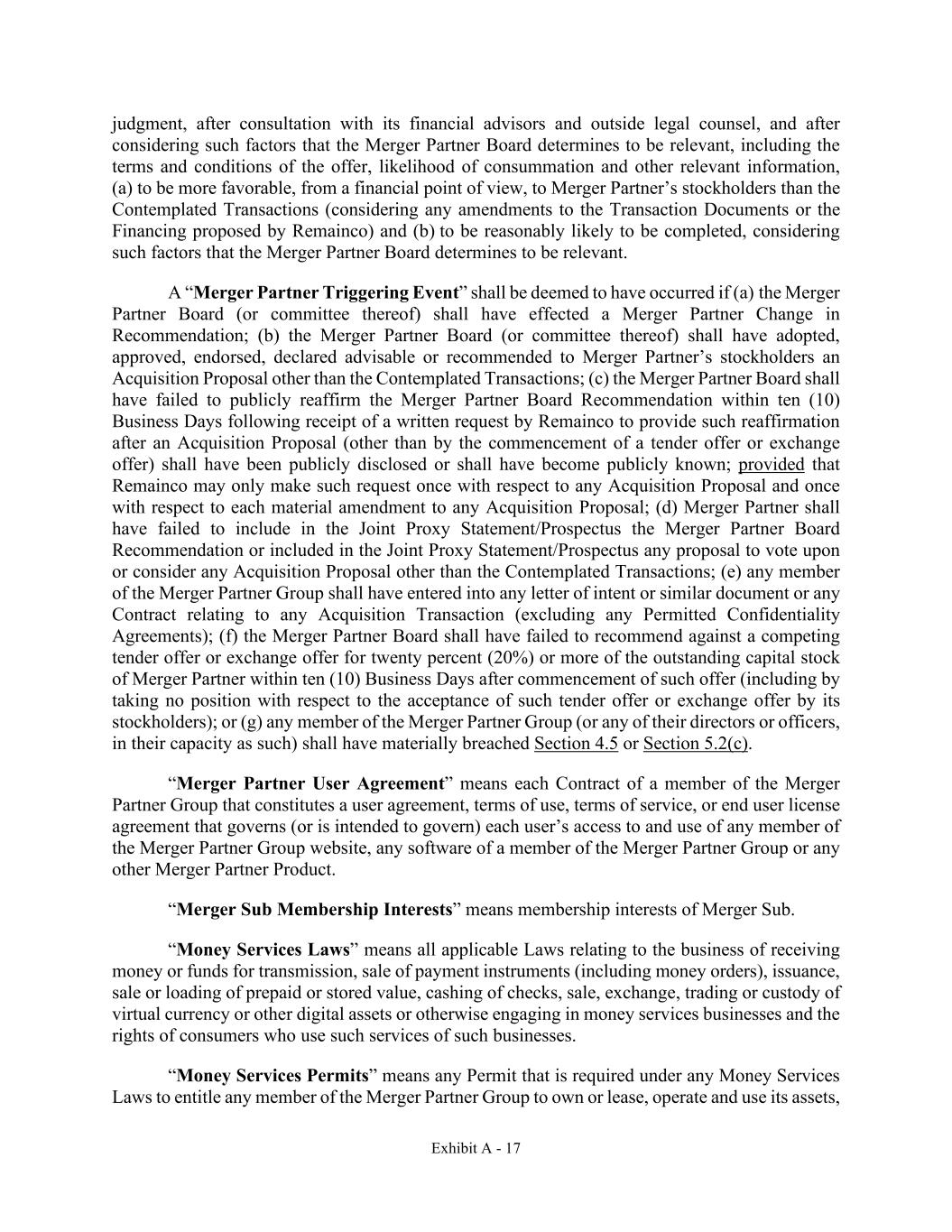 Exhibit A - 17 judgment, after consultation with its financial advisors and outside legal counsel, and after considering such factors that the Merger Partner Board determines to be relevant, including the terms and conditions of the offer, likelihood of consummation and other relevant information, (a) to be more favorable, from a financial point of view, to Merger Partner’s stockholders than the Contemplated Transactions (considering any amendments to the Transaction Documents or the Financing proposed by Remainco) and (b) to be reasonably likely to be completed, considering such factors that the Merger Partner Board determines to be relevant. A “Merger Partner Triggering Event” shall be deemed to have occurred if (a) the Merger Partner Board (or committee thereof) shall have effected a Merger Partner Change in Recommendation; (b) the Merger Partner Board (or committee thereof) shall have adopted, approved, endorsed, declared advisable or recommended to Merger Partner’s stockholders an Acquisition Proposal other than the Contemplated Transactions; (c) the Merger Partner Board shall have failed to publicly reaffirm the Merger Partner Board Recommendation within ten (10) Business Days following receipt of a written request by Remainco to provide such reaffirmation after an Acquisition Proposal (other than by the commencement of a tender offer or exchange offer) shall have been publicly disclosed or shall have become publicly known; provided that Remainco may only make such request once with respect to any Acquisition Proposal and once with respect to each material amendment to any Acquisition Proposal; (d) Merger Partner shall have failed to include in the Joint Proxy Statement/Prospectus the Merger Partner Board Recommendation or included in the Joint Proxy Statement/Prospectus any proposal to vote upon or consider any Acquisition Proposal other than the Contemplated Transactions; (e) any member of the Merger Partner Group shall have entered into any letter of intent or similar document or any Contract relating to any Acquisition Transaction (excluding any Permitted Confidentiality Agreements); (f) the Merger Partner Board shall have failed to recommend against a competing tender offer or exchange offer for twenty percent (20%) or more of the outstanding capital stock of Merger Partner within ten (10) Business Days after commencement of such offer (including by taking no position with respect to the acceptance of such tender offer or exchange offer by its stockholders); or (g) any member of the Merger Partner Group (or any of their directors or officers, in their capacity as such) shall have materially breached Section 4.5 or Section 5.2(c). “Merger Partner User Agreement” means each Contract of a member of the Merger Partner Group that constitutes a user agreement, terms of use, terms of service, or end user license agreement that governs (or is intended to govern) each user’s access to and use of any member of the Merger Partner Group website, any software of a member of the Merger Partner Group or any other Merger Partner Product. “Merger Sub Membership Interests” means membership interests of Merger Sub. “Money Services Laws” means all applicable Laws relating to the business of receiving money or funds for transmission, sale of payment instruments (including money orders), issuance, sale or loading of prepaid or stored value, cashing of checks, sale, exchange, trading or custody of virtual currency or other digital assets or otherwise engaging in money services businesses and the rights of consumers who use such services of such businesses. “Money Services Permits” means any Permit that is required under any Money Services Laws to entitle any member of the Merger Partner Group to own or lease, operate and use its assets,