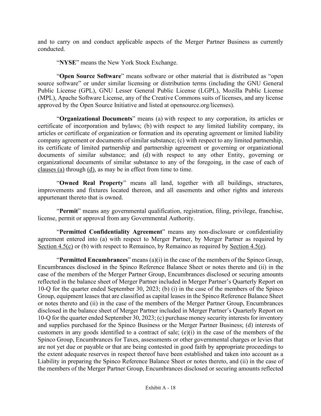 Exhibit A - 18 and to carry on and conduct applicable aspects of the Merger Partner Business as currently conducted. “NYSE” means the New York Stock Exchange. “Open Source Software” means software or other material that is distributed as “open source software” or under similar licensing or distribution terms (including the GNU General Public License (GPL), GNU Lesser General Public License (LGPL), Mozilla Public License (MPL), Apache Software License, any of the Creative Commons suits of licenses, and any license approved by the Open Source Initiative and listed at opensource.org/licenses). “Organizational Documents” means (a) with respect to any corporation, its articles or certificate of incorporation and bylaws; (b) with respect to any limited liability company, its articles or certificate of organization or formation and its operating agreement or limited liability company agreement or documents of similar substance; (c) with respect to any limited partnership, its certificate of limited partnership and partnership agreement or governing or organizational documents of similar substance; and (d) with respect to any other Entity, governing or organizational documents of similar substance to any of the foregoing, in the case of each of clauses (a) through (d), as may be in effect from time to time. “Owned Real Property” means all land, together with all buildings, structures, improvements and fixtures located thereon, and all easements and other rights and interests appurtenant thereto that is owned. “Permit” means any governmental qualification, registration, filing, privilege, franchise, license, permit or approval from any Governmental Authority. “Permitted Confidentiality Agreement” means any non-disclosure or confidentiality agreement entered into (a) with respect to Merger Partner, by Merger Partner as required by Section 4.5(c) or (b) with respect to Remainco, by Remainco as required by Section 4.5(e). “Permitted Encumbrances” means (a)(i) in the case of the members of the Spinco Group, Encumbrances disclosed in the Spinco Reference Balance Sheet or notes thereto and (ii) in the case of the members of the Merger Partner Group, Encumbrances disclosed or securing amounts reflected in the balance sheet of Merger Partner included in Merger Partner’s Quarterly Report on 10-Q for the quarter ended September 30, 2023; (b) (i) in the case of the members of the Spinco Group, equipment leases that are classified as capital leases in the Spinco Reference Balance Sheet or notes thereto and (ii) in the case of the members of the Merger Partner Group, Encumbrances disclosed in the balance sheet of Merger Partner included in Merger Partner’s Quarterly Report on 10-Q for the quarter ended September 30, 2023; (c) purchase money security interests for inventory and supplies purchased for the Spinco Business or the Merger Partner Business; (d) interests of customers in any goods identified to a contract of sale; (e)(i) in the case of the members of the Spinco Group, Encumbrances for Taxes, assessments or other governmental charges or levies that are not yet due or payable or that are being contested in good faith by appropriate proceedings to the extent adequate reserves in respect thereof have been established and taken into account as a Liability in preparing the Spinco Reference Balance Sheet or notes thereto, and (ii) in the case of the members of the Merger Partner Group, Encumbrances disclosed or securing amounts reflected