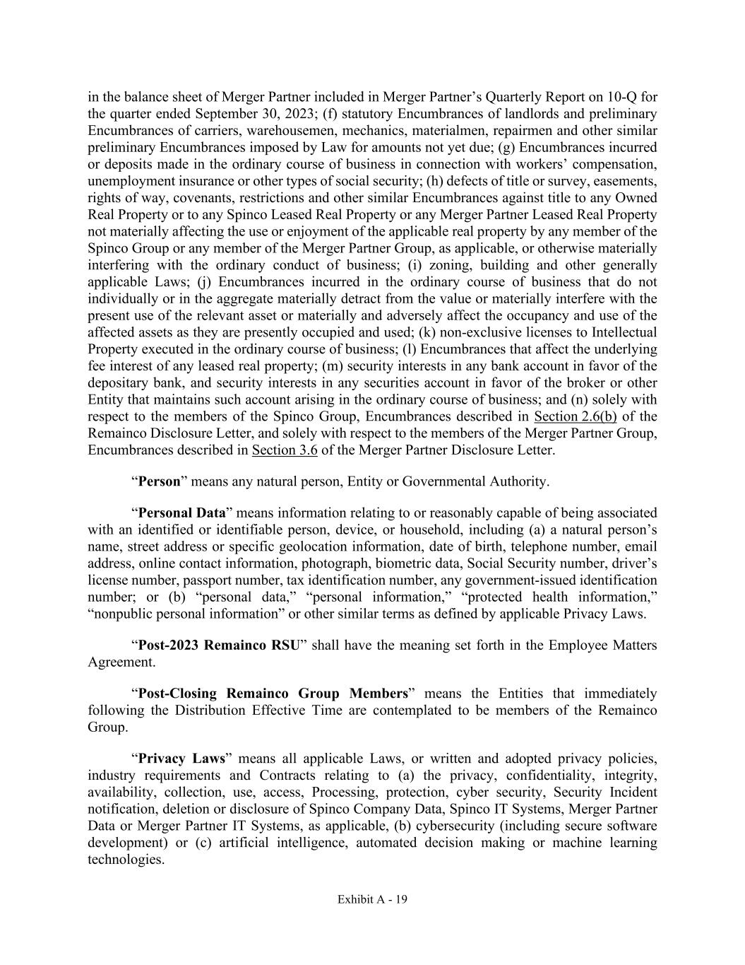 Exhibit A - 19 in the balance sheet of Merger Partner included in Merger Partner’s Quarterly Report on 10-Q for the quarter ended September 30, 2023; (f) statutory Encumbrances of landlords and preliminary Encumbrances of carriers, warehousemen, mechanics, materialmen, repairmen and other similar preliminary Encumbrances imposed by Law for amounts not yet due; (g) Encumbrances incurred or deposits made in the ordinary course of business in connection with workers’ compensation, unemployment insurance or other types of social security; (h) defects of title or survey, easements, rights of way, covenants, restrictions and other similar Encumbrances against title to any Owned Real Property or to any Spinco Leased Real Property or any Merger Partner Leased Real Property not materially affecting the use or enjoyment of the applicable real property by any member of the Spinco Group or any member of the Merger Partner Group, as applicable, or otherwise materially interfering with the ordinary conduct of business; (i) zoning, building and other generally applicable Laws; (j) Encumbrances incurred in the ordinary course of business that do not individually or in the aggregate materially detract from the value or materially interfere with the present use of the relevant asset or materially and adversely affect the occupancy and use of the affected assets as they are presently occupied and used; (k) non-exclusive licenses to Intellectual Property executed in the ordinary course of business; (l) Encumbrances that affect the underlying fee interest of any leased real property; (m) security interests in any bank account in favor of the depositary bank, and security interests in any securities account in favor of the broker or other Entity that maintains such account arising in the ordinary course of business; and (n) solely with respect to the members of the Spinco Group, Encumbrances described in Section 2.6(b) of the Remainco Disclosure Letter, and solely with respect to the members of the Merger Partner Group, Encumbrances described in Section 3.6 of the Merger Partner Disclosure Letter. “Person” means any natural person, Entity or Governmental Authority. “Personal Data” means information relating to or reasonably capable of being associated with an identified or identifiable person, device, or household, including (a) a natural person’s name, street address or specific geolocation information, date of birth, telephone number, email address, online contact information, photograph, biometric data, Social Security number, driver’s license number, passport number, tax identification number, any government-issued identification number; or (b) “personal data,” “personal information,” “protected health information,” “nonpublic personal information” or other similar terms as defined by applicable Privacy Laws. “Post-2023 Remainco RSU” shall have the meaning set forth in the Employee Matters Agreement. “Post-Closing Remainco Group Members” means the Entities that immediately following the Distribution Effective Time are contemplated to be members of the Remainco Group. “Privacy Laws” means all applicable Laws, or written and adopted privacy policies, industry requirements and Contracts relating to (a) the privacy, confidentiality, integrity, availability, collection, use, access, Processing, protection, cyber security, Security Incident notification, deletion or disclosure of Spinco Company Data, Spinco IT Systems, Merger Partner Data or Merger Partner IT Systems, as applicable, (b) cybersecurity (including secure software development) or (c) artificial intelligence, automated decision making or machine learning technologies.