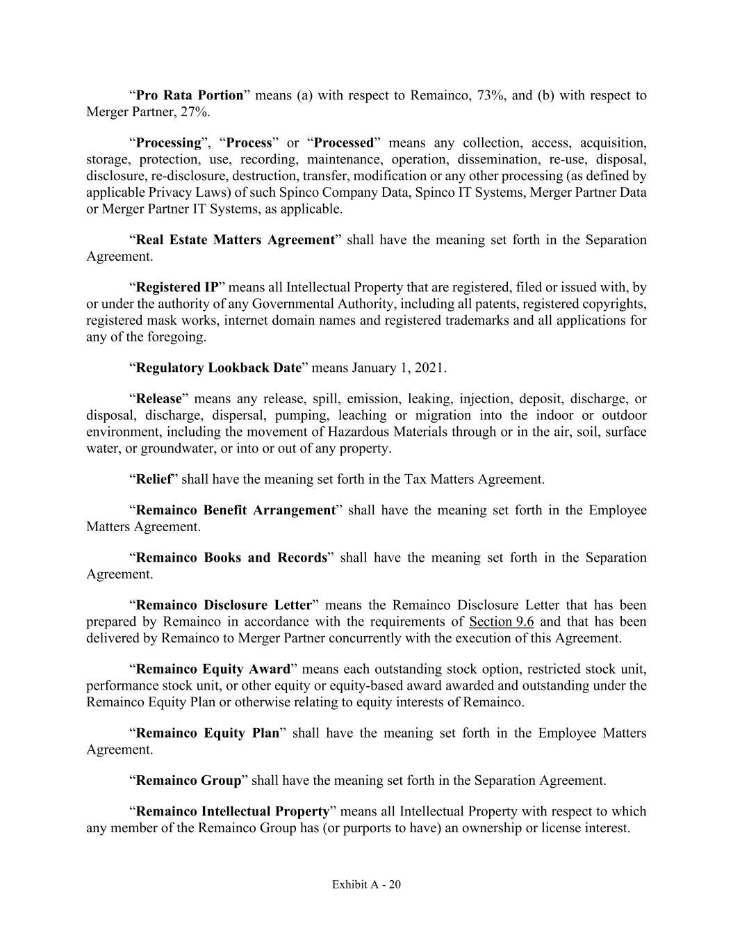 Exhibit A - 20 “Pro Rata Portion” means (a) with respect to Remainco, 73%, and (b) with respect to Merger Partner, 27%. “Processing”, “Process” or “Processed” means any collection, access, acquisition, storage, protection, use, recording, maintenance, operation, dissemination, re-use, disposal, disclosure, re-disclosure, destruction, transfer, modification or any other processing (as defined by applicable Privacy Laws) of such Spinco Company Data, Spinco IT Systems, Merger Partner Data or Merger Partner IT Systems, as applicable. “Real Estate Matters Agreement” shall have the meaning set forth in the Separation Agreement. “Registered IP” means all Intellectual Property that are registered, filed or issued with, by or under the authority of any Governmental Authority, including all patents, registered copyrights, registered mask works, internet domain names and registered trademarks and all applications for any of the foregoing. “Regulatory Lookback Date” means January 1, 2021. “Release” means any release, spill, emission, leaking, injection, deposit, discharge, or disposal, discharge, dispersal, pumping, leaching or migration into the indoor or outdoor environment, including the movement of Hazardous Materials through or in the air, soil, surface water, or groundwater, or into or out of any property. “Relief” shall have the meaning set forth in the Tax Matters Agreement. “Remainco Benefit Arrangement” shall have the meaning set forth in the Employee Matters Agreement. “Remainco Books and Records” shall have the meaning set forth in the Separation Agreement. “Remainco Disclosure Letter” means the Remainco Disclosure Letter that has been prepared by Remainco in accordance with the requirements of Section 9.6 and that has been delivered by Remainco to Merger Partner concurrently with the execution of this Agreement. “Remainco Equity Award” means each outstanding stock option, restricted stock unit, performance stock unit, or other equity or equity-based award awarded and outstanding under the Remainco Equity Plan or otherwise relating to equity interests of Remainco. “Remainco Equity Plan” shall have the meaning set forth in the Employee Matters Agreement. “Remainco Group” shall have the meaning set forth in the Separation Agreement. “Remainco Intellectual Property” means all Intellectual Property with respect to which any member of the Remainco Group has (or purports to have) an ownership or license interest.
