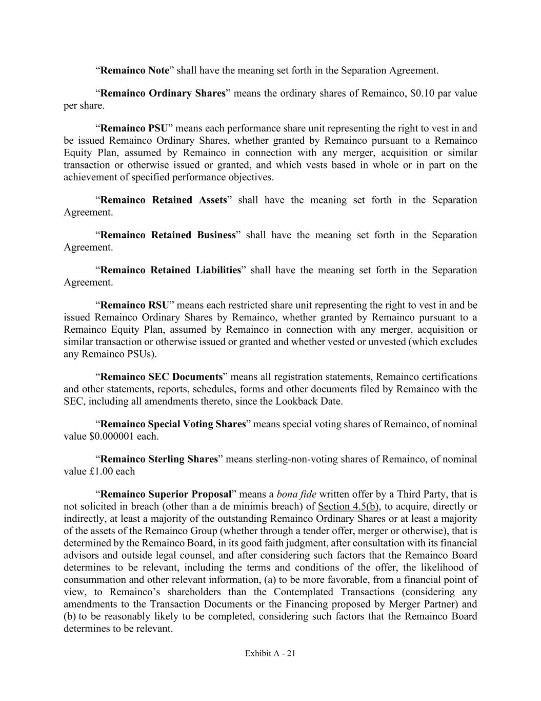 Exhibit A - 21 “Remainco Note” shall have the meaning set forth in the Separation Agreement. “Remainco Ordinary Shares” means the ordinary shares of Remainco, $0.10 par value per share. “Remainco PSU” means each performance share unit representing the right to vest in and be issued Remainco Ordinary Shares, whether granted by Remainco pursuant to a Remainco Equity Plan, assumed by Remainco in connection with any merger, acquisition or similar transaction or otherwise issued or granted, and which vests based in whole or in part on the achievement of specified performance objectives. “Remainco Retained Assets” shall have the meaning set forth in the Separation Agreement. “Remainco Retained Business” shall have the meaning set forth in the Separation Agreement. “Remainco Retained Liabilities” shall have the meaning set forth in the Separation Agreement. “Remainco RSU” means each restricted share unit representing the right to vest in and be issued Remainco Ordinary Shares by Remainco, whether granted by Remainco pursuant to a Remainco Equity Plan, assumed by Remainco in connection with any merger, acquisition or similar transaction or otherwise issued or granted and whether vested or unvested (which excludes any Remainco PSUs). “Remainco SEC Documents” means all registration statements, Remainco certifications and other statements, reports, schedules, forms and other documents filed by Remainco with the SEC, including all amendments thereto, since the Lookback Date. “Remainco Special Voting Shares” means special voting shares of Remainco, of nominal value $0.000001 each. “Remainco Sterling Shares” means sterling-non-voting shares of Remainco, of nominal value £1.00 each “Remainco Superior Proposal” means a bona fide written offer by a Third Party, that is not solicited in breach (other than a de minimis breach) of Section 4.5(b), to acquire, directly or indirectly, at least a majority of the outstanding Remainco Ordinary Shares or at least a majority of the assets of the Remainco Group (whether through a tender offer, merger or otherwise), that is determined by the Remainco Board, in its good faith judgment, after consultation with its financial advisors and outside legal counsel, and after considering such factors that the Remainco Board determines to be relevant, including the terms and conditions of the offer, the likelihood of consummation and other relevant information, (a) to be more favorable, from a financial point of view, to Remainco’s shareholders than the Contemplated Transactions (considering any amendments to the Transaction Documents or the Financing proposed by Merger Partner) and (b) to be reasonably likely to be completed, considering such factors that the Remainco Board determines to be relevant.