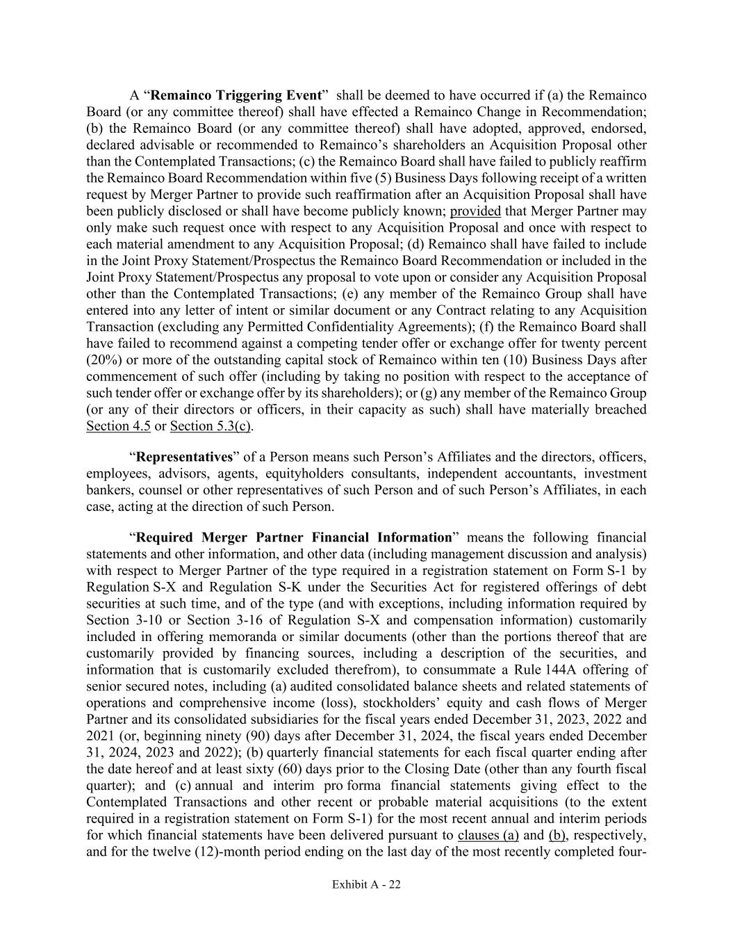 Exhibit A - 22 A “Remainco Triggering Event” shall be deemed to have occurred if (a) the Remainco Board (or any committee thereof) shall have effected a Remainco Change in Recommendation; (b) the Remainco Board (or any committee thereof) shall have adopted, approved, endorsed, declared advisable or recommended to Remainco’s shareholders an Acquisition Proposal other than the Contemplated Transactions; (c) the Remainco Board shall have failed to publicly reaffirm the Remainco Board Recommendation within five (5) Business Days following receipt of a written request by Merger Partner to provide such reaffirmation after an Acquisition Proposal shall have been publicly disclosed or shall have become publicly known; provided that Merger Partner may only make such request once with respect to any Acquisition Proposal and once with respect to each material amendment to any Acquisition Proposal; (d) Remainco shall have failed to include in the Joint Proxy Statement/Prospectus the Remainco Board Recommendation or included in the Joint Proxy Statement/Prospectus any proposal to vote upon or consider any Acquisition Proposal other than the Contemplated Transactions; (e) any member of the Remainco Group shall have entered into any letter of intent or similar document or any Contract relating to any Acquisition Transaction (excluding any Permitted Confidentiality Agreements); (f) the Remainco Board shall have failed to recommend against a competing tender offer or exchange offer for twenty percent (20%) or more of the outstanding capital stock of Remainco within ten (10) Business Days after commencement of such offer (including by taking no position with respect to the acceptance of such tender offer or exchange offer by its shareholders); or (g) any member of the Remainco Group (or any of their directors or officers, in their capacity as such) shall have materially breached Section 4.5 or Section 5.3(c). “Representatives” of a Person means such Person’s Affiliates and the directors, officers, employees, advisors, agents, equityholders consultants, independent accountants, investment bankers, counsel or other representatives of such Person and of such Person’s Affiliates, in each case, acting at the direction of such Person. “Required Merger Partner Financial Information” means the following financial statements and other information, and other data (including management discussion and analysis) with respect to Merger Partner of the type required in a registration statement on Form S-1 by Regulation S-X and Regulation S-K under the Securities Act for registered offerings of debt securities at such time, and of the type (and with exceptions, including information required by Section 3-10 or Section 3-16 of Regulation S-X and compensation information) customarily included in offering memoranda or similar documents (other than the portions thereof that are customarily provided by financing sources, including a description of the securities, and information that is customarily excluded therefrom), to consummate a Rule 144A offering of senior secured notes, including (a) audited consolidated balance sheets and related statements of operations and comprehensive income (loss), stockholders’ equity and cash flows of Merger Partner and its consolidated subsidiaries for the fiscal years ended December 31, 2023, 2022 and 2021 (or, beginning ninety (90) days after December 31, 2024, the fiscal years ended December 31, 2024, 2023 and 2022); (b) quarterly financial statements for each fiscal quarter ending after the date hereof and at least sixty (60) days prior to the Closing Date (other than any fourth fiscal quarter); and (c) annual and interim pro forma financial statements giving effect to the Contemplated Transactions and other recent or probable material acquisitions (to the extent required in a registration statement on Form S-1) for the most recent annual and interim periods for which financial statements have been delivered pursuant to clauses (a) and (b), respectively, and for the twelve (12)-month period ending on the last day of the most recently completed four-