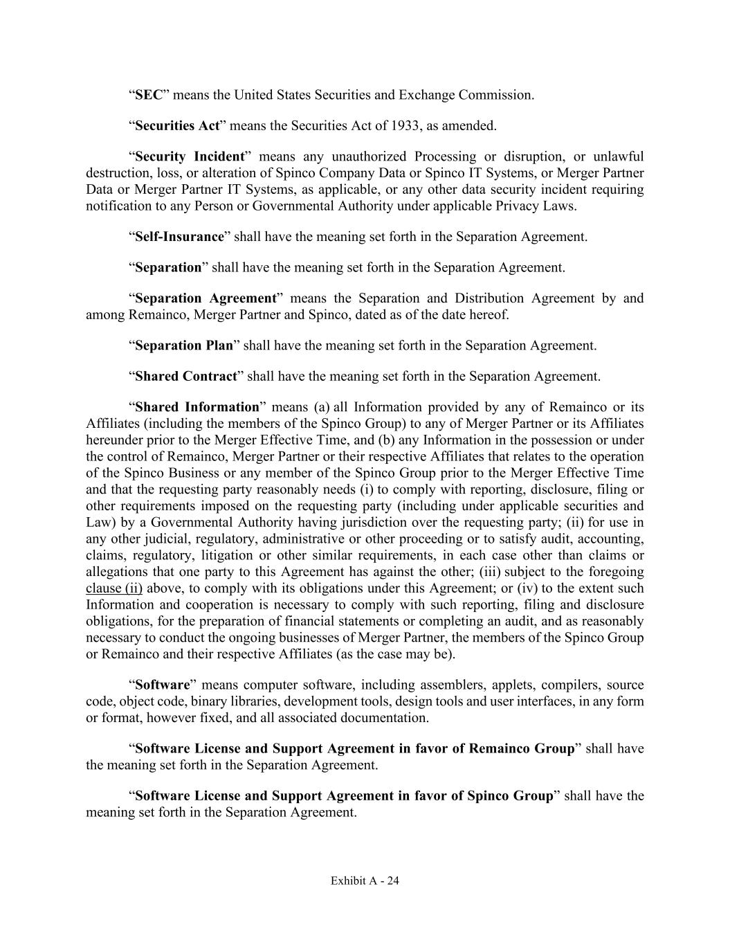 Exhibit A - 24 “SEC” means the United States Securities and Exchange Commission. “Securities Act” means the Securities Act of 1933, as amended. “Security Incident” means any unauthorized Processing or disruption, or unlawful destruction, loss, or alteration of Spinco Company Data or Spinco IT Systems, or Merger Partner Data or Merger Partner IT Systems, as applicable, or any other data security incident requiring notification to any Person or Governmental Authority under applicable Privacy Laws. “Self-Insurance” shall have the meaning set forth in the Separation Agreement. “Separation” shall have the meaning set forth in the Separation Agreement. “Separation Agreement” means the Separation and Distribution Agreement by and among Remainco, Merger Partner and Spinco, dated as of the date hereof. “Separation Plan” shall have the meaning set forth in the Separation Agreement. “Shared Contract” shall have the meaning set forth in the Separation Agreement. “Shared Information” means (a) all Information provided by any of Remainco or its Affiliates (including the members of the Spinco Group) to any of Merger Partner or its Affiliates hereunder prior to the Merger Effective Time, and (b) any Information in the possession or under the control of Remainco, Merger Partner or their respective Affiliates that relates to the operation of the Spinco Business or any member of the Spinco Group prior to the Merger Effective Time and that the requesting party reasonably needs (i) to comply with reporting, disclosure, filing or other requirements imposed on the requesting party (including under applicable securities and Law) by a Governmental Authority having jurisdiction over the requesting party; (ii) for use in any other judicial, regulatory, administrative or other proceeding or to satisfy audit, accounting, claims, regulatory, litigation or other similar requirements, in each case other than claims or allegations that one party to this Agreement has against the other; (iii) subject to the foregoing clause (ii) above, to comply with its obligations under this Agreement; or (iv) to the extent such Information and cooperation is necessary to comply with such reporting, filing and disclosure obligations, for the preparation of financial statements or completing an audit, and as reasonably necessary to conduct the ongoing businesses of Merger Partner, the members of the Spinco Group or Remainco and their respective Affiliates (as the case may be). “Software” means computer software, including assemblers, applets, compilers, source code, object code, binary libraries, development tools, design tools and user interfaces, in any form or format, however fixed, and all associated documentation. “Software License and Support Agreement in favor of Remainco Group” shall have the meaning set forth in the Separation Agreement. “Software License and Support Agreement in favor of Spinco Group” shall have the meaning set forth in the Separation Agreement.