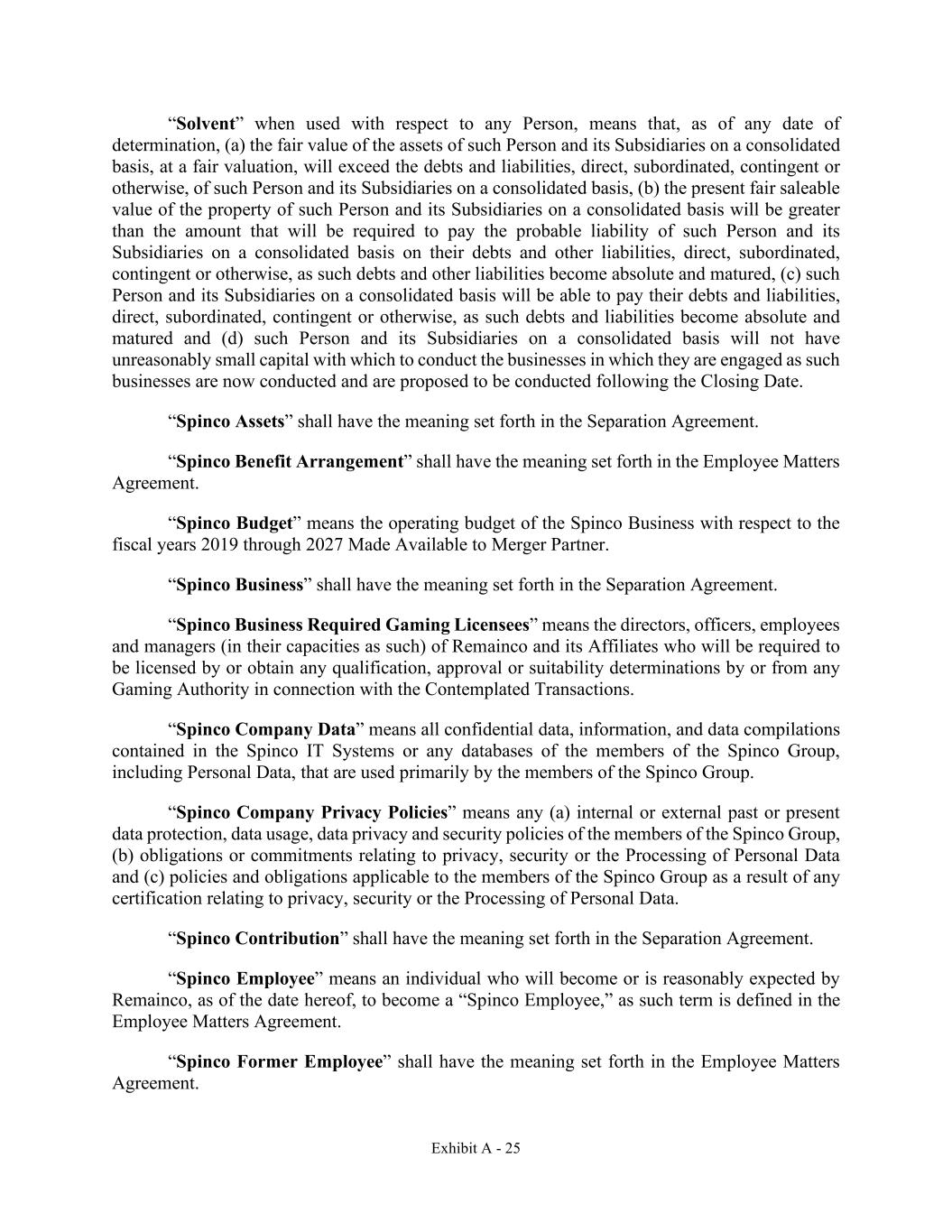 Exhibit A - 25 “Solvent” when used with respect to any Person, means that, as of any date of determination, (a) the fair value of the assets of such Person and its Subsidiaries on a consolidated basis, at a fair valuation, will exceed the debts and liabilities, direct, subordinated, contingent or otherwise, of such Person and its Subsidiaries on a consolidated basis, (b) the present fair saleable value of the property of such Person and its Subsidiaries on a consolidated basis will be greater than the amount that will be required to pay the probable liability of such Person and its Subsidiaries on a consolidated basis on their debts and other liabilities, direct, subordinated, contingent or otherwise, as such debts and other liabilities become absolute and matured, (c) such Person and its Subsidiaries on a consolidated basis will be able to pay their debts and liabilities, direct, subordinated, contingent or otherwise, as such debts and liabilities become absolute and matured and (d) such Person and its Subsidiaries on a consolidated basis will not have unreasonably small capital with which to conduct the businesses in which they are engaged as such businesses are now conducted and are proposed to be conducted following the Closing Date. “Spinco Assets” shall have the meaning set forth in the Separation Agreement. “Spinco Benefit Arrangement” shall have the meaning set forth in the Employee Matters Agreement. “Spinco Budget” means the operating budget of the Spinco Business with respect to the fiscal years 2019 through 2027 Made Available to Merger Partner. “Spinco Business” shall have the meaning set forth in the Separation Agreement. “Spinco Business Required Gaming Licensees” means the directors, officers, employees and managers (in their capacities as such) of Remainco and its Affiliates who will be required to be licensed by or obtain any qualification, approval or suitability determinations by or from any Gaming Authority in connection with the Contemplated Transactions. “Spinco Company Data” means all confidential data, information, and data compilations contained in the Spinco IT Systems or any databases of the members of the Spinco Group, including Personal Data, that are used primarily by the members of the Spinco Group. “Spinco Company Privacy Policies” means any (a) internal or external past or present data protection, data usage, data privacy and security policies of the members of the Spinco Group, (b) obligations or commitments relating to privacy, security or the Processing of Personal Data and (c) policies and obligations applicable to the members of the Spinco Group as a result of any certification relating to privacy, security or the Processing of Personal Data. “Spinco Contribution” shall have the meaning set forth in the Separation Agreement. “Spinco Employee” means an individual who will become or is reasonably expected by Remainco, as of the date hereof, to become a “Spinco Employee,” as such term is defined in the Employee Matters Agreement. “Spinco Former Employee” shall have the meaning set forth in the Employee Matters Agreement.