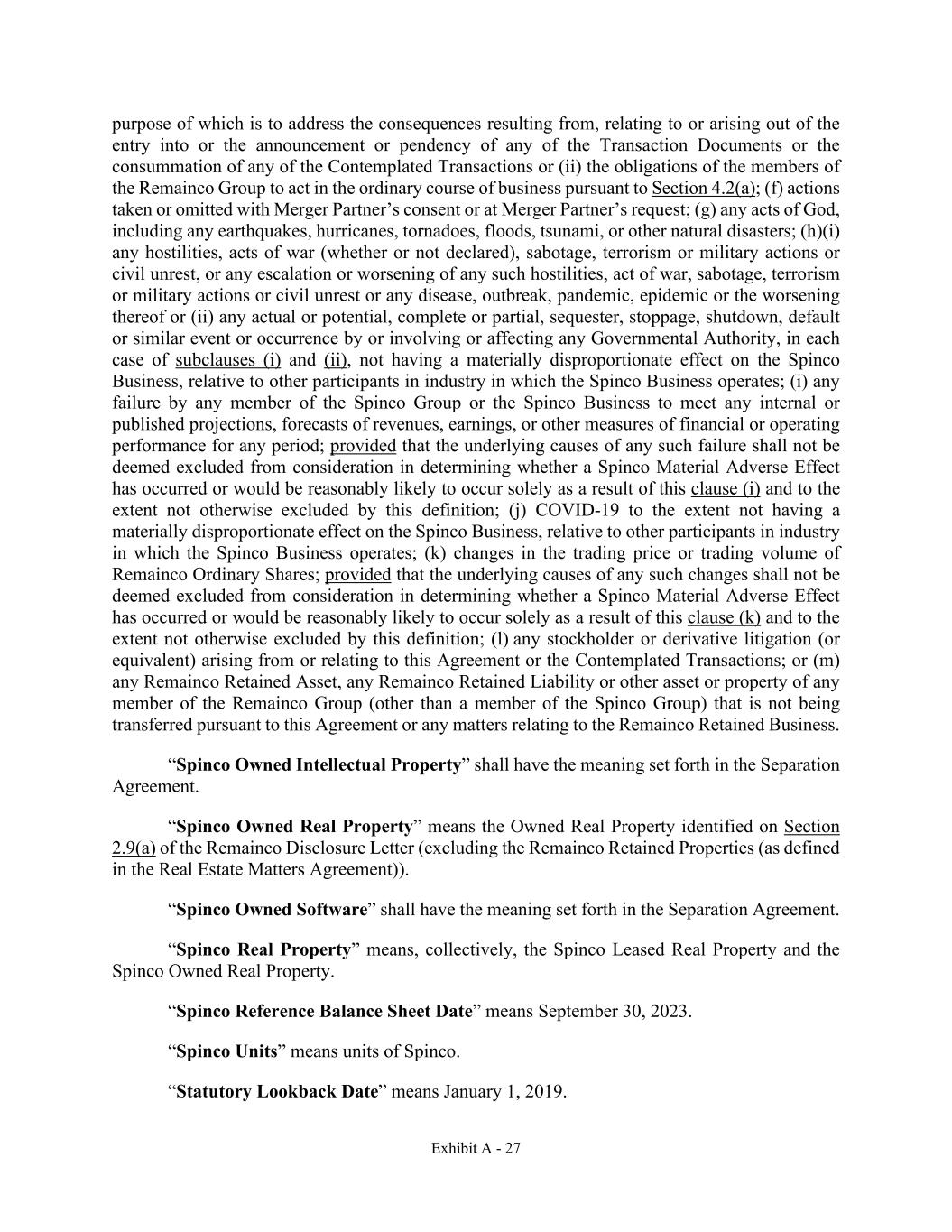 Exhibit A - 27 purpose of which is to address the consequences resulting from, relating to or arising out of the entry into or the announcement or pendency of any of the Transaction Documents or the consummation of any of the Contemplated Transactions or (ii) the obligations of the members of the Remainco Group to act in the ordinary course of business pursuant to Section 4.2(a); (f) actions taken or omitted with Merger Partner’s consent or at Merger Partner’s request; (g) any acts of God, including any earthquakes, hurricanes, tornadoes, floods, tsunami, or other natural disasters; (h)(i) any hostilities, acts of war (whether or not declared), sabotage, terrorism or military actions or civil unrest, or any escalation or worsening of any such hostilities, act of war, sabotage, terrorism or military actions or civil unrest or any disease, outbreak, pandemic, epidemic or the worsening thereof or (ii) any actual or potential, complete or partial, sequester, stoppage, shutdown, default or similar event or occurrence by or involving or affecting any Governmental Authority, in each case of subclauses (i) and (ii), not having a materially disproportionate effect on the Spinco Business, relative to other participants in industry in which the Spinco Business operates; (i) any failure by any member of the Spinco Group or the Spinco Business to meet any internal or published projections, forecasts of revenues, earnings, or other measures of financial or operating performance for any period; provided that the underlying causes of any such failure shall not be deemed excluded from consideration in determining whether a Spinco Material Adverse Effect has occurred or would be reasonably likely to occur solely as a result of this clause (i) and to the extent not otherwise excluded by this definition; (j) COVID-19 to the extent not having a materially disproportionate effect on the Spinco Business, relative to other participants in industry in which the Spinco Business operates; (k) changes in the trading price or trading volume of Remainco Ordinary Shares; provided that the underlying causes of any such changes shall not be deemed excluded from consideration in determining whether a Spinco Material Adverse Effect has occurred or would be reasonably likely to occur solely as a result of this clause (k) and to the extent not otherwise excluded by this definition; (l) any stockholder or derivative litigation (or equivalent) arising from or relating to this Agreement or the Contemplated Transactions; or (m) any Remainco Retained Asset, any Remainco Retained Liability or other asset or property of any member of the Remainco Group (other than a member of the Spinco Group) that is not being transferred pursuant to this Agreement or any matters relating to the Remainco Retained Business. “Spinco Owned Intellectual Property” shall have the meaning set forth in the Separation Agreement. “Spinco Owned Real Property” means the Owned Real Property identified on Section 2.9(a) of the Remainco Disclosure Letter (excluding the Remainco Retained Properties (as defined in the Real Estate Matters Agreement)). “Spinco Owned Software” shall have the meaning set forth in the Separation Agreement. “Spinco Real Property” means, collectively, the Spinco Leased Real Property and the Spinco Owned Real Property. “Spinco Reference Balance Sheet Date” means September 30, 2023. “Spinco Units” means units of Spinco. “Statutory Lookback Date” means January 1, 2019.