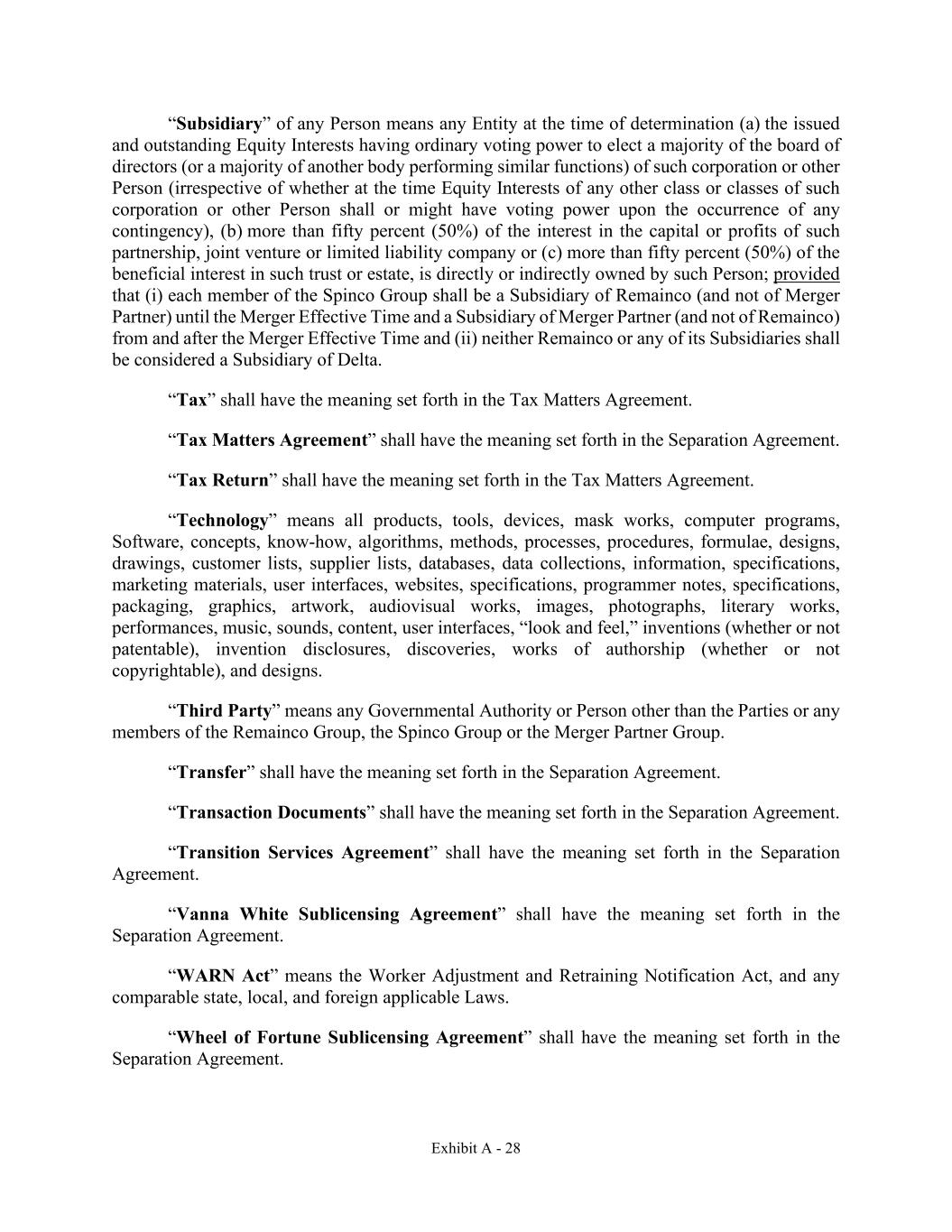 Exhibit A - 28 “Subsidiary” of any Person means any Entity at the time of determination (a) the issued and outstanding Equity Interests having ordinary voting power to elect a majority of the board of directors (or a majority of another body performing similar functions) of such corporation or other Person (irrespective of whether at the time Equity Interests of any other class or classes of such corporation or other Person shall or might have voting power upon the occurrence of any contingency), (b) more than fifty percent (50%) of the interest in the capital or profits of such partnership, joint venture or limited liability company or (c) more than fifty percent (50%) of the beneficial interest in such trust or estate, is directly or indirectly owned by such Person; provided that (i) each member of the Spinco Group shall be a Subsidiary of Remainco (and not of Merger Partner) until the Merger Effective Time and a Subsidiary of Merger Partner (and not of Remainco) from and after the Merger Effective Time and (ii) neither Remainco or any of its Subsidiaries shall be considered a Subsidiary of Delta. “Tax” shall have the meaning set forth in the Tax Matters Agreement. “Tax Matters Agreement” shall have the meaning set forth in the Separation Agreement. “Tax Return” shall have the meaning set forth in the Tax Matters Agreement. “Technology” means all products, tools, devices, mask works, computer programs, Software, concepts, know-how, algorithms, methods, processes, procedures, formulae, designs, drawings, customer lists, supplier lists, databases, data collections, information, specifications, marketing materials, user interfaces, websites, specifications, programmer notes, specifications, packaging, graphics, artwork, audiovisual works, images, photographs, literary works, performances, music, sounds, content, user interfaces, “look and feel,” inventions (whether or not patentable), invention disclosures, discoveries, works of authorship (whether or not copyrightable), and designs. “Third Party” means any Governmental Authority or Person other than the Parties or any members of the Remainco Group, the Spinco Group or the Merger Partner Group. “Transfer” shall have the meaning set forth in the Separation Agreement. “Transaction Documents” shall have the meaning set forth in the Separation Agreement. “Transition Services Agreement” shall have the meaning set forth in the Separation Agreement. “Vanna White Sublicensing Agreement” shall have the meaning set forth in the Separation Agreement. “WARN Act” means the Worker Adjustment and Retraining Notification Act, and any comparable state, local, and foreign applicable Laws. “Wheel of Fortune Sublicensing Agreement” shall have the meaning set forth in the Separation Agreement.