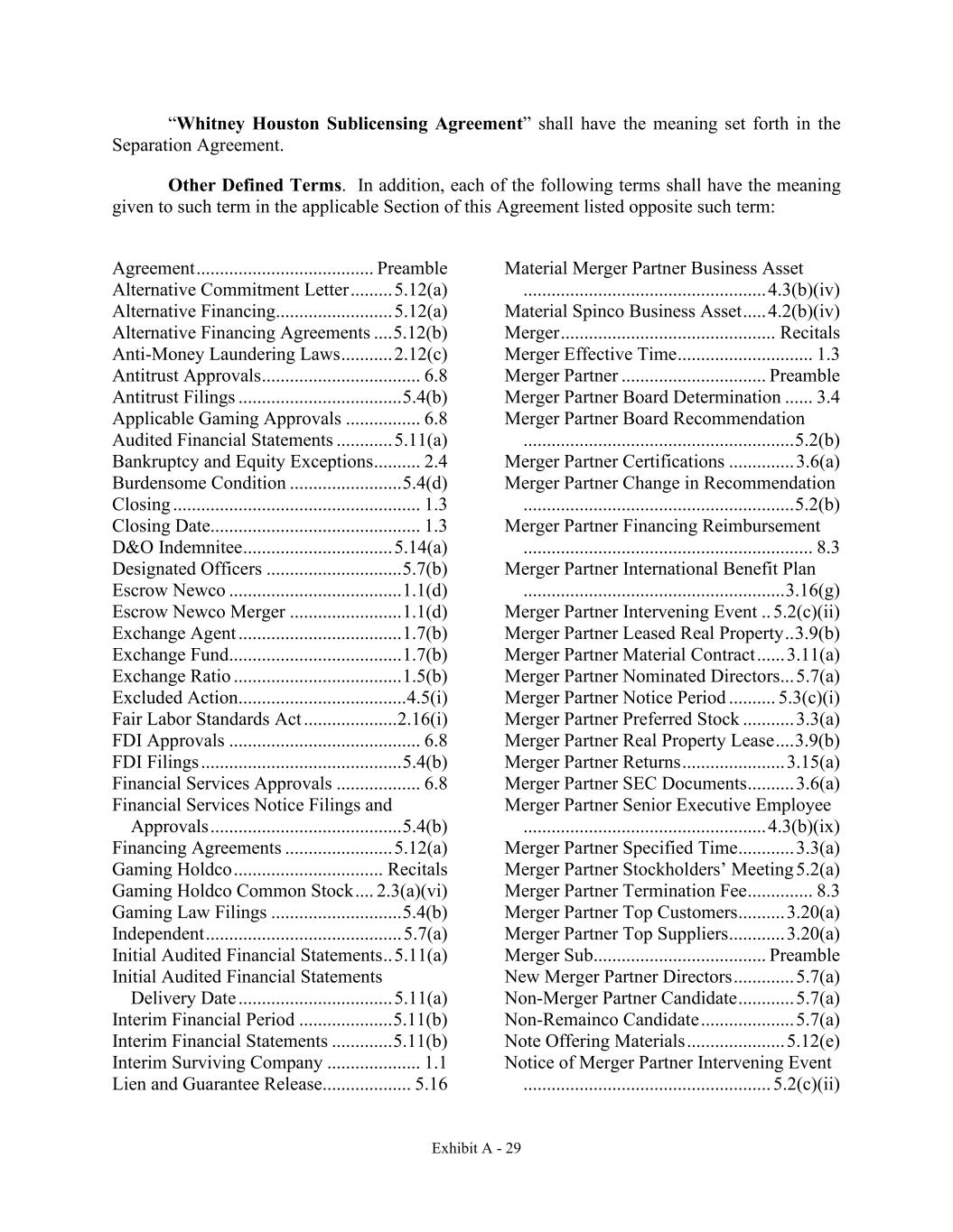 Exhibit A - 29 “Whitney Houston Sublicensing Agreement” shall have the meaning set forth in the Separation Agreement. Other Defined Terms. In addition, each of the following terms shall have the meaning given to such term in the applicable Section of this Agreement listed opposite such term: Agreement ...................................... Preamble Alternative Commitment Letter ......... 5.12(a) Alternative Financing......................... 5.12(a) Alternative Financing Agreements .... 5.12(b) Anti-Money Laundering Laws ........... 2.12(c) Antitrust Approvals .................................. 6.8 Antitrust Filings ................................... 5.4(b) Applicable Gaming Approvals ................ 6.8 Audited Financial Statements ............ 5.11(a) Bankruptcy and Equity Exceptions .......... 2.4 Burdensome Condition ........................ 5.4(d) Closing ..................................................... 1.3 Closing Date............................................. 1.3 D&O Indemnitee ................................ 5.14(a) Designated Officers ............................. 5.7(b) Escrow Newco ..................................... 1.1(d) Escrow Newco Merger ........................ 1.1(d) Exchange Agent ................................... 1.7(b) Exchange Fund..................................... 1.7(b) Exchange Ratio .................................... 1.5(b) Excluded Action.................................... 4.5(i) Fair Labor Standards Act .................... 2.16(i) FDI Approvals ......................................... 6.8 FDI Filings ........................................... 5.4(b) Financial Services Approvals .................. 6.8 Financial Services Notice Filings and Approvals ......................................... 5.4(b) Financing Agreements ....................... 5.12(a) Gaming Holdco ................................ Recitals Gaming Holdco Common Stock .... 2.3(a)(vi) Gaming Law Filings ............................ 5.4(b) Independent .......................................... 5.7(a) Initial Audited Financial Statements .. 5.11(a) Initial Audited Financial Statements Delivery Date ................................. 5.11(a) Interim Financial Period .................... 5.11(b) Interim Financial Statements ............. 5.11(b) Interim Surviving Company .................... 1.1 Lien and Guarantee Release................... 5.16 Material Merger Partner Business Asset .................................................... 4.3(b)(iv) Material Spinco Business Asset ..... 4.2(b)(iv) Merger .............................................. Recitals Merger Effective Time ............................. 1.3 Merger Partner ............................... Preamble Merger Partner Board Determination ...... 3.4 Merger Partner Board Recommendation .......................................................... 5.2(b) Merger Partner Certifications .............. 3.6(a) Merger Partner Change in Recommendation .......................................................... 5.2(b) Merger Partner Financing Reimbursement .............................................................. 8.3 Merger Partner International Benefit Plan ........................................................ 3.16(g) Merger Partner Intervening Event .. 5.2(c)(ii) Merger Partner Leased Real Property .. 3.9(b) Merger Partner Material Contract ...... 3.11(a) Merger Partner Nominated Directors ... 5.7(a) Merger Partner Notice Period .......... 5.3(c)(i) Merger Partner Preferred Stock ........... 3.3(a) Merger Partner Real Property Lease .... 3.9(b) Merger Partner Returns ...................... 3.15(a) Merger Partner SEC Documents .......... 3.6(a) Merger Partner Senior Executive Employee .................................................... 4.3(b)(ix) Merger Partner Specified Time ............ 3.3(a) Merger Partner Stockholders’ Meeting 5.2(a) Merger Partner Termination Fee .............. 8.3 Merger Partner Top Customers .......... 3.20(a) Merger Partner Top Suppliers ............ 3.20(a) Merger Sub..................................... Preamble New Merger Partner Directors ............. 5.7(a) Non-Merger Partner Candidate ............ 5.7(a) Non-Remainco Candidate .................... 5.7(a) Note Offering Materials ..................... 5.12(e) Notice of Merger Partner Intervening Event ..................................................... 5.2(c)(ii)