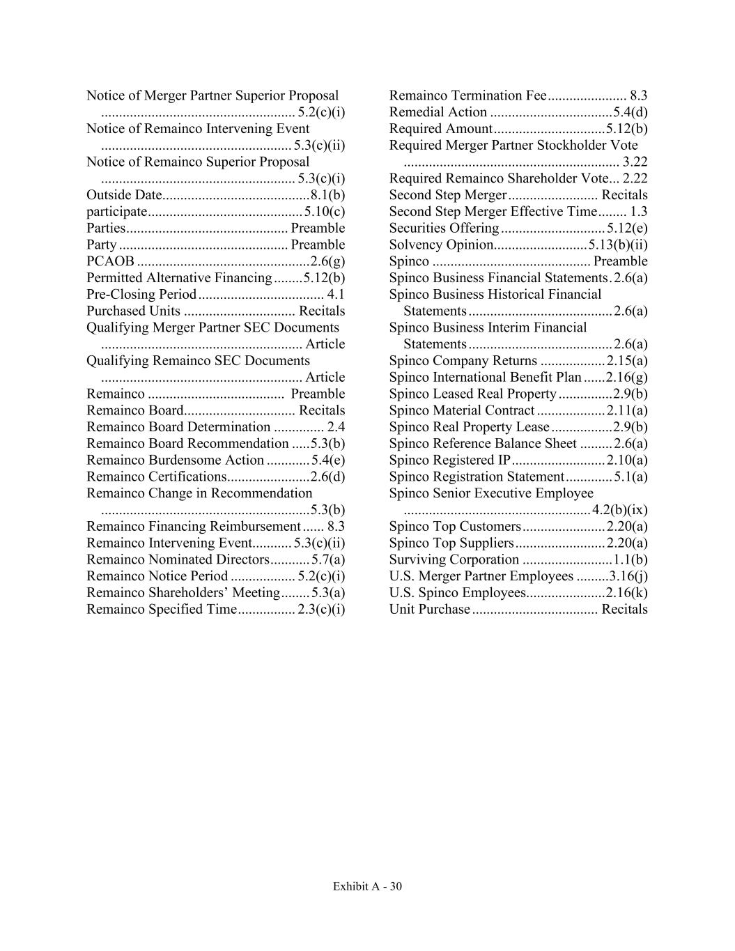 Exhibit A - 30 Notice of Merger Partner Superior Proposal ...................................................... 5.2(c)(i) Notice of Remainco Intervening Event ..................................................... 5.3(c)(ii) Notice of Remainco Superior Proposal ...................................................... 5.3(c)(i) Outside Date......................................... 8.1(b) participate ........................................... 5.10(c) Parties ............................................. Preamble Party ............................................... Preamble PCAOB ................................................ 2.6(g) Permitted Alternative Financing ........ 5.12(b) Pre-Closing Period ................................... 4.1 Purchased Units ............................... Recitals Qualifying Merger Partner SEC Documents ........................................................ Article Qualifying Remainco SEC Documents ........................................................ Article Remainco ...................................... Preamble Remainco Board............................... Recitals Remainco Board Determination .............. 2.4 Remainco Board Recommendation ..... 5.3(b) Remainco Burdensome Action ............ 5.4(e) Remainco Certifications....................... 2.6(d) Remainco Change in Recommendation .......................................................... 5.3(b) Remainco Financing Reimbursement ...... 8.3 Remainco Intervening Event........... 5.3(c)(ii) Remainco Nominated Directors ........... 5.7(a) Remainco Notice Period .................. 5.2(c)(i) Remainco Shareholders’ Meeting ........ 5.3(a) Remainco Specified Time ................ 2.3(c)(i) Remainco Termination Fee ...................... 8.3 Remedial Action .................................. 5.4(d) Required Amount ............................... 5.12(b) Required Merger Partner Stockholder Vote ............................................................ 3.22 Required Remainco Shareholder Vote ... 2.22 Second Step Merger ......................... Recitals Second Step Merger Effective Time ........ 1.3 Securities Offering ............................. 5.12(e) Solvency Opinion.......................... 5.13(b)(ii) Spinco ............................................ Preamble Spinco Business Financial Statements . 2.6(a) Spinco Business Historical Financial Statements ........................................ 2.6(a) Spinco Business Interim Financial Statements ........................................ 2.6(a) Spinco Company Returns .................. 2.15(a) Spinco International Benefit Plan ...... 2.16(g) Spinco Leased Real Property ............... 2.9(b) Spinco Material Contract ................... 2.11(a) Spinco Real Property Lease ................. 2.9(b) Spinco Reference Balance Sheet ......... 2.6(a) Spinco Registered IP .......................... 2.10(a) Spinco Registration Statement ............. 5.1(a) Spinco Senior Executive Employee .................................................... 4.2(b)(ix) Spinco Top Customers ....................... 2.20(a) Spinco Top Suppliers ......................... 2.20(a) Surviving Corporation ......................... 1.1(b) U.S. Merger Partner Employees ......... 3.16(j) U.S. Spinco Employees...................... 2.16(k) Unit Purchase ................................... Recitals