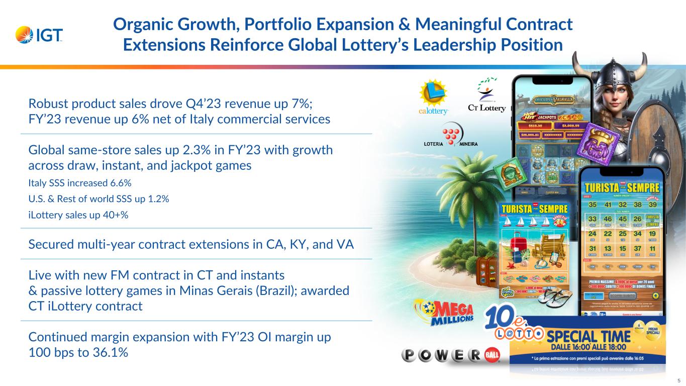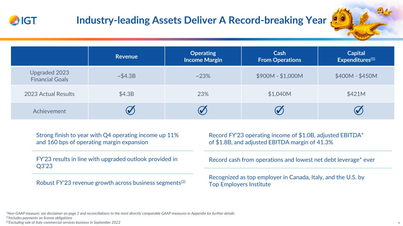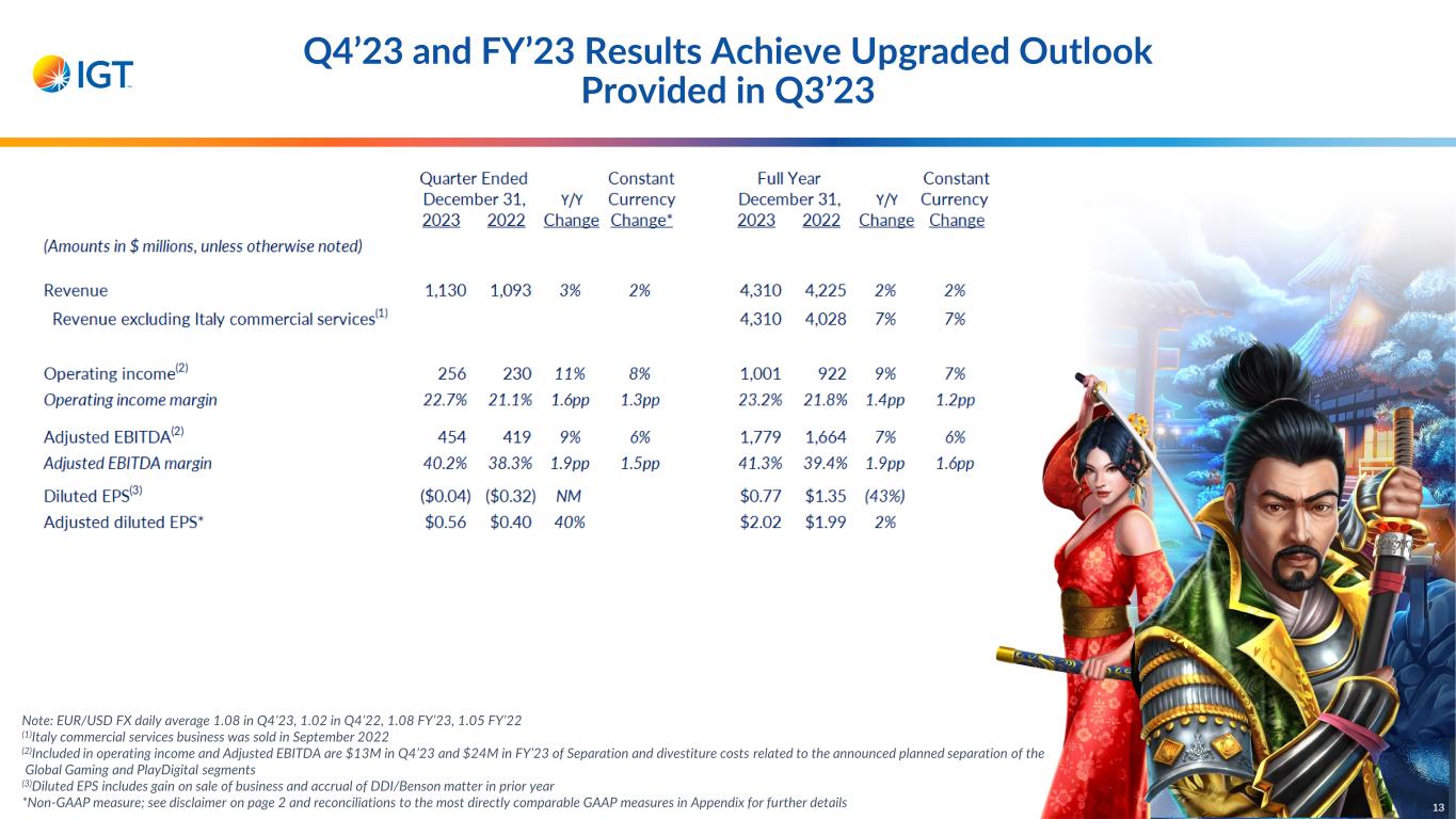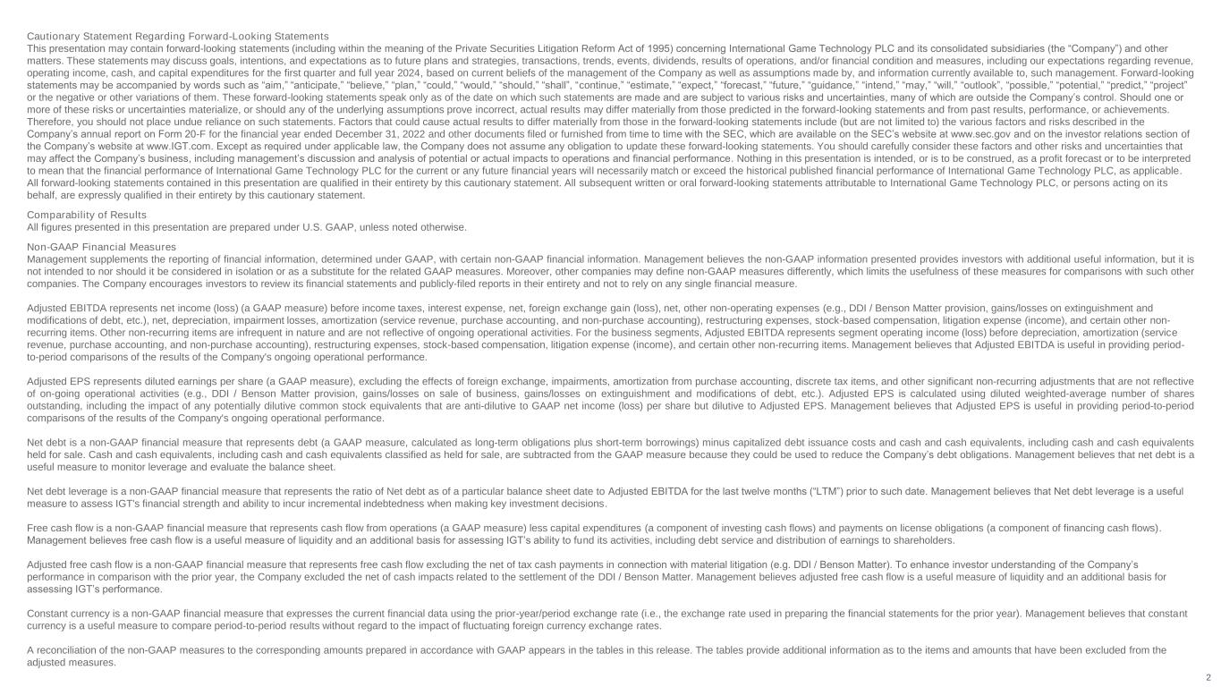 2 Cautionary Statement Regarding Forward-Looking Statements This presentation may contain forward-looking statements (including within the meaning of the Private Securities Litigation Reform Act of 1995) concerning International Game Technology PLC and its consolidated subsidiaries (the “Company”) and other matters. These statements may discuss goals, intentions, and expectations as to future plans and strategies, transactions, trends, events, dividends, results of operations, and/or financial condition and measures, including our expectations regarding revenue, operating income, cash, and capital expenditures for the first quarter and full year 2024, based on current beliefs of the management of the Company as well as assumptions made by, and information currently available to, such management. Forward-looking statements may be accompanied by words such as “aim,” “anticipate,” “believe,” “plan,” “could,” “would,” “should,” “shall”, “continue,” “estimate,” “expect,” “forecast,” “future,” “guidance,” “intend,” “may,” “will,” “outlook”, “possible,” “potential,” “predict,” “project” or the negative or other variations of them. These forward-looking statements speak only as of the date on which such statements are made and are subject to various risks and uncertainties, many of which are outside the Company’s control. Should one or more of these risks or uncertainties materialize, or should any of the underlying assumptions prove incorrect, actual results may differ materially from those predicted in the forward-looking statements and from past results, performance, or achievements. Therefore, you should not place undue reliance on such statements. Factors that could cause actual results to differ materially from those in the forward-looking statements include (but are not limited to) the various factors and risks described in the Company’s annual report on Form 20-F for the financial year ended December 31, 2022 and other documents filed or furnished from time to time with the SEC, which are available on the SEC’s website at www.sec.gov and on the investor relations section of the Company’s website at www.IGT.com. Except as required under applicable law, the Company does not assume any obligation to update these forward-looking statements. You should carefully consider these factors and other risks and uncertainties that may affect the Company’s business, including management’s discussion and analysis of potential or actual impacts to operations and financial performance. Nothing in this presentation is intended, or is to be construed, as a profit forecast or to be interpreted to mean that the financial performance of International Game Technology PLC for the current or any future financial years will necessarily match or exceed the historical published financial performance of International Game Technology PLC, as applicable. All forward-looking statements contained in this presentation are qualified in their entirety by this cautionary statement. All subsequent written or oral forward-looking statements attributable to International Game Technology PLC, or persons acting on its behalf, are expressly qualified in their entirety by this cautionary statement. Comparability of Results All figures presented in this presentation are prepared under U.S. GAAP, unless noted otherwise. Non-GAAP Financial Measures Management supplements the reporting of financial information, determined under GAAP, with certain non-GAAP financial information. Management believes the non-GAAP information presented provides investors with additional useful information, but it is not intended to nor should it be considered in isolation or as a substitute for the related GAAP measures. Moreover, other companies may define non-GAAP measures differently, which limits the usefulness of these measures for comparisons with such other companies. The Company encourages investors to review its financial statements and publicly-filed reports in their entirety and not to rely on any single financial measure. Adjusted EBITDA represents net income (loss) (a GAAP measure) before income taxes, interest expense, net, foreign exchange gain (loss), net, other non-operating expenses (e.g., DDI / Benson Matter provision, gains/losses on extinguishment and modifications of debt, etc.), net, depreciation, impairment losses, amortization (service revenue, purchase accounting, and non-purchase accounting), restructuring expenses, stock-based compensation, litigation expense (income), and certain other non- recurring items. Other non-recurring items are infrequent in nature and are not reflective of ongoing operational activities. For the business segments, Adjusted EBITDA represents segment operating income (loss) before depreciation, amortization (service revenue, purchase accounting, and non-purchase accounting), restructuring expenses, stock-based compensation, litigation expense (income), and certain other non-recurring items. Management believes that Adjusted EBITDA is useful in providing period- to-period comparisons of the results of the Company's ongoing operational performance. Adjusted EPS represents diluted earnings per share (a GAAP measure), excluding the effects of foreign exchange, impairments, amortization from purchase accounting, discrete tax items, and other significant non-recurring adjustments that are not reflective of on-going operational activities (e.g., DDI / Benson Matter provision, gains/losses on sale of business, gains/losses on extinguishment and modifications of debt, etc.). Adjusted EPS is calculated using diluted weighted-average number of shares outstanding, including the impact of any potentially dilutive common stock equivalents that are anti-dilutive to GAAP net income (loss) per share but dilutive to Adjusted EPS. Management believes that Adjusted EPS is useful in providing period-to-period comparisons