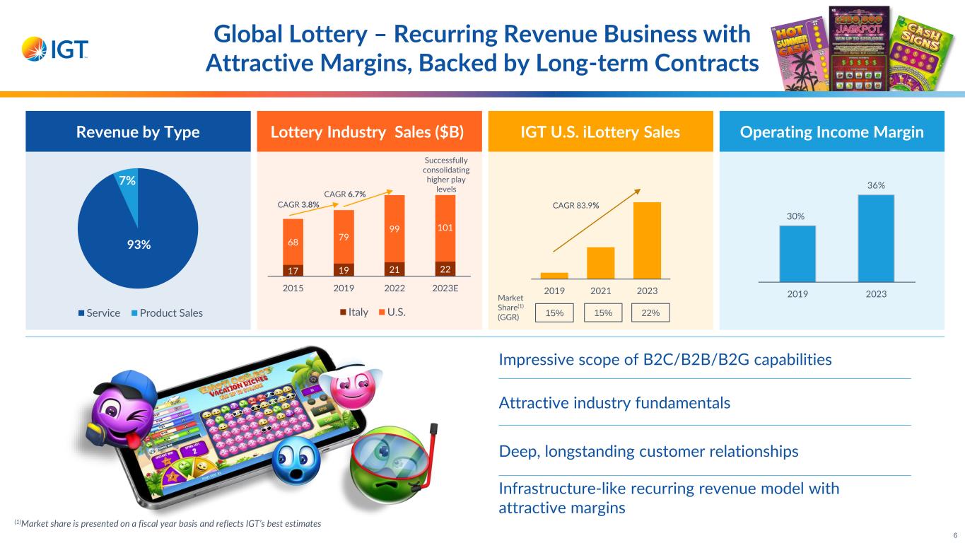 Robust product sales drove Q4’23 revenue up 7%; FY’23 revenue up 6% net of Italy commercial services Global same-store sales up 2.3% in FY’23 with growth across draw, instant, and jackpot games Italy SSS increased 6.6% U.S. & Rest of world SSS up 1.2% iLottery sales up 40+% Secured multi-year contract extensions in CA, KY, and VA Live with new FM contract in CT and instants & passive lottery games in Minas Gerais (Brazil); awarded CT iLottery contract Continued margin expansion with FY’23 OI margin up 100 bps to 36.1% Organic Growth, Portfolio Expansion & Meaningful Contract Extensions Reinforce Global Lottery’s Leadership Position 5