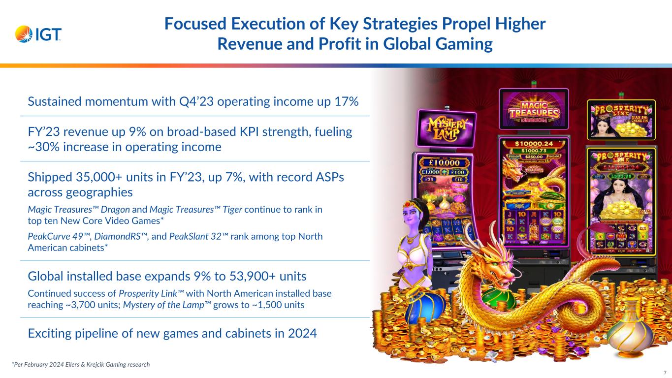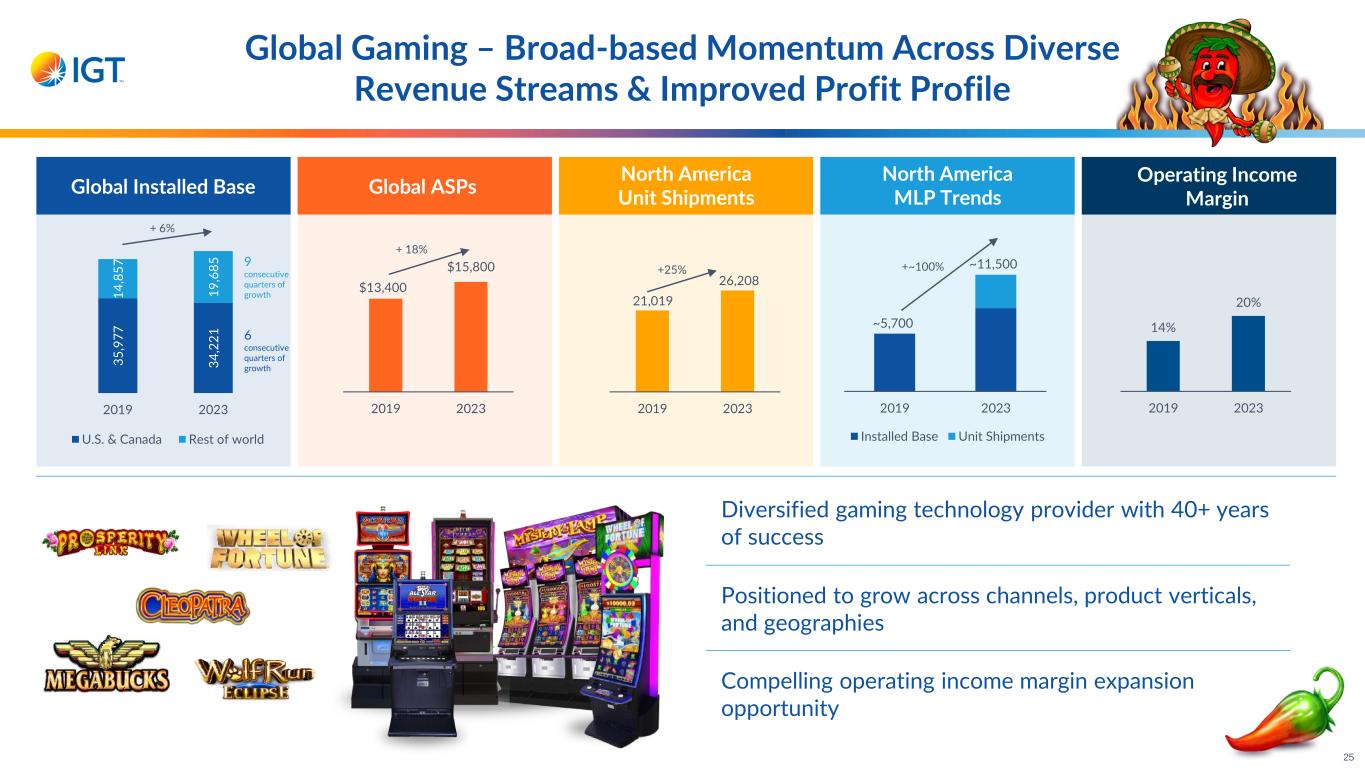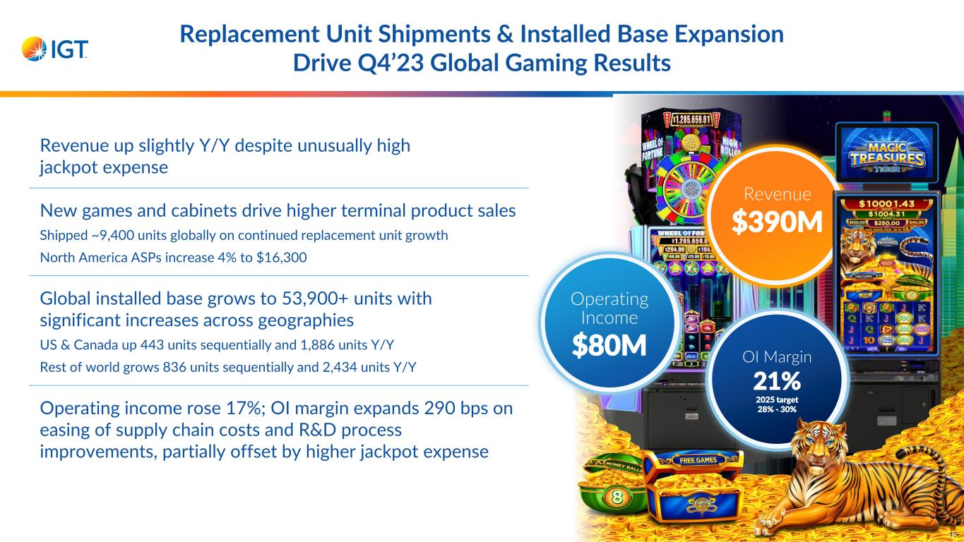 Replacement Unit Shipments & Installed Base Expansion Drive Q4’23 Global Gaming Results Revenue up slightly Y/Y despite unusually high jackpot expense New games and cabinets drive higher terminal product sales Shipped ~9,400 units globally on continued replacement unit growth North America ASPs increase 4% to $16,300 Global installed base grows to 53,900+ units with significant increases across geographies US & Canada up 443 units sequentially and 1,886 units Y/Y Rest of world grows 836 units sequentially and 2,434 units Y/Y Operating income rose 17%; OI margin expands 290 bps on easing of supply chain costs and R&D process improvements, partially offset by higher jackpot expense Revenue $390M OI Margin 21% 2025 target 28% - 30% Operating Income $80M 15