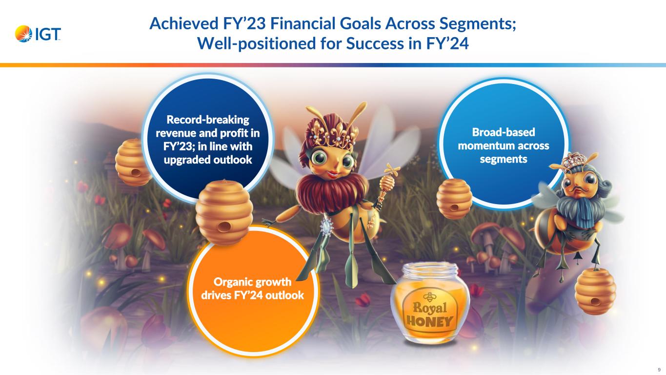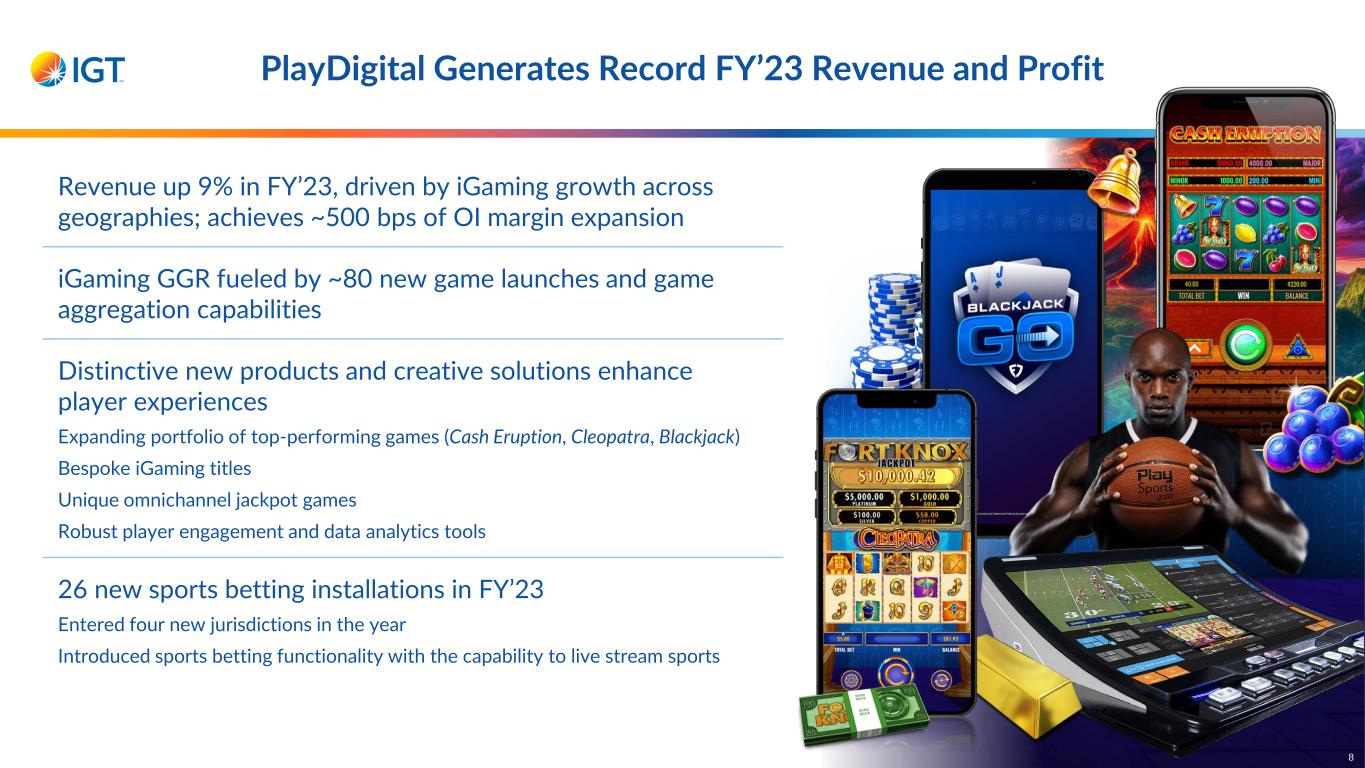 PlayDigital Generates Record FY’23 Revenue and Profit Revenue up 9% in FY’23, driven by iGaming growth across geographies; achieves ~500 bps of OI margin expansion iGaming GGR fueled by ~80 new game launches and game aggregation capabilities Distinctive new products and creative solutions enhance player experiences Expanding portfolio of top-performing games (Cash Eruption, Cleopatra, Blackjack) Bespoke iGaming titles Unique omnichannel jackpot games Robust player engagement and data analytics tools 26 new sports betting installations in FY’23 Entered four new jurisdictions in the year Introduced sports betting functionality with the capability to live stream sports 8